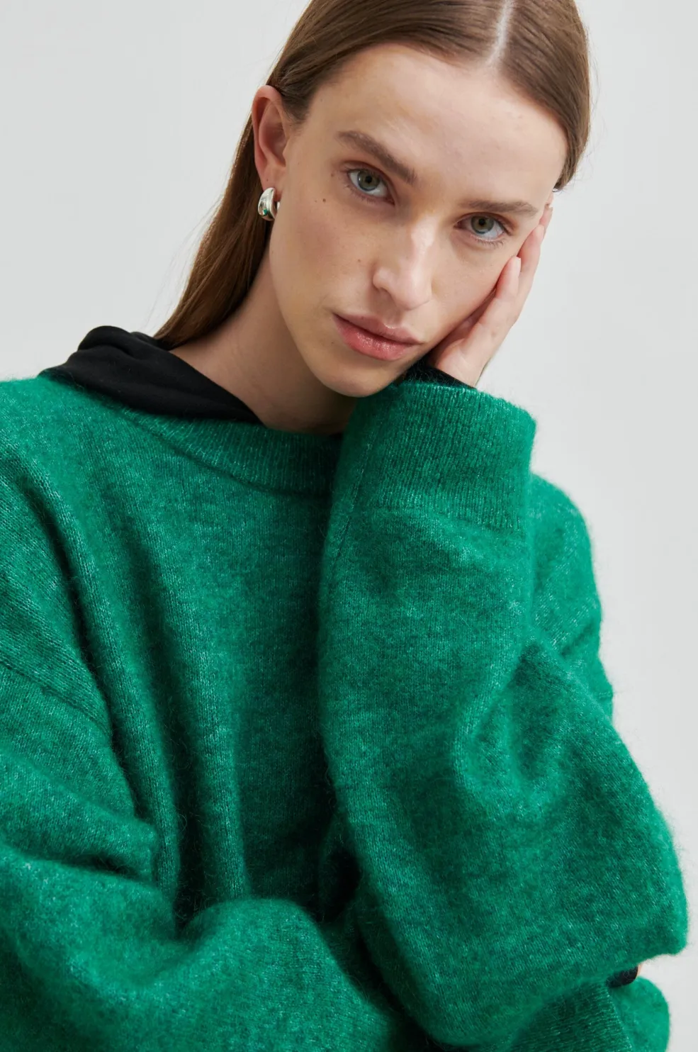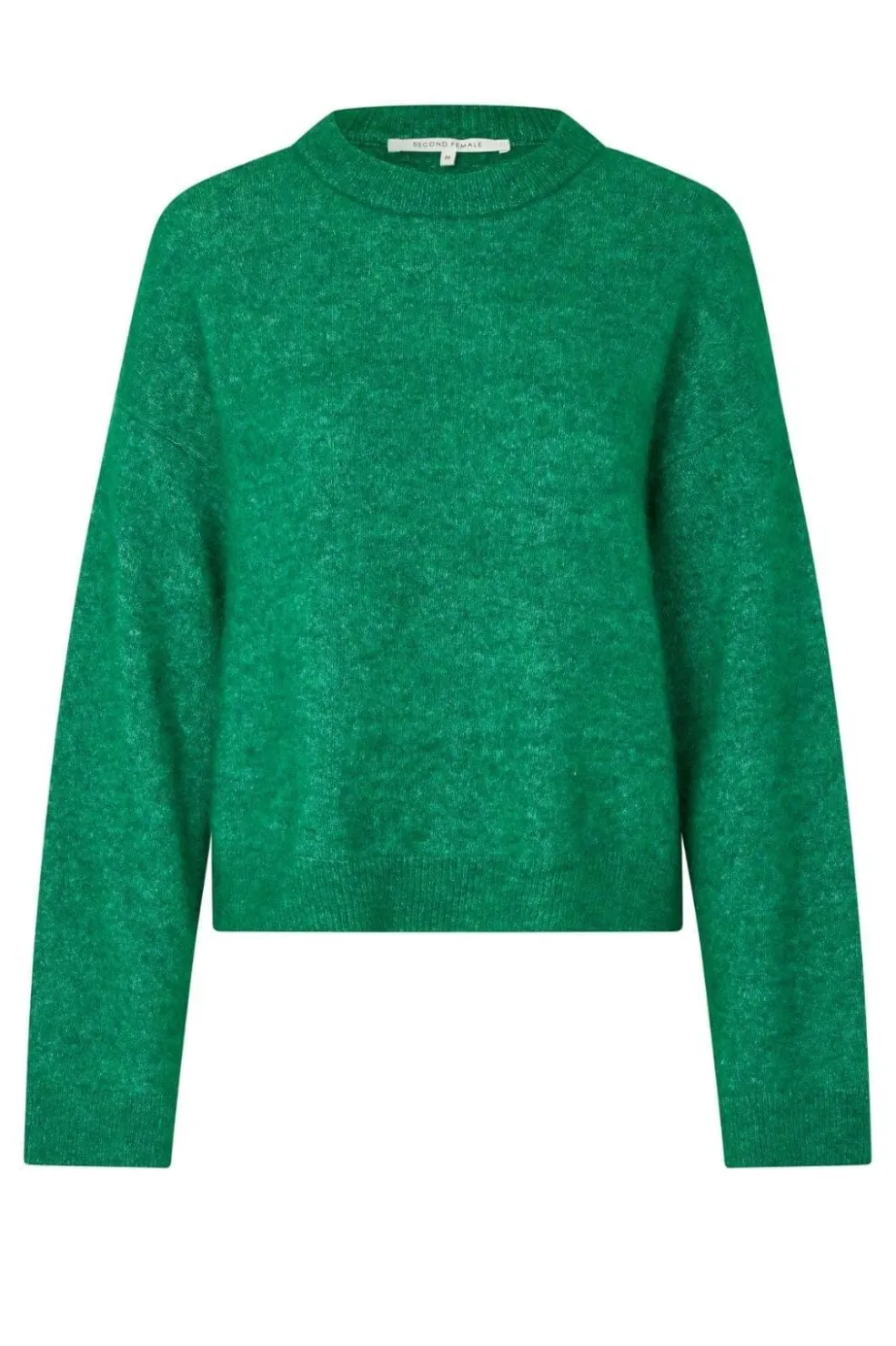 Grøn striktrøje fra Second Female, lavet af en blanding af mohair, uld, polyamid og elastan. Trøjen har en oversized pasform med drop shoulder-design og rund halsudskæring.