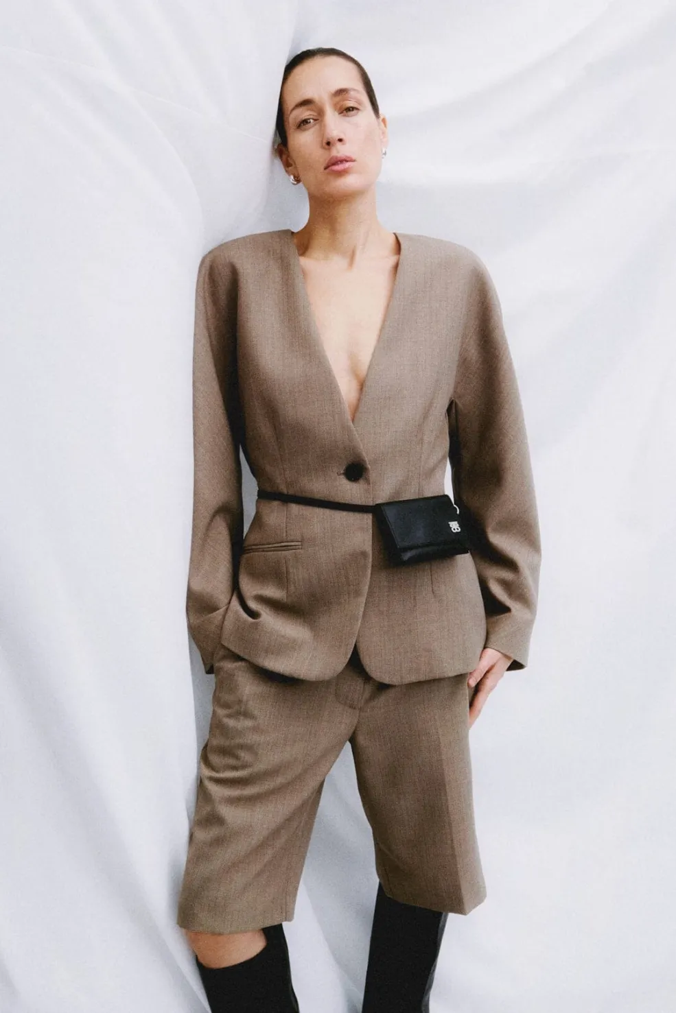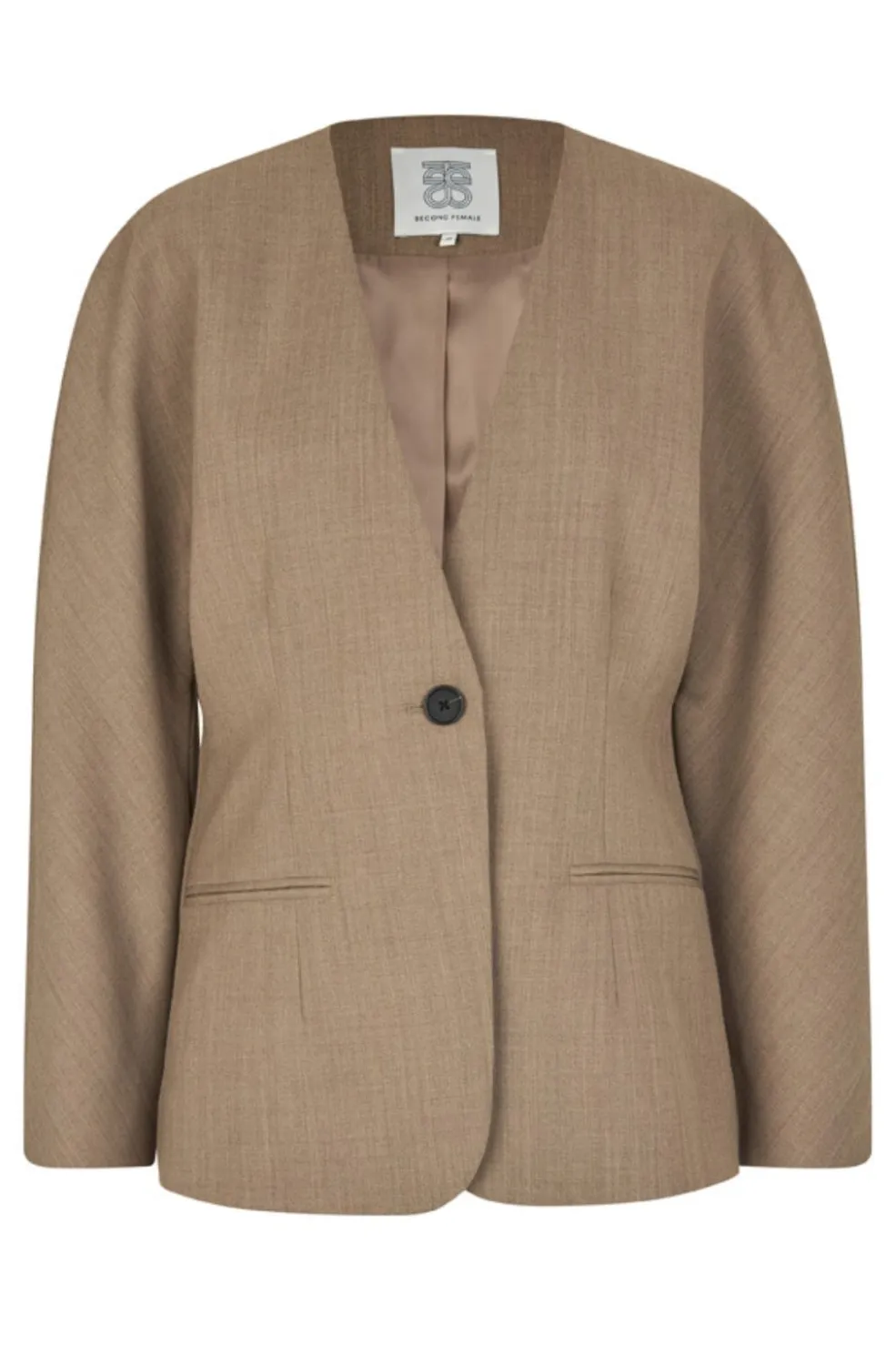 Brun meleret blazer fra Second Female med V-udskæring og knaplukning. Den har en regulær pasform og lange ærmer, der giver den et klassisk snit.