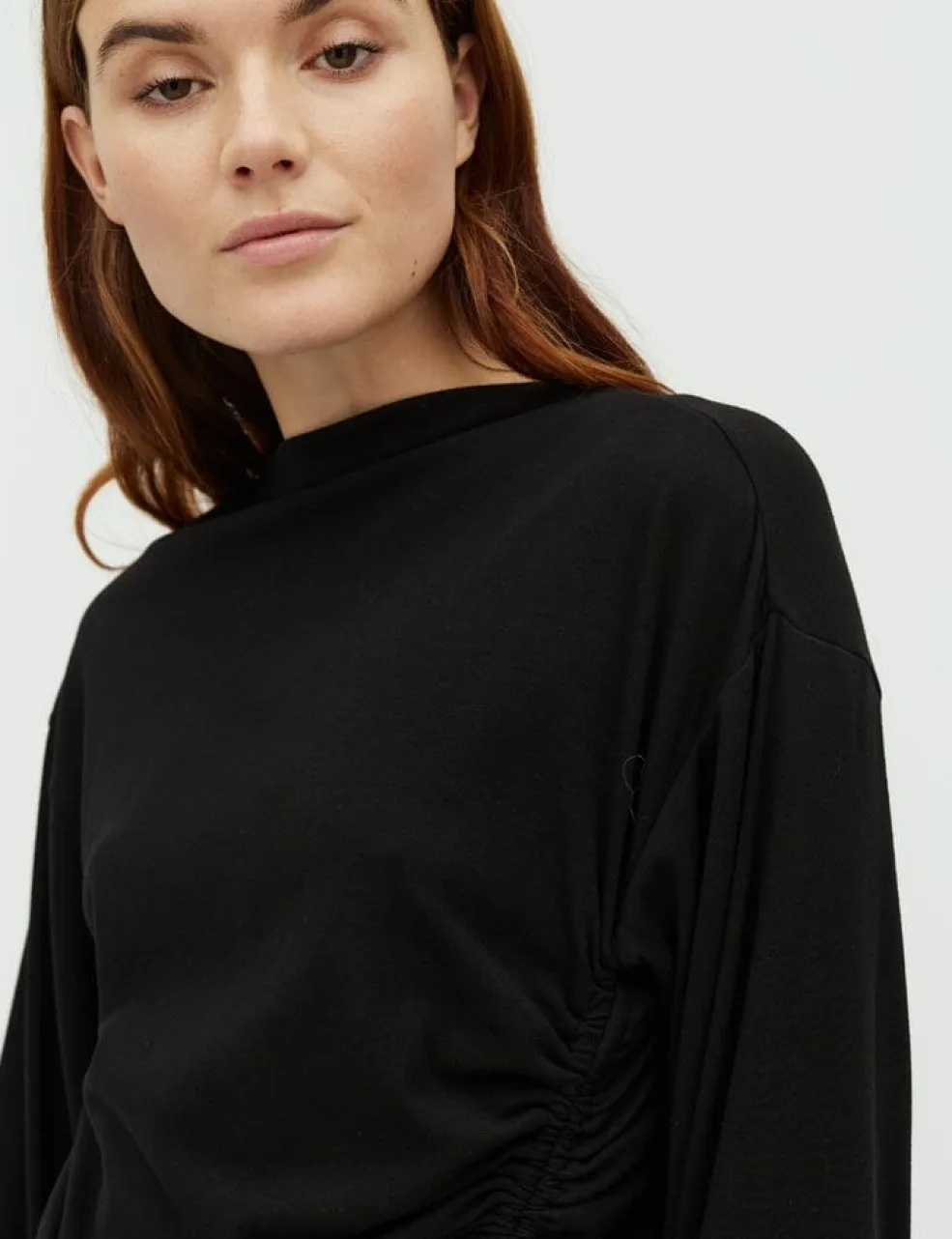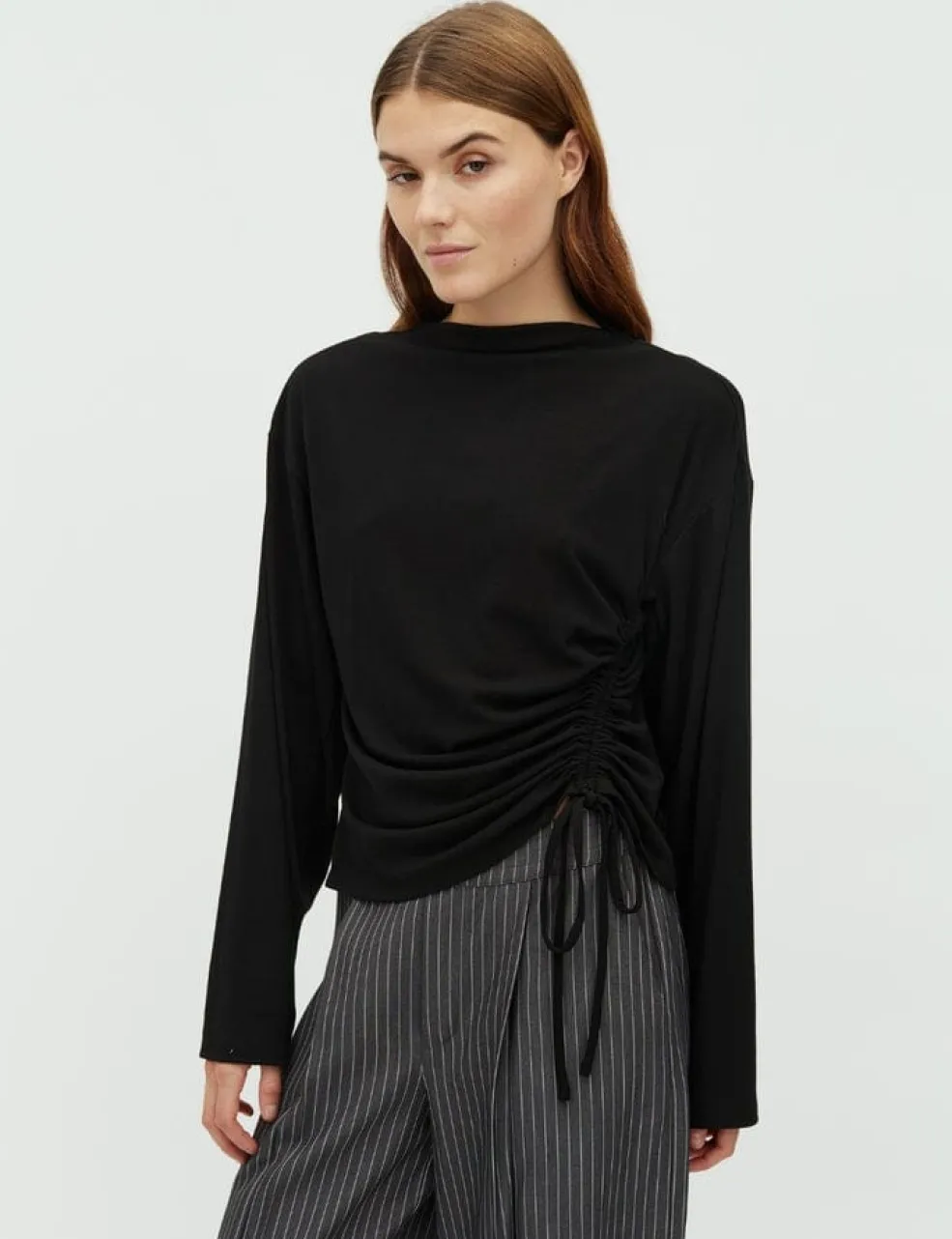 Sort top fra MbyM med lange ærmer og høj hals. Toppen har bindebånd i siden og flæsedetaljer.