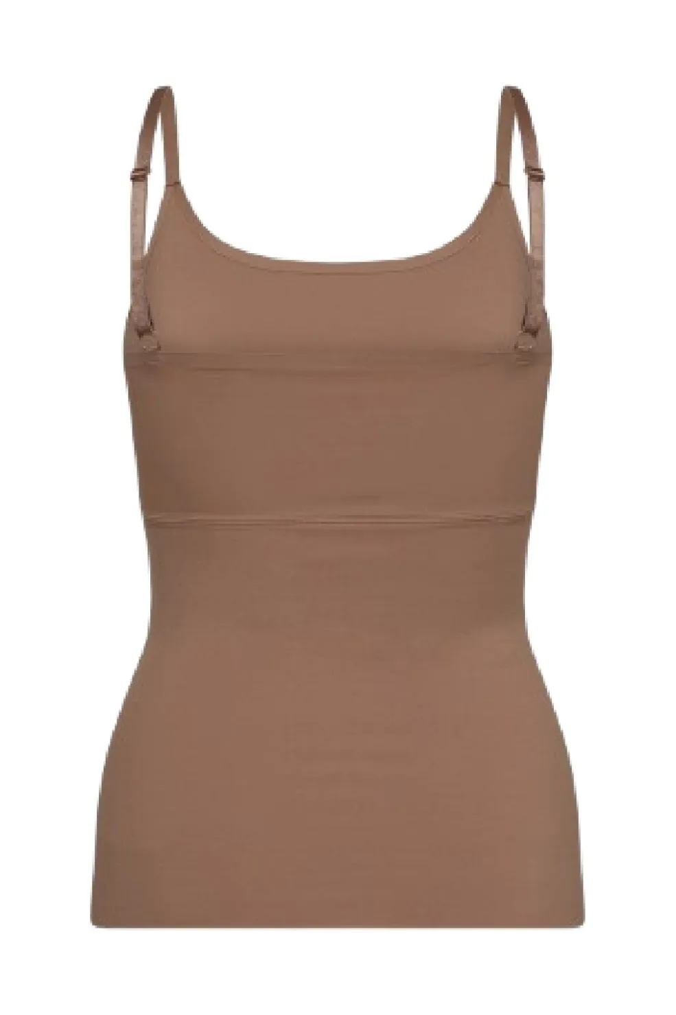 Brun shapewear-top fra Decoy med glat, sømløs overflade og tynde, justerbare stropper. Toppen har en tætsiddende pasform og en rund halsudskæring.