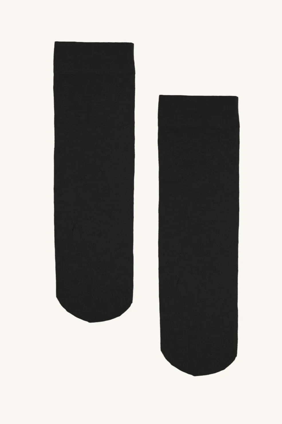 Sorte knæstrømper fra Wolford med transparent rudemønster. Strømperne har en elastisk kant i toppen og et gennemsigtigt mønster, der går fra ankel til knæ.