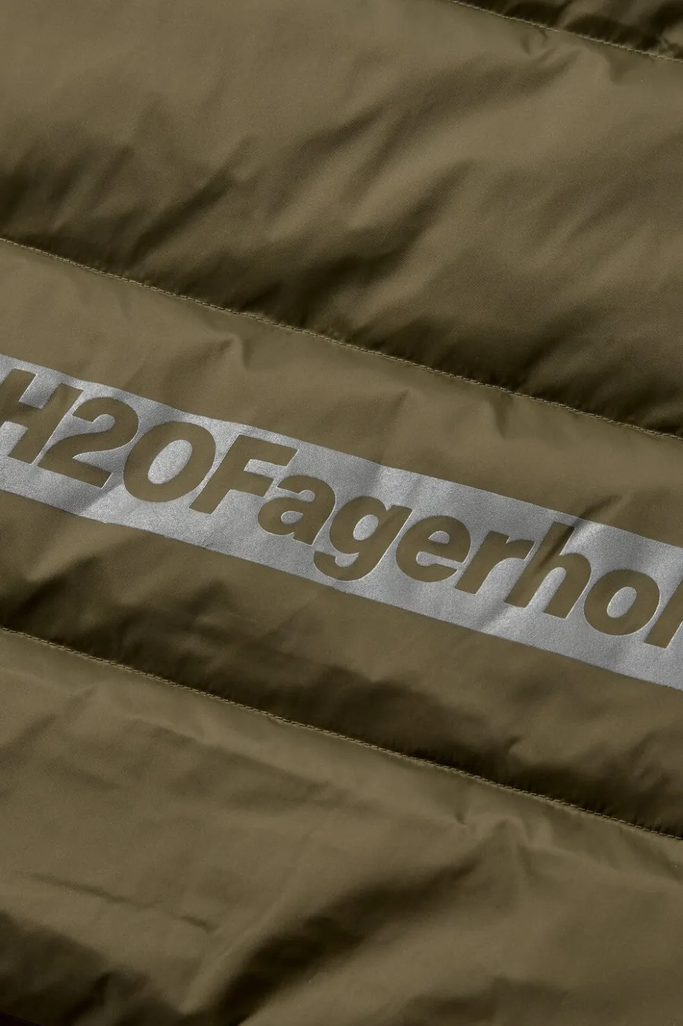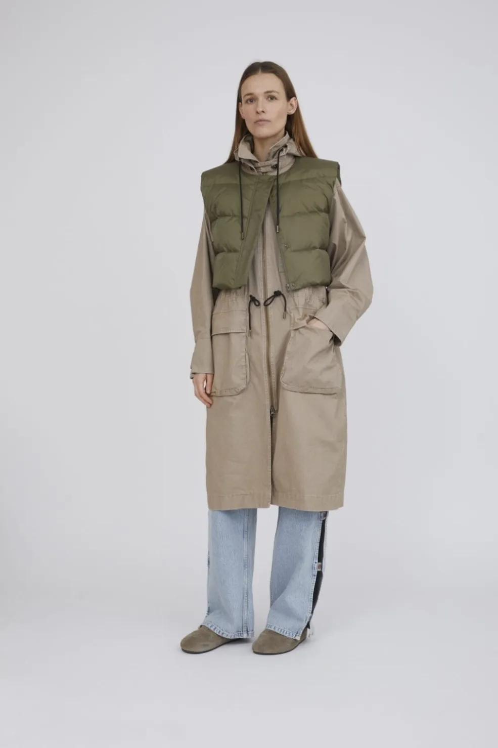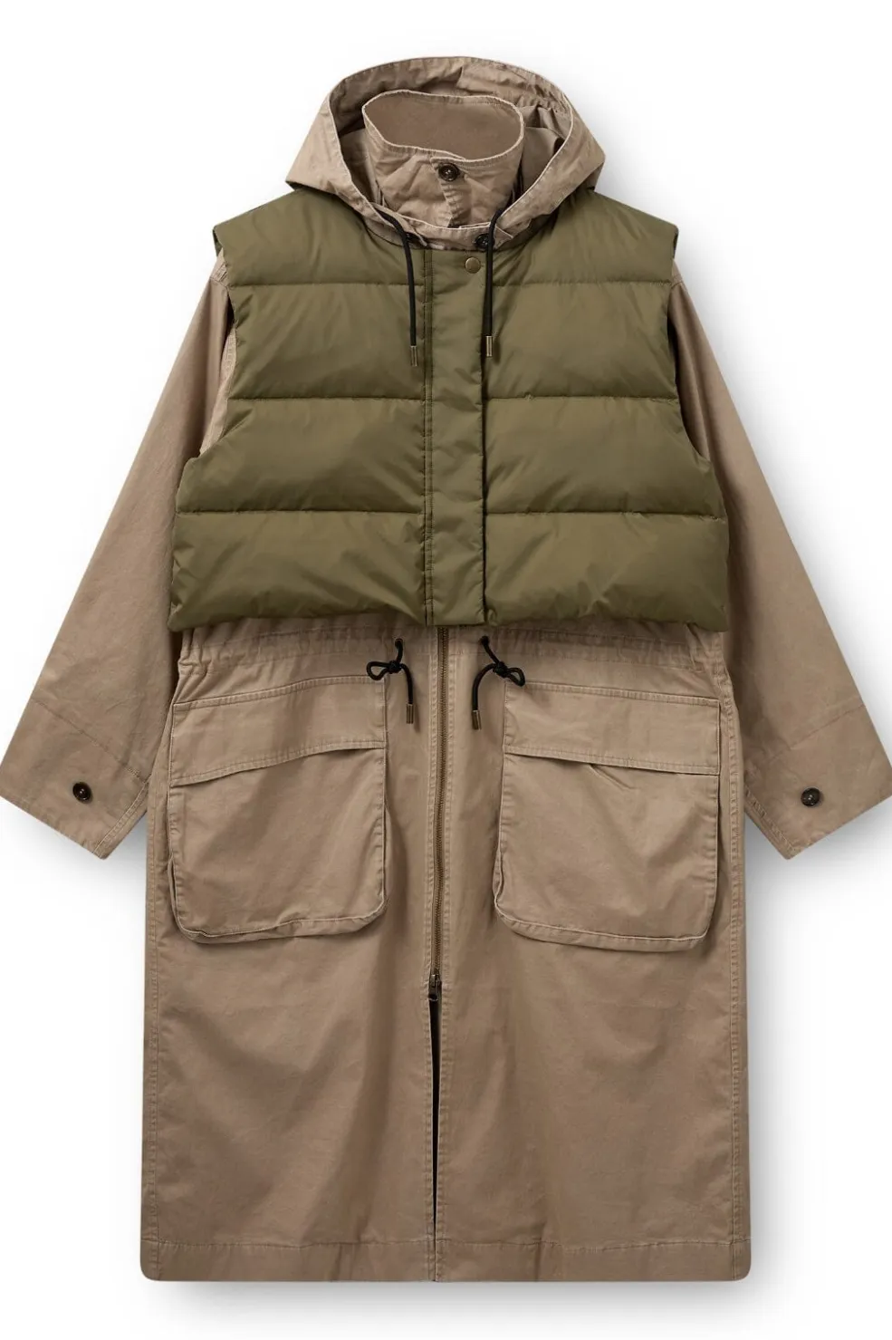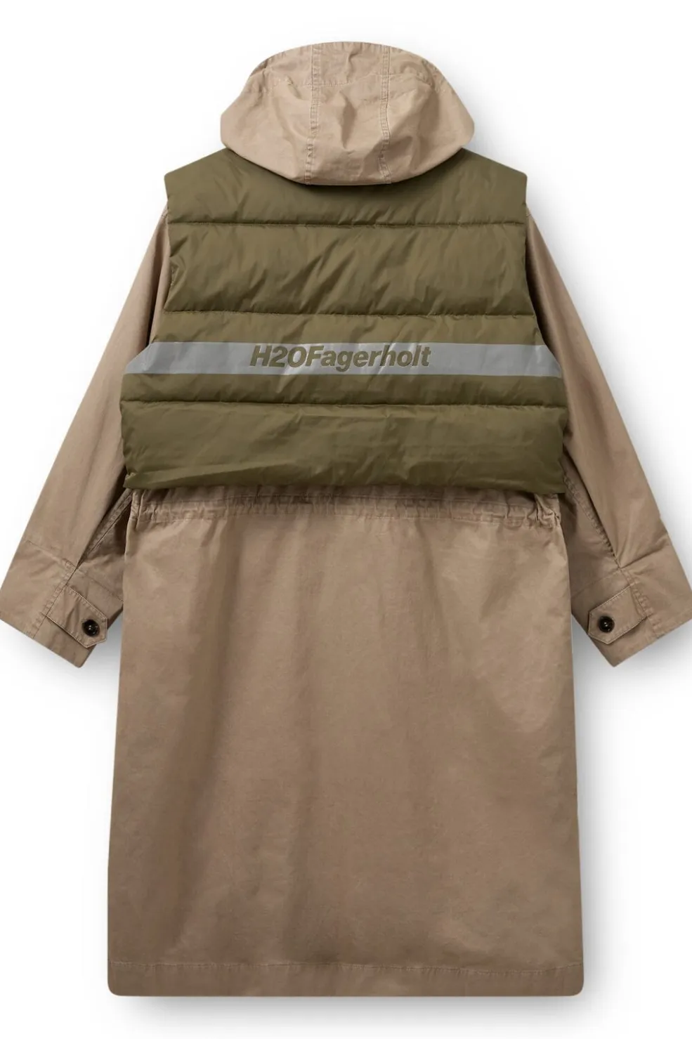 Frakke fra H2O Fagerholt i sand og mørkegrøn mos. En praktisk frakke med aftagelig puffervest og store lommer, der kombinerer to designs i ét.