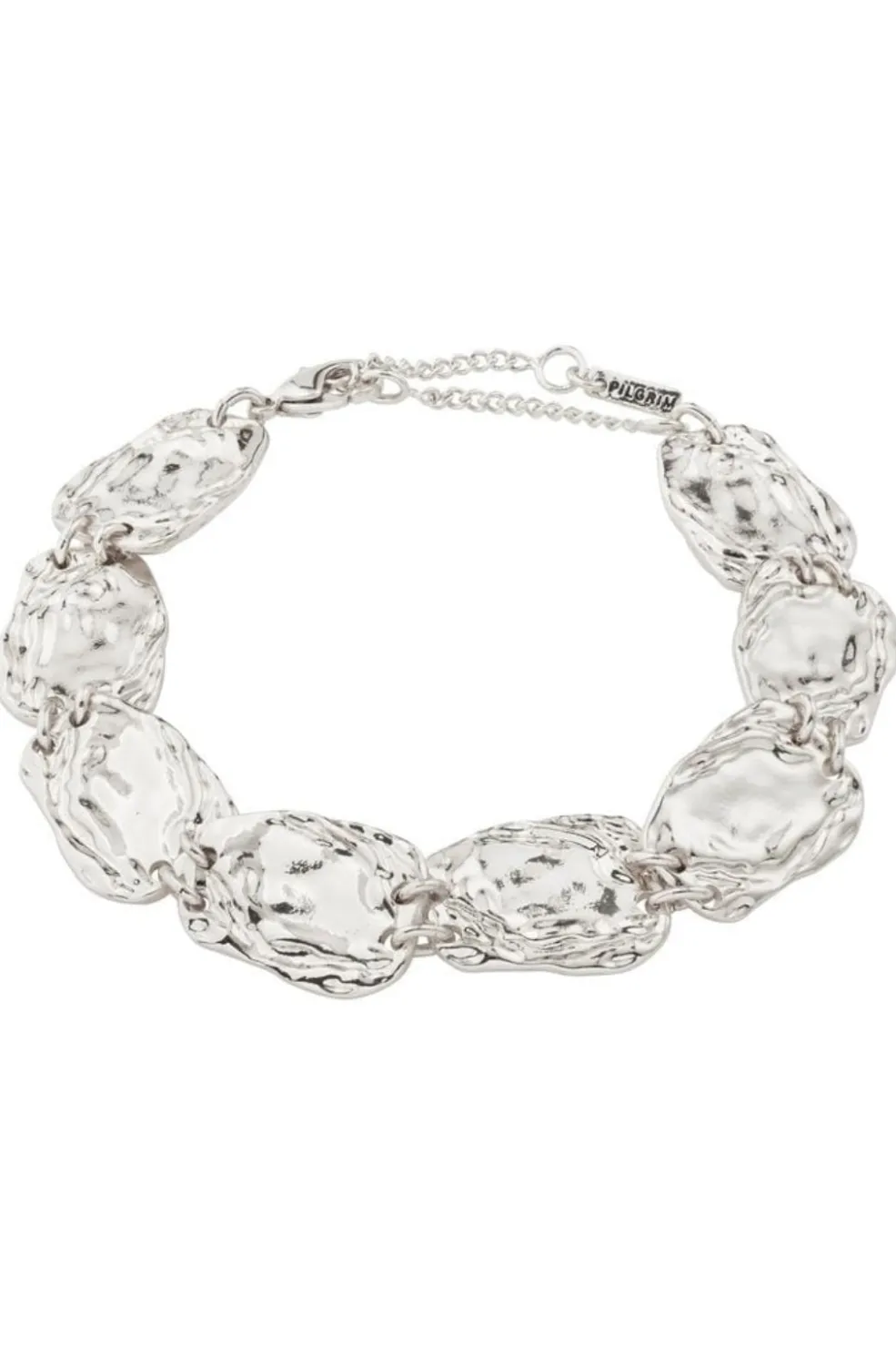 Sølvbelagt armbånd fra Pilgrim med sammenkædede elementer og en rå, struktureret overflade. De organisk formede led har en håndlavet fornemmelse.