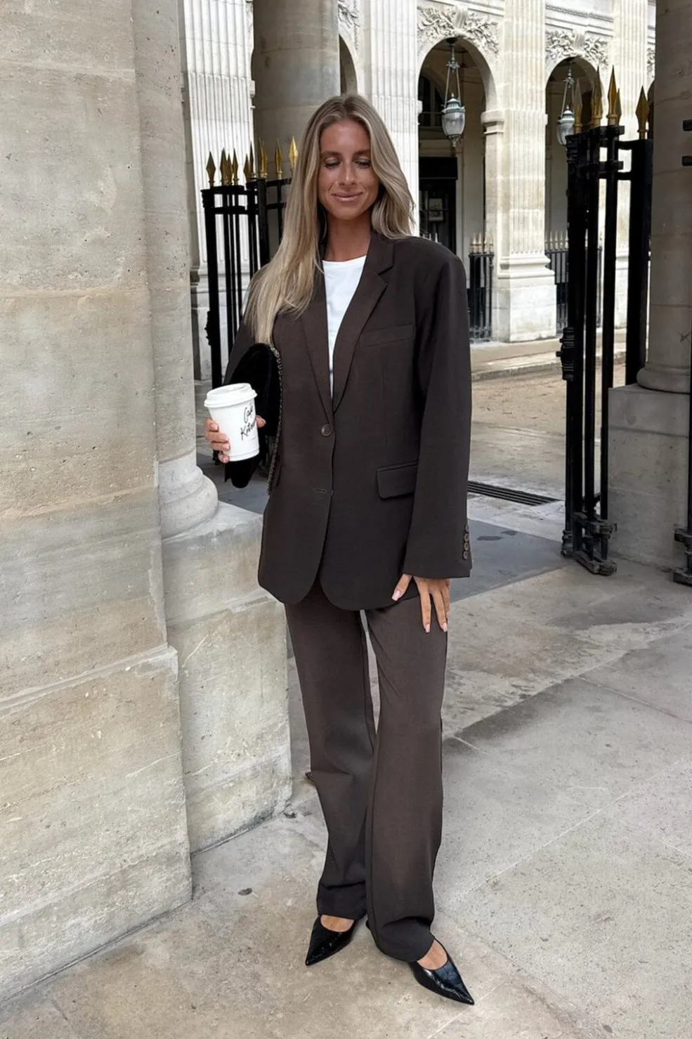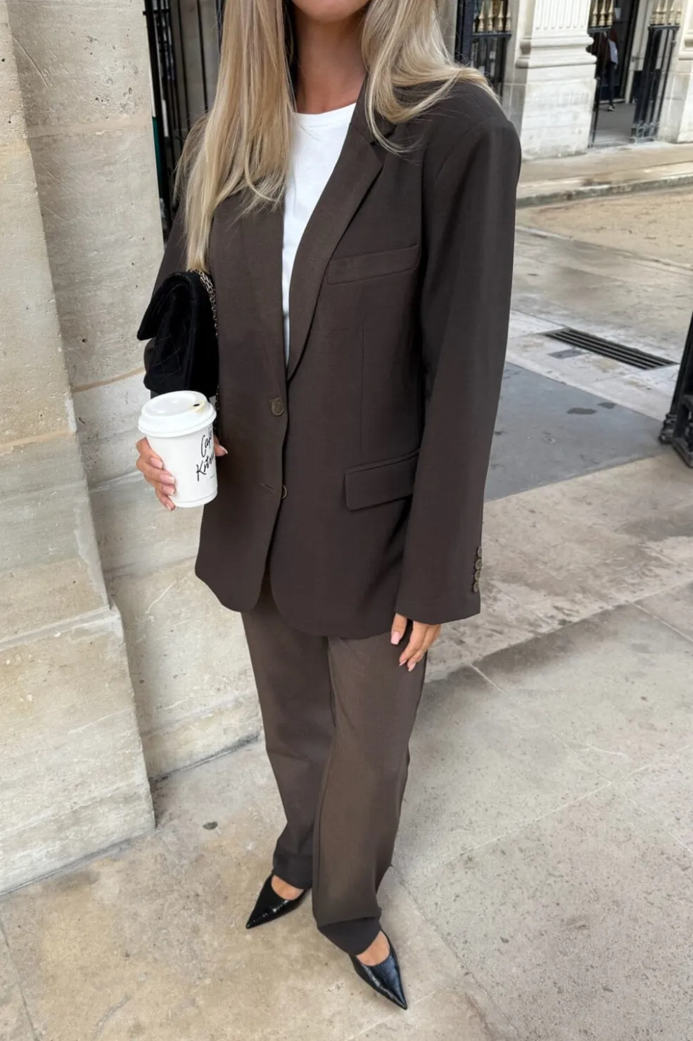 Mørkebrun blazer fra BYIC med V-hals og lige pasform. Den har en enkelt knap foran, lommer på begge sider og en brystlomme på venstre side.