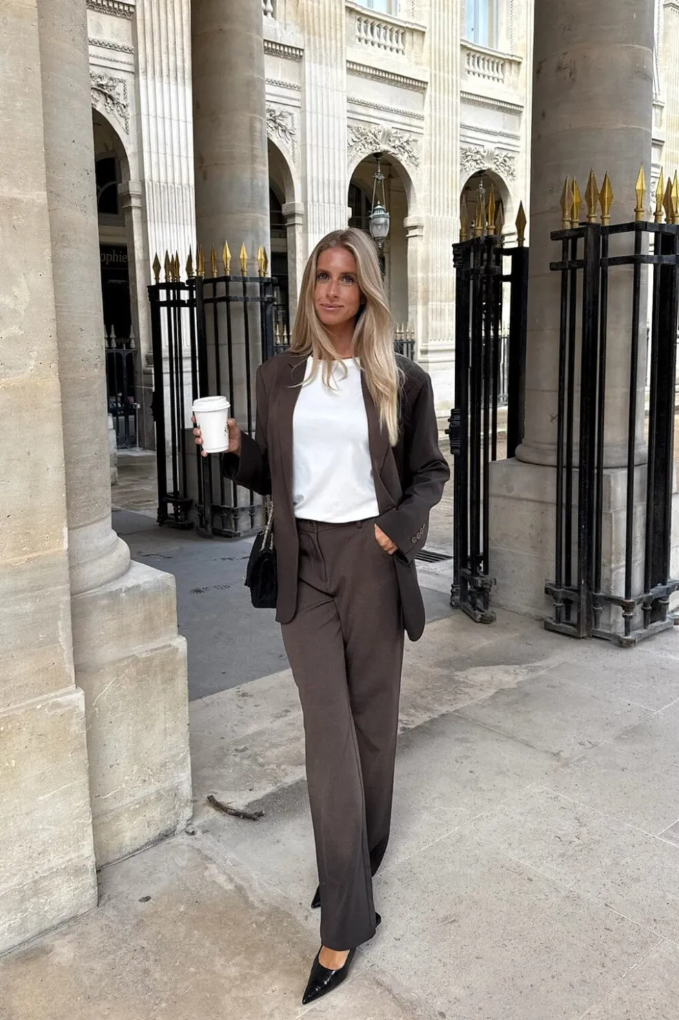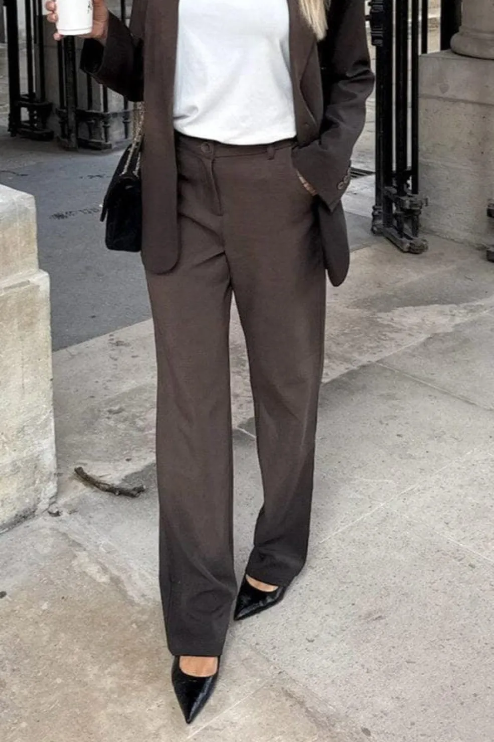 Mørkebrune bukser fra BYIC med lige snit og høj talje. Bukserne har bæltestropper i taljen samt knap- og lynlåslukning foran.