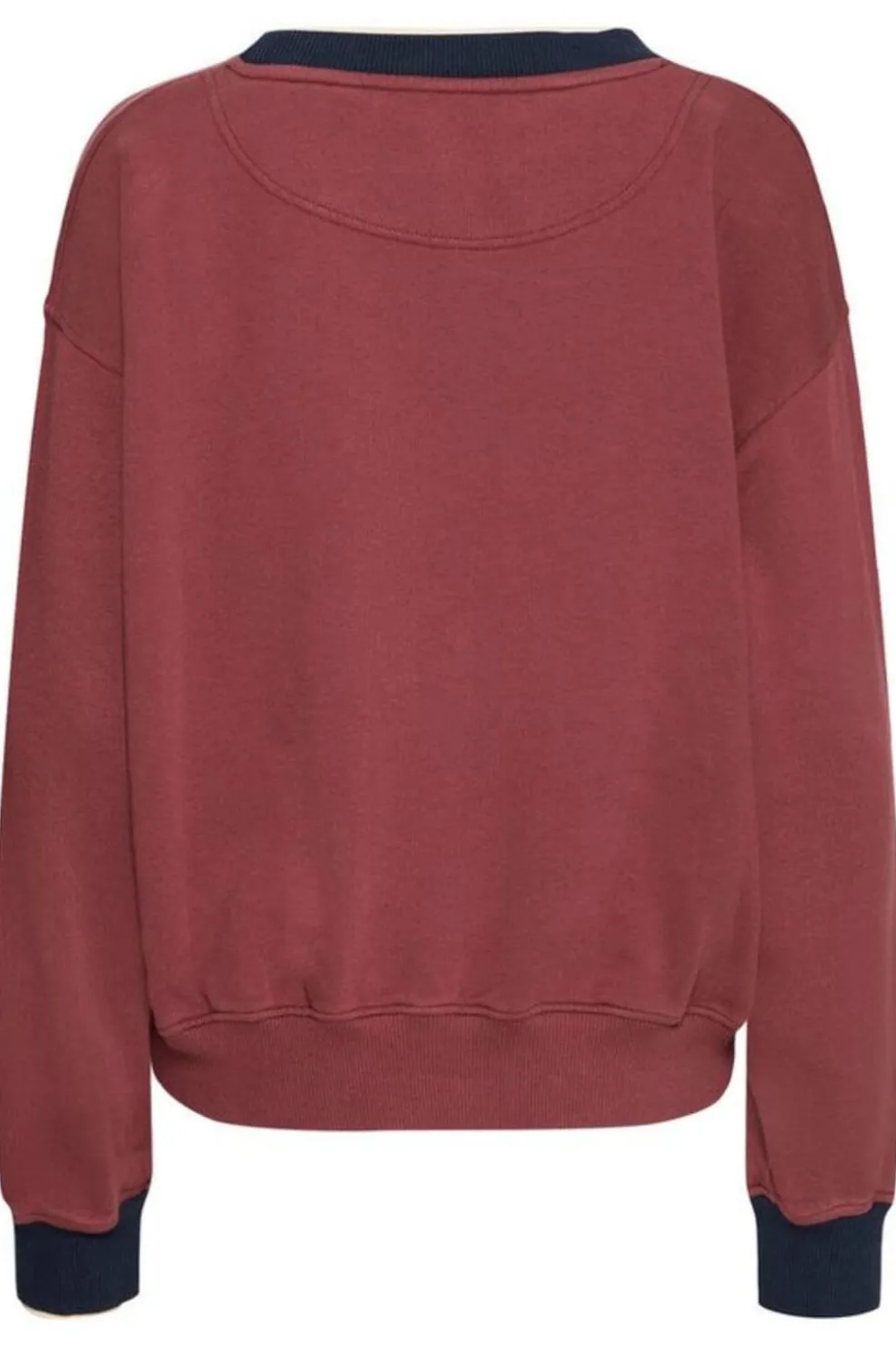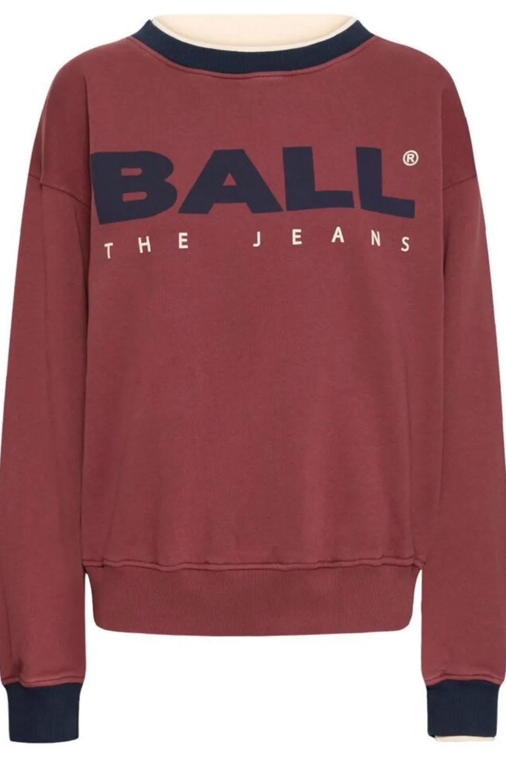 Sweatshirt fra Ball i en dyb rødbrun nuance med stort BALL THE JEANS logo på forsiden. Designet har kontrastfarvede manchetter og halsudskæring.