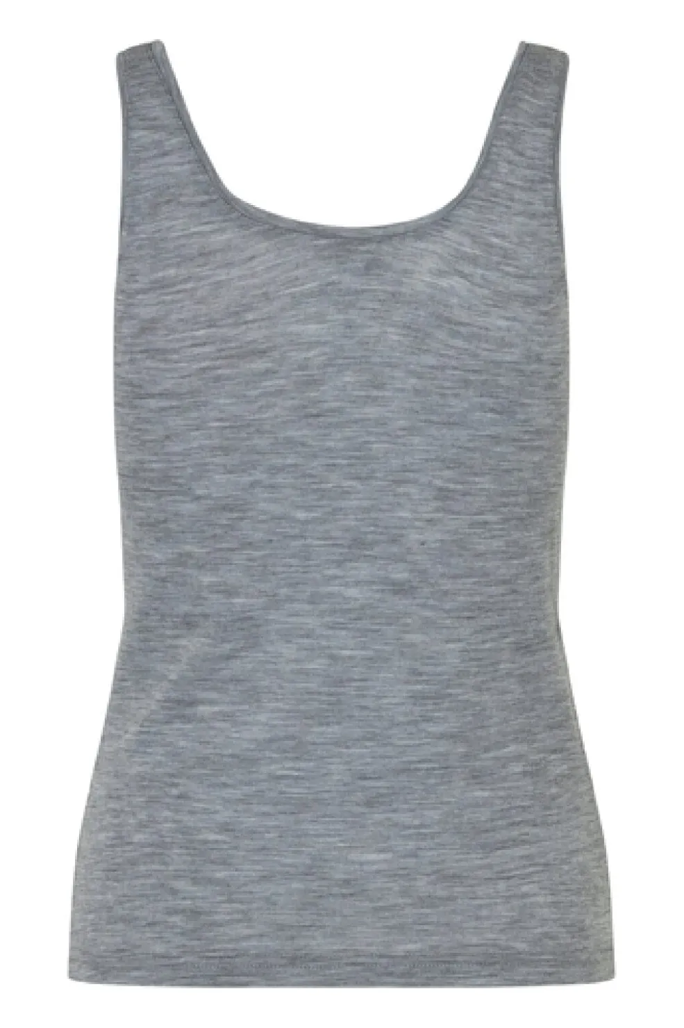 Grå melange tanktop fra MbyM i merinould. En tætsiddende top med rund hals og brede stropper, der har en blød og behagelig fornemmelse mod huden.