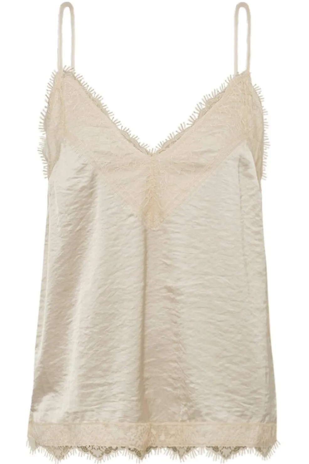 Cremefarvet top fra Gossia med V-udskæring og tynde stropper. Toppen har blondekant ved halsudskæringen og kanten. Den lette top passer til både hverdag og fest.