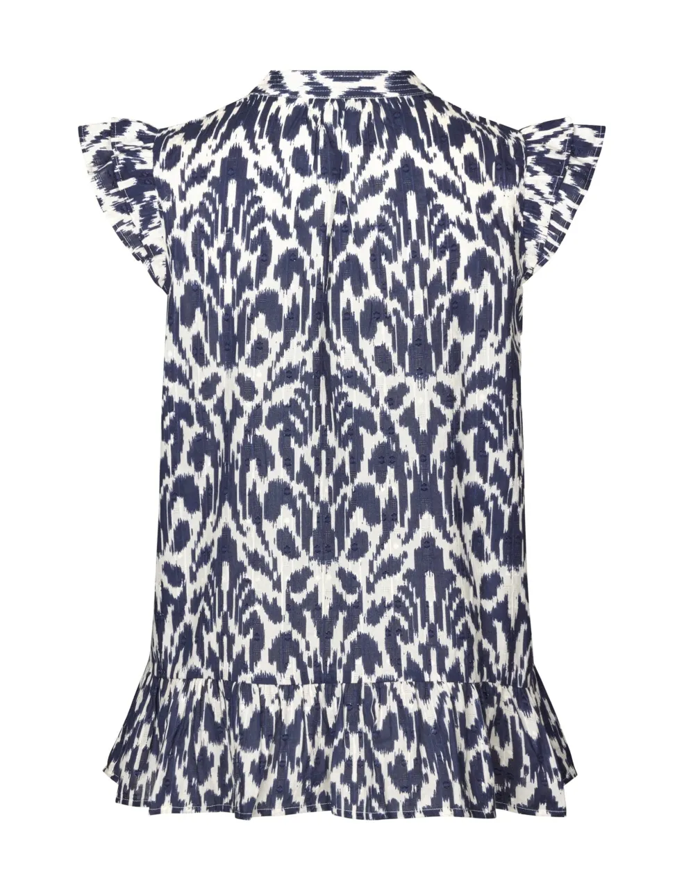 Bluse fra MbyM i mørkeblå og hvid med ikat-inspireret print. Den har flæsedetaljer ved ærmerne og en v-udskæring med knapper foran.