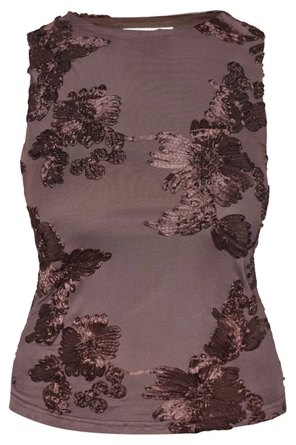Brun top fra Sisters Point, lavet af en polyester-elastanblanding. Toppen har broderede blomstermotiver og er uden ærmer.