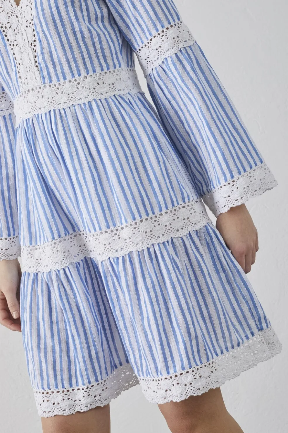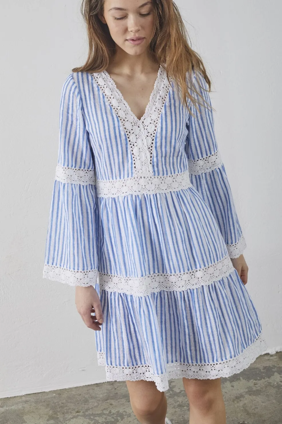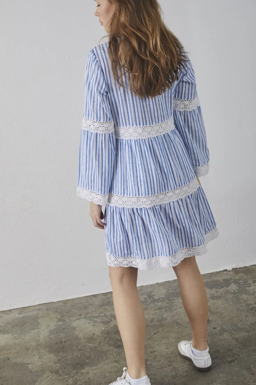 Stribet kjole fra Sisters Point med blå og hvide striber. Kjolen har blondedetaljer ved ærmerne og langs bunden, som giver et maritimt og feminint udtryk.