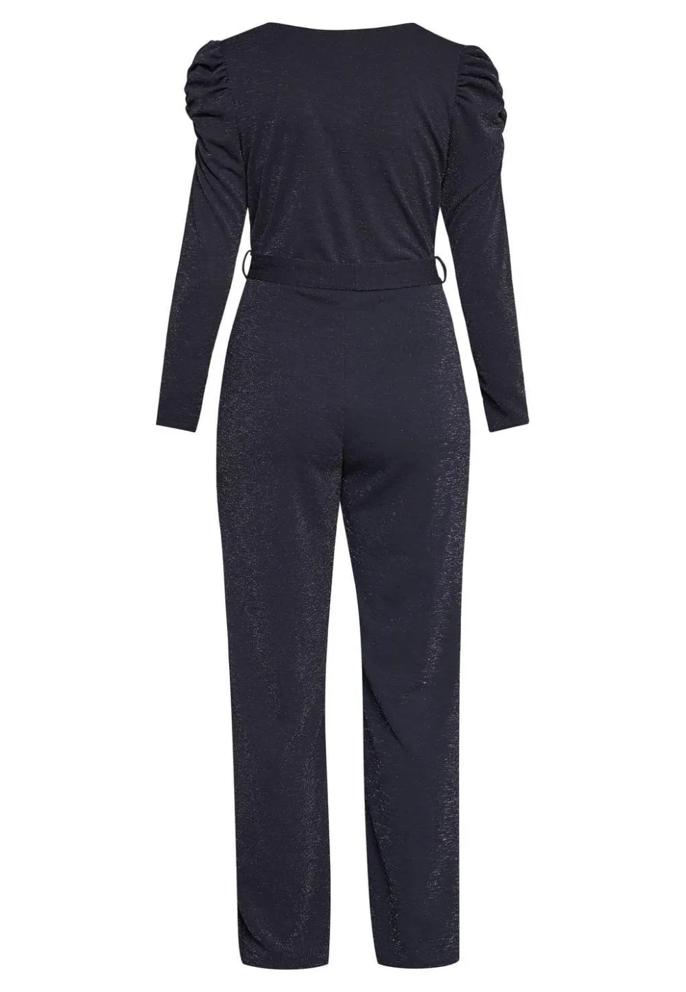 Sort buksedragt fra Sisters Point med sølvglimmer-effekt. Den har V-udskæring, pufærmer med rynkede detaljer ved skuldrene og bindebånd i taljen.