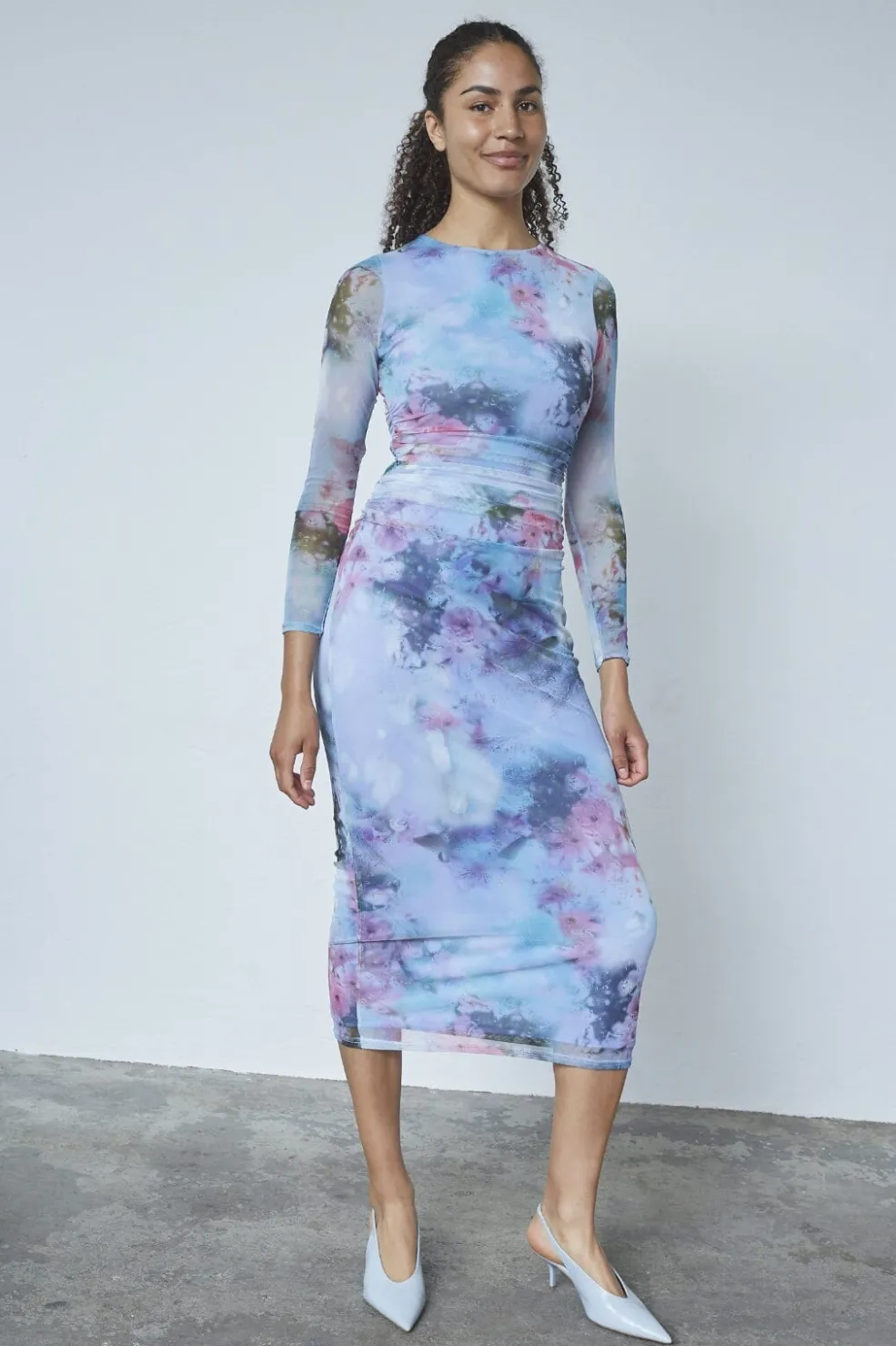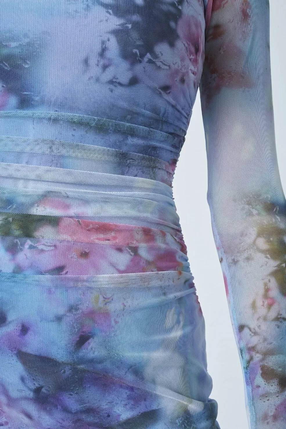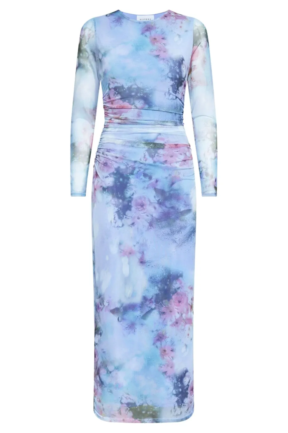 Meshkjole fra Sisters Point med tie-dye mønster i blå, pink og grønne nuancer. Kjolen har lange ærmer, rund hals og rynkedetaljer i taljen.