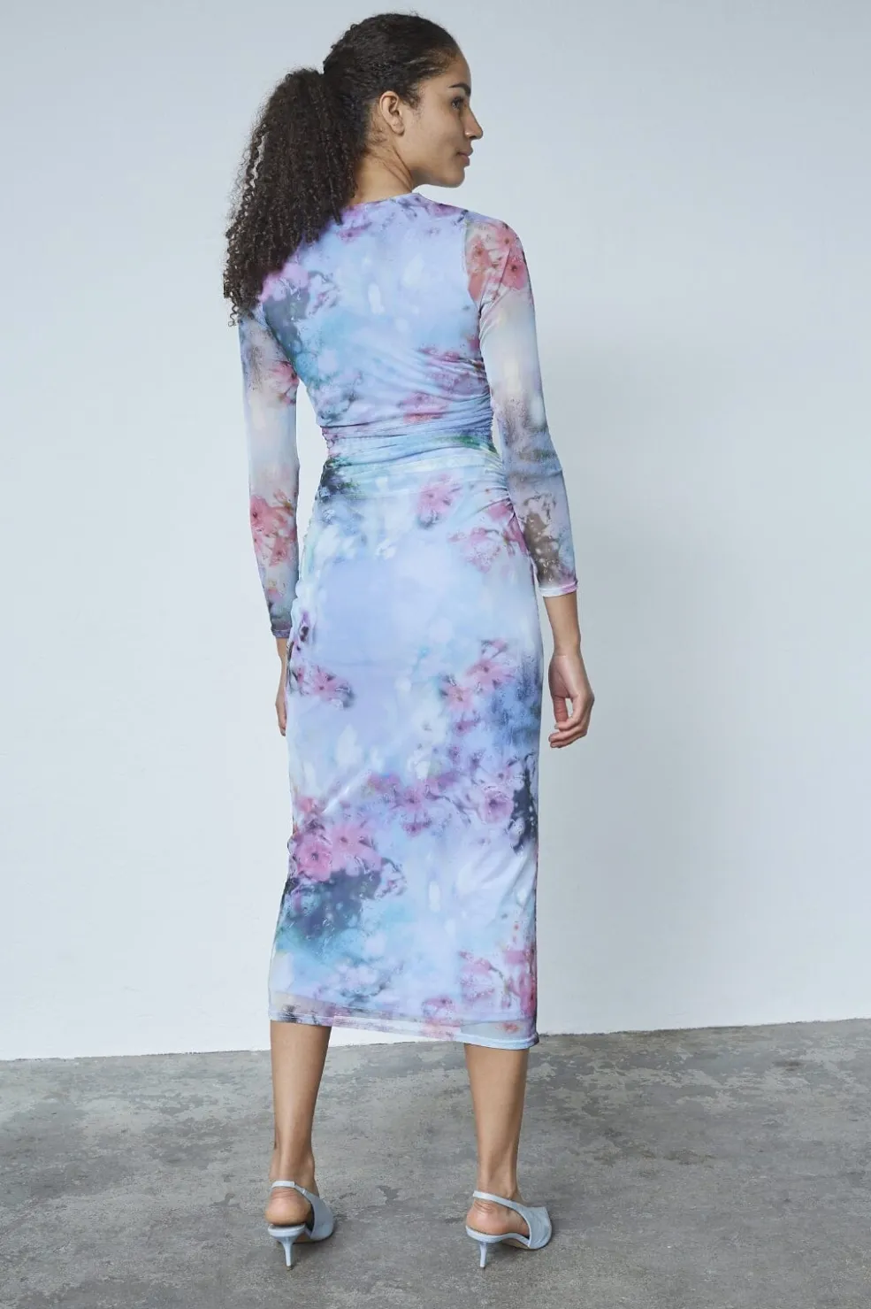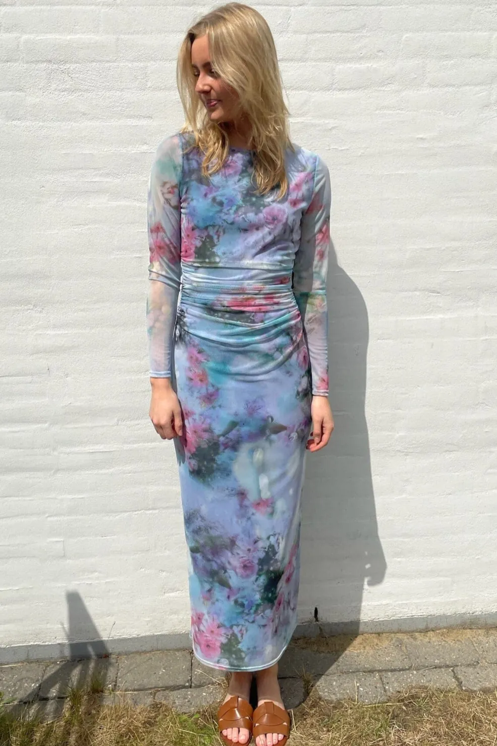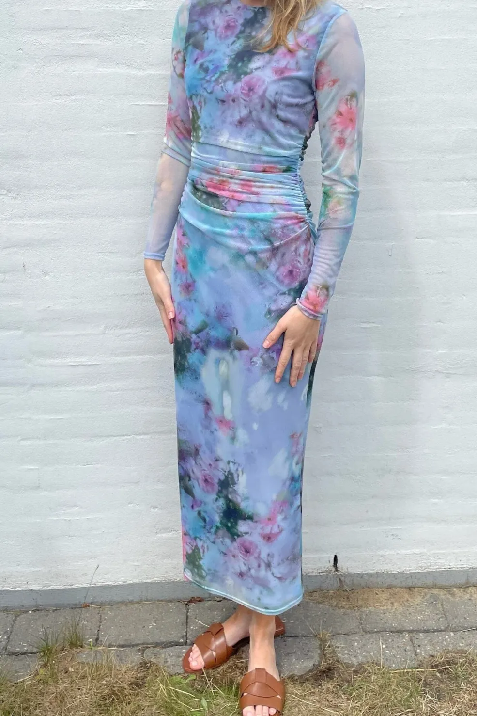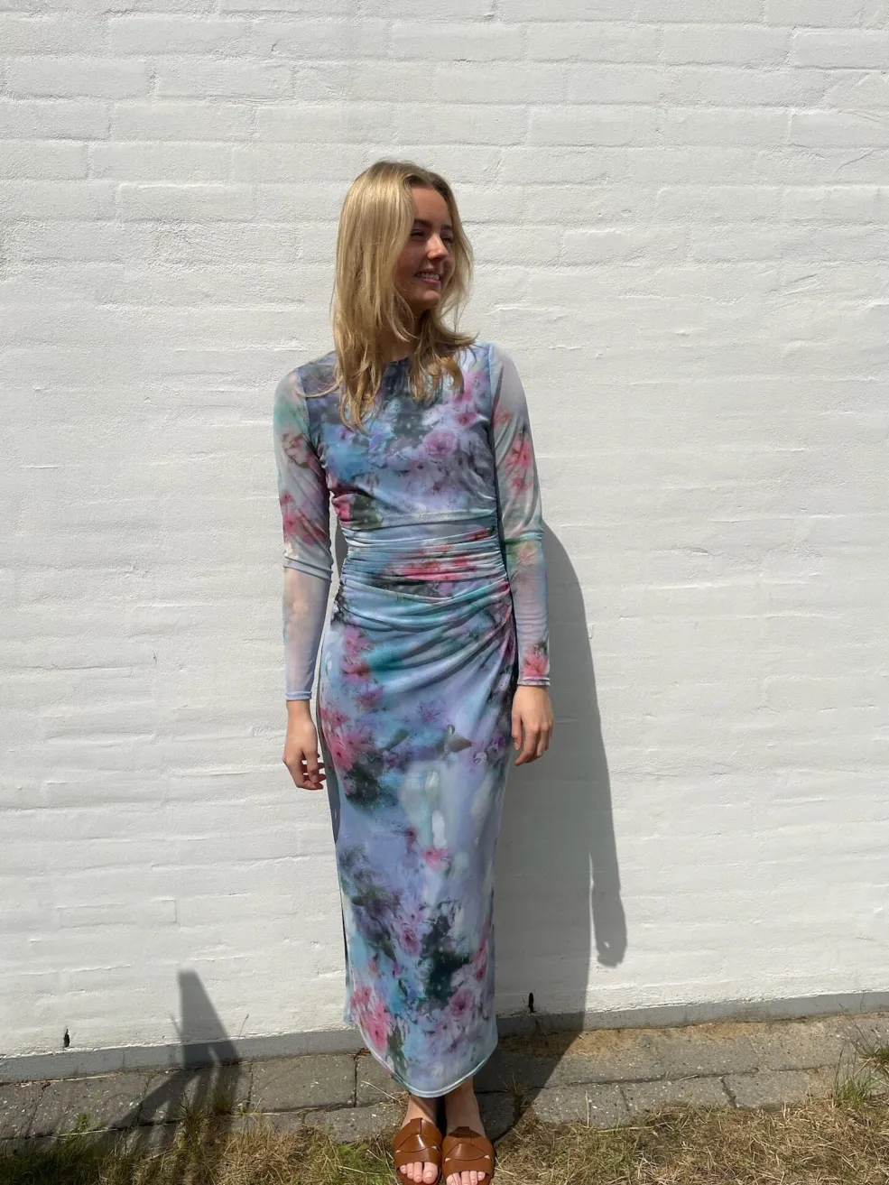 Meshkjole fra Sisters Point med tie-dye mønster i blå, pink og grønne nuancer. Kjolen har lange ærmer, rund hals og rynkedetaljer i taljen.