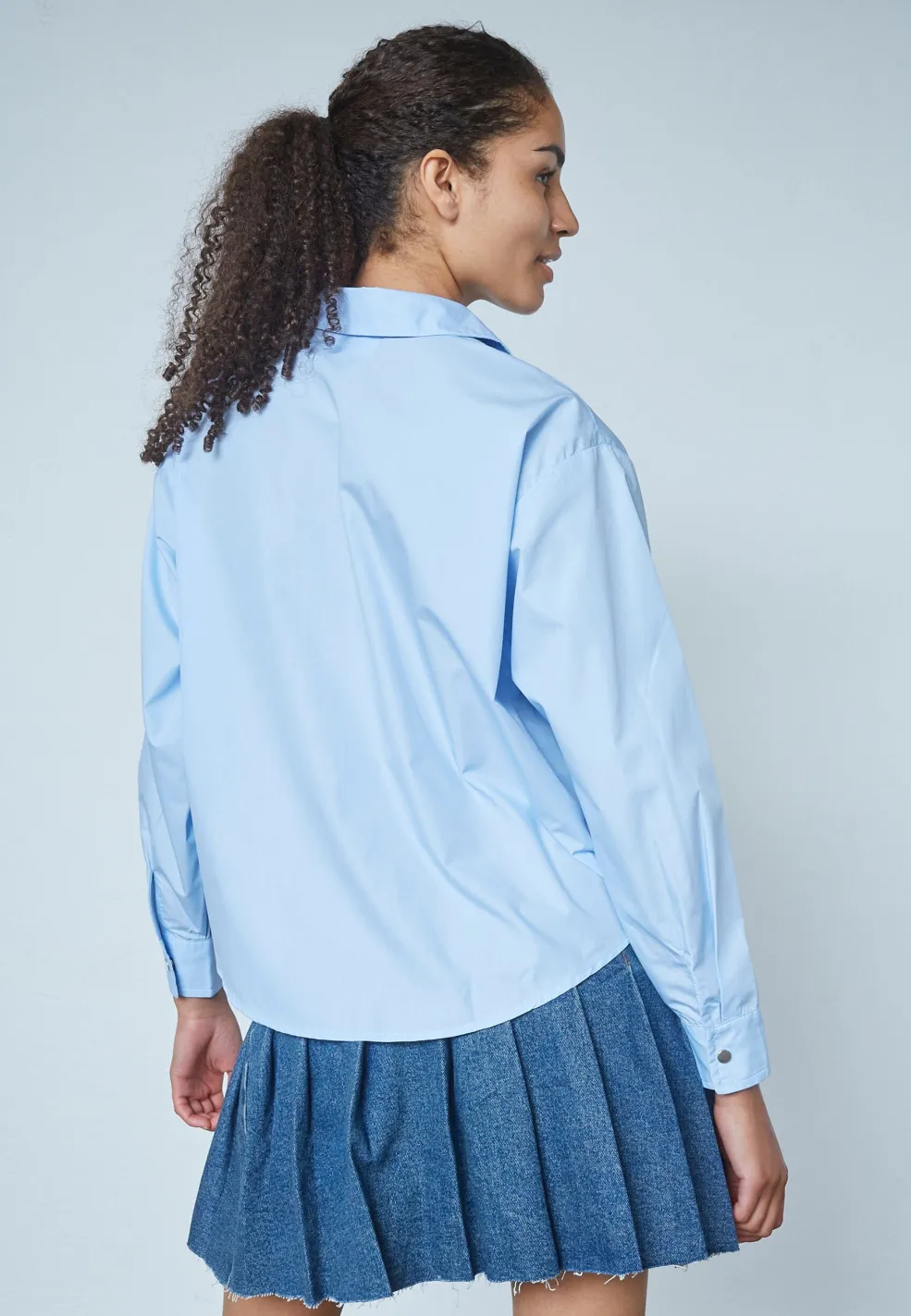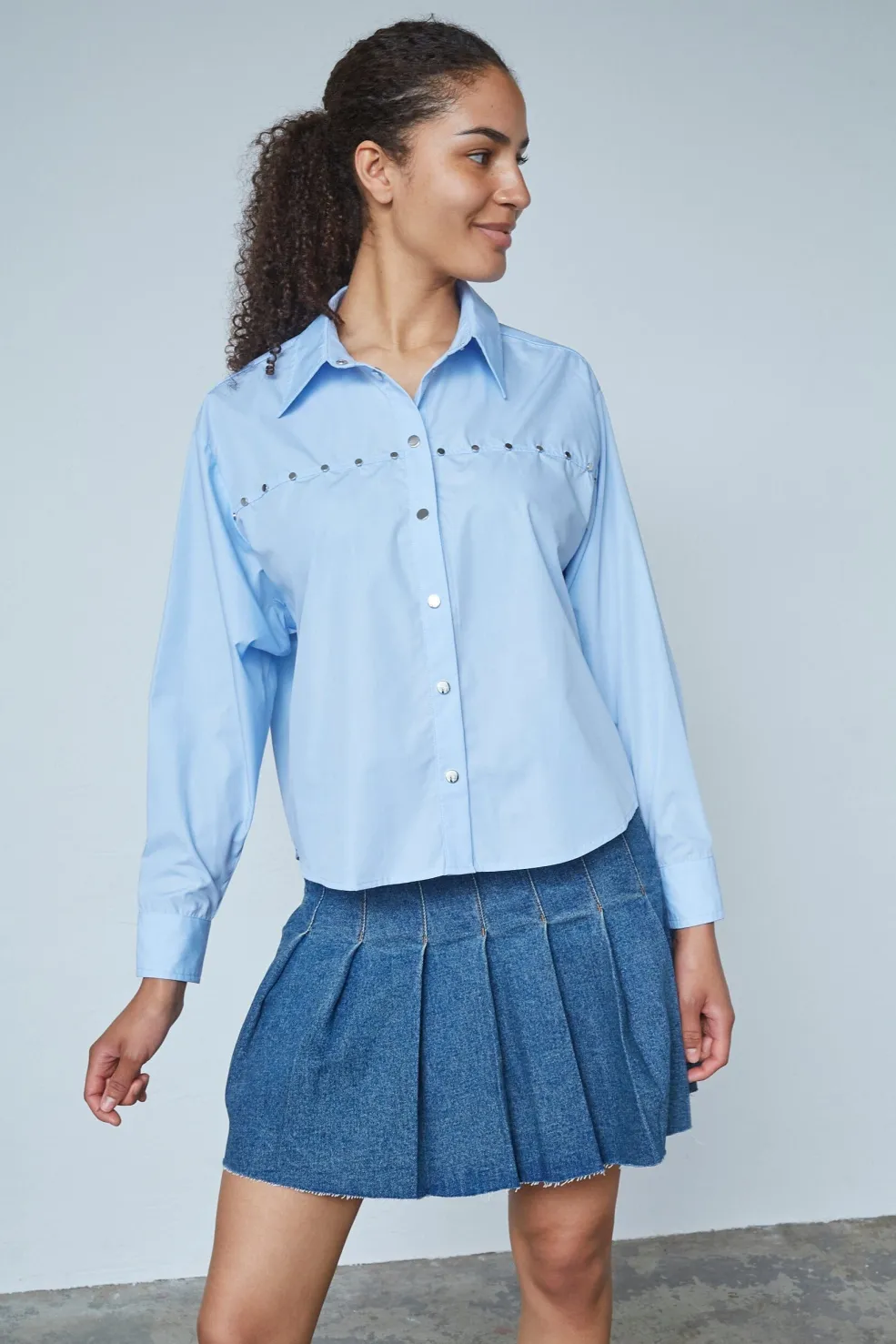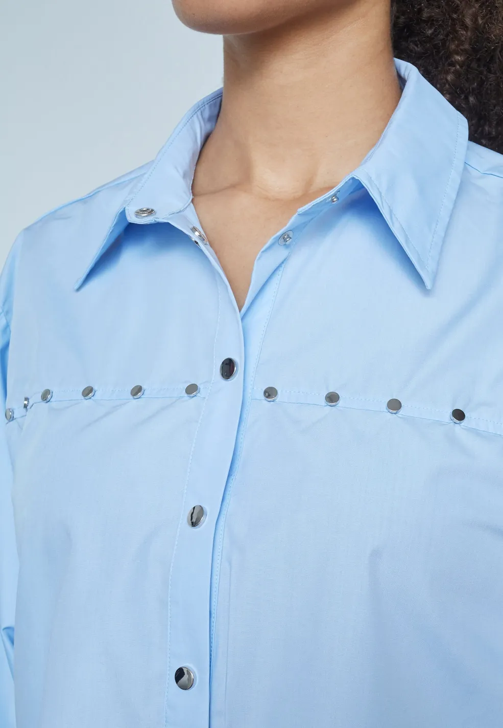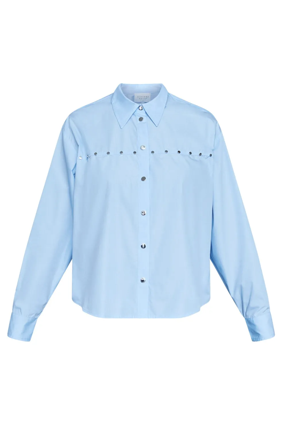 Lyseblå skjorte fra Sisters Point. Den er velegnet til både afslappede hverdage og festlige lejligheder med sit klassiske snit og dekorative detaljer.