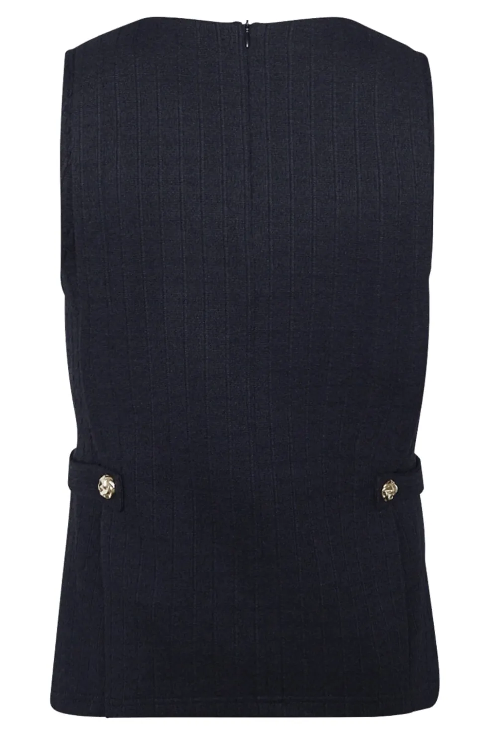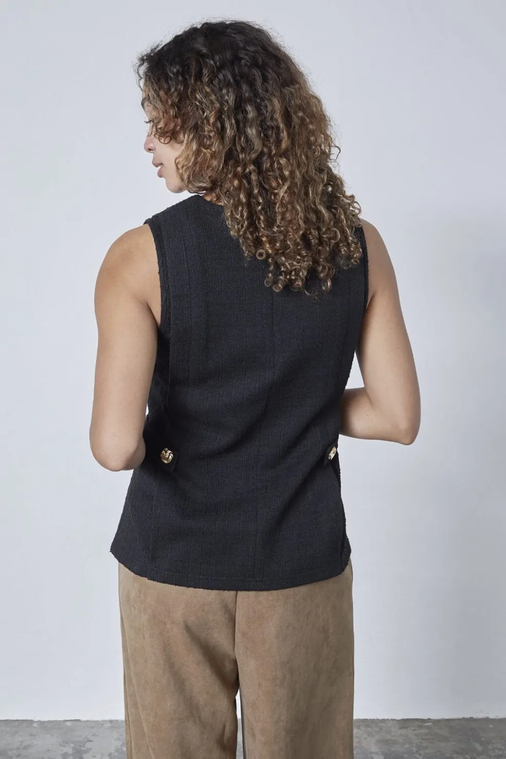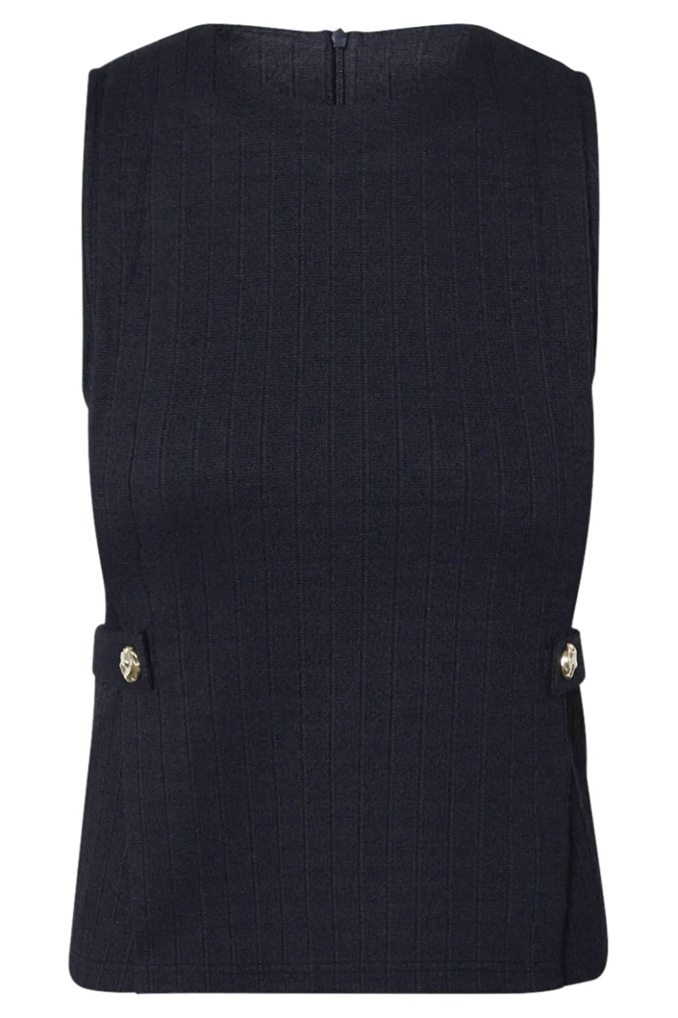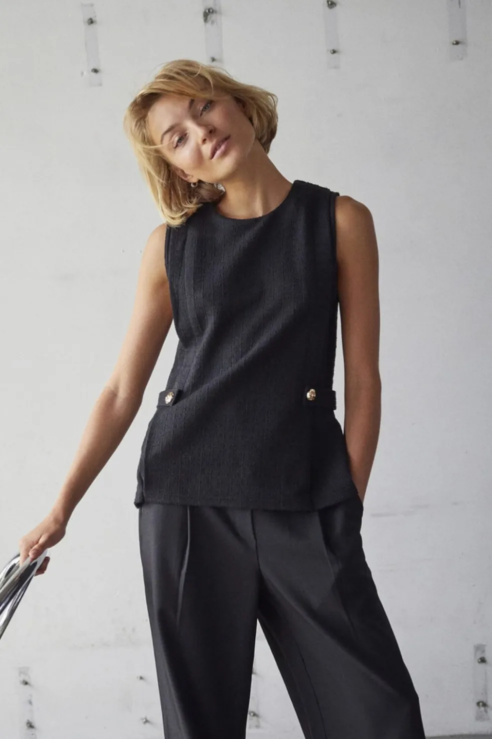Sort ærmeløs top fra Sisters Point med rund halsudskæring. Toppen har en struktureret overflade og dekorative guldknapper i siden, der giver et stilrent udtryk.