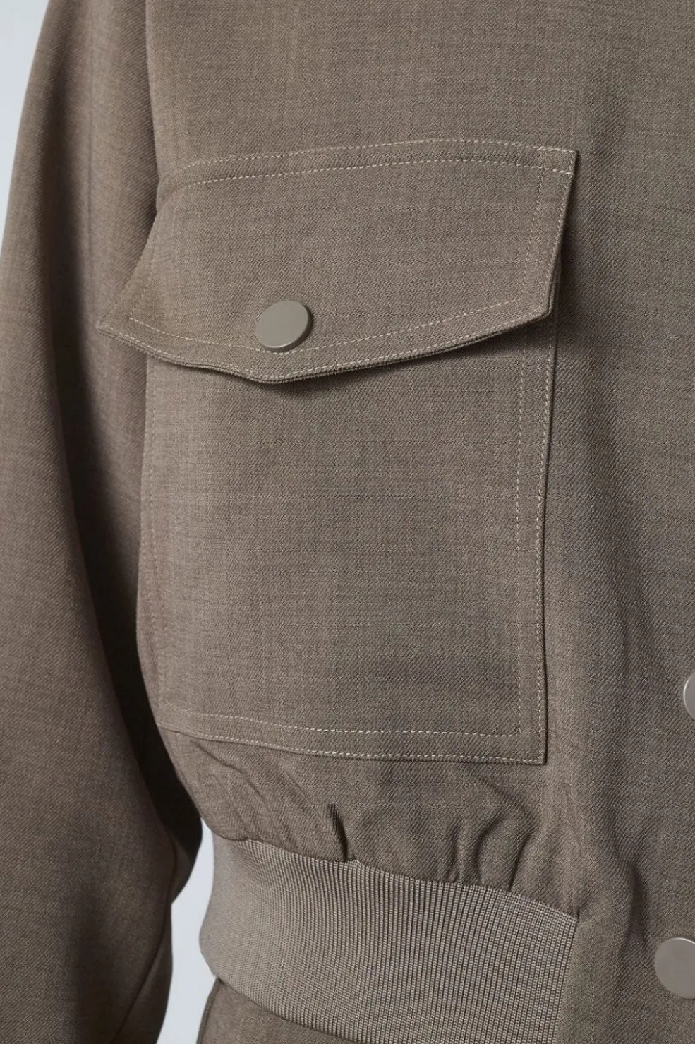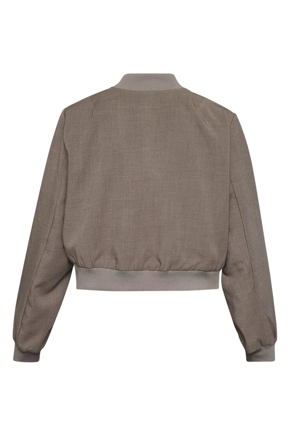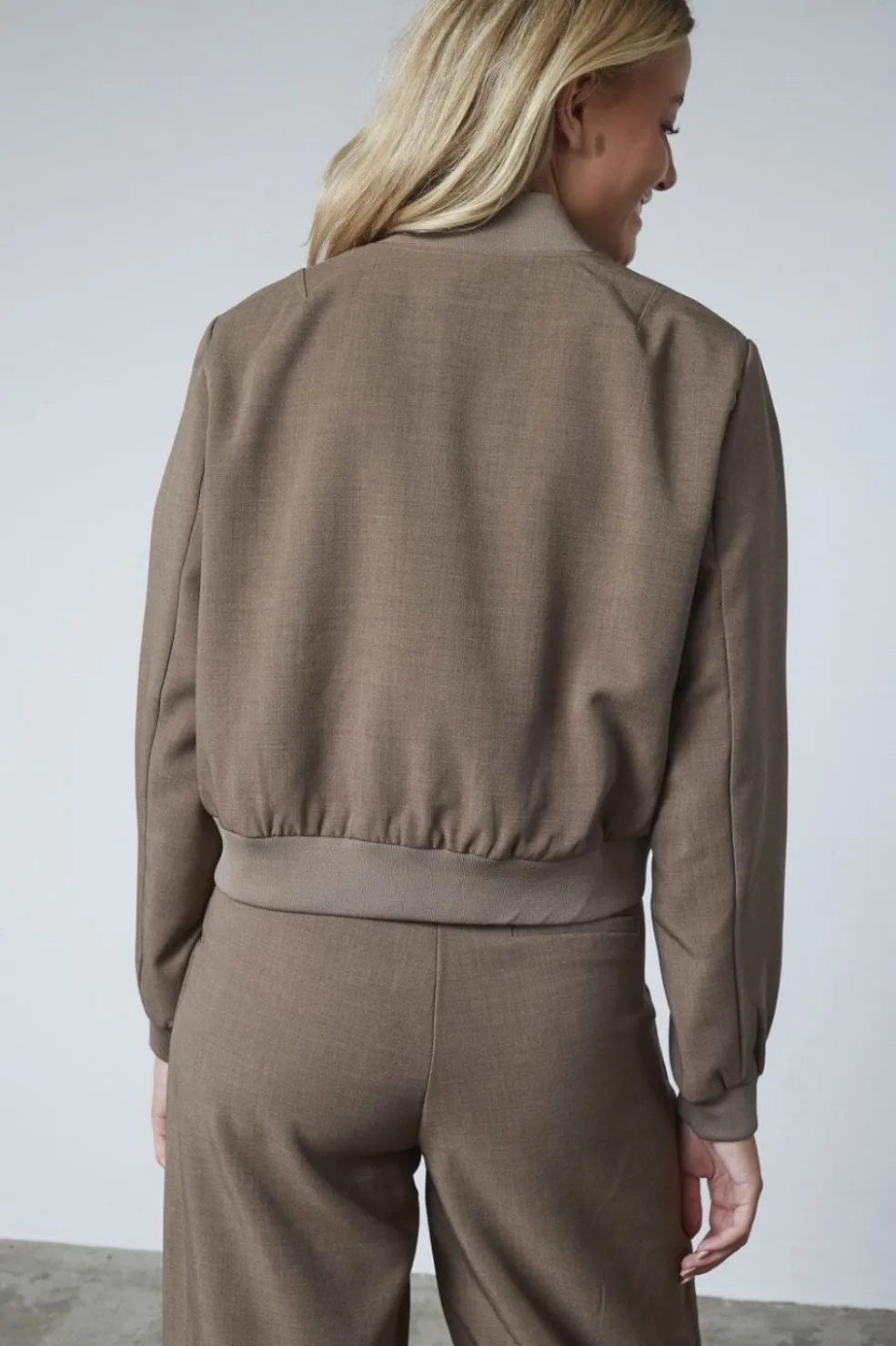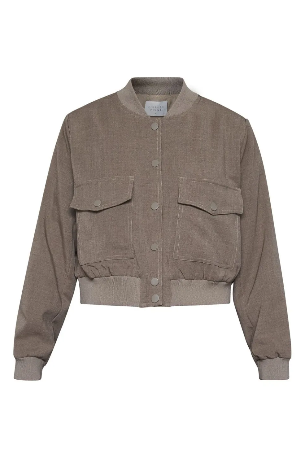 Kort jakke fra Sisters Point i cappuccino. Den har en cropped længde med ribkanter ved håndled, talje og nakke. To klaplommer på brystet og knaplukning foran giver jakken et praktisk design.