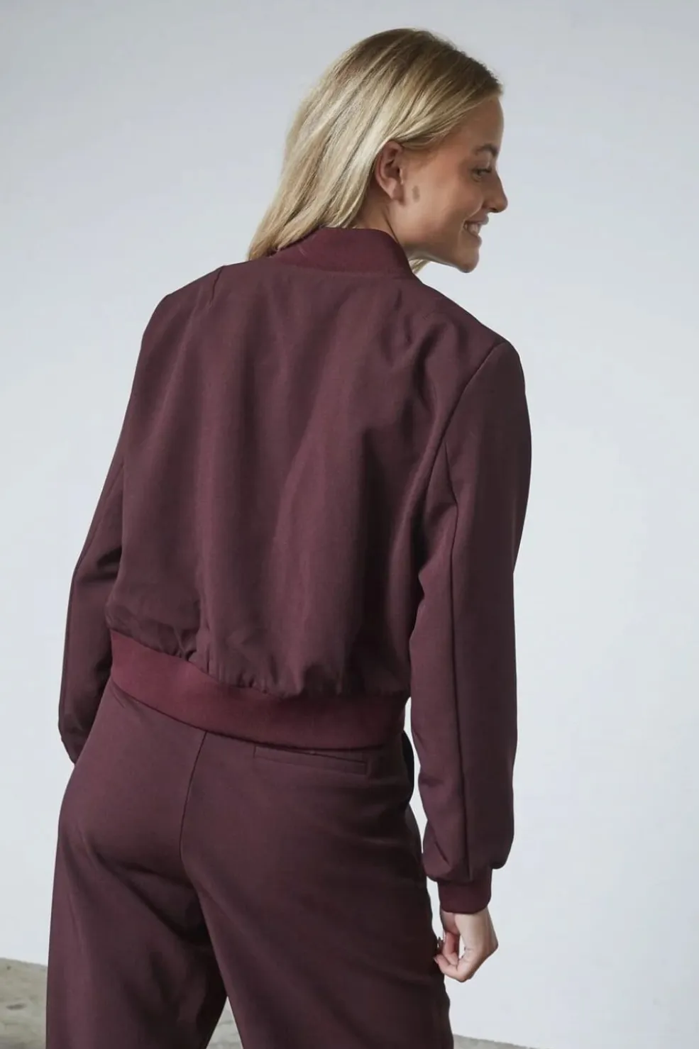 Kort jakke fra Sisters Point i dyb bordeaux. Den har trykknapper og knapper langs midten samt to praktiske frontlommer med knaplukning.