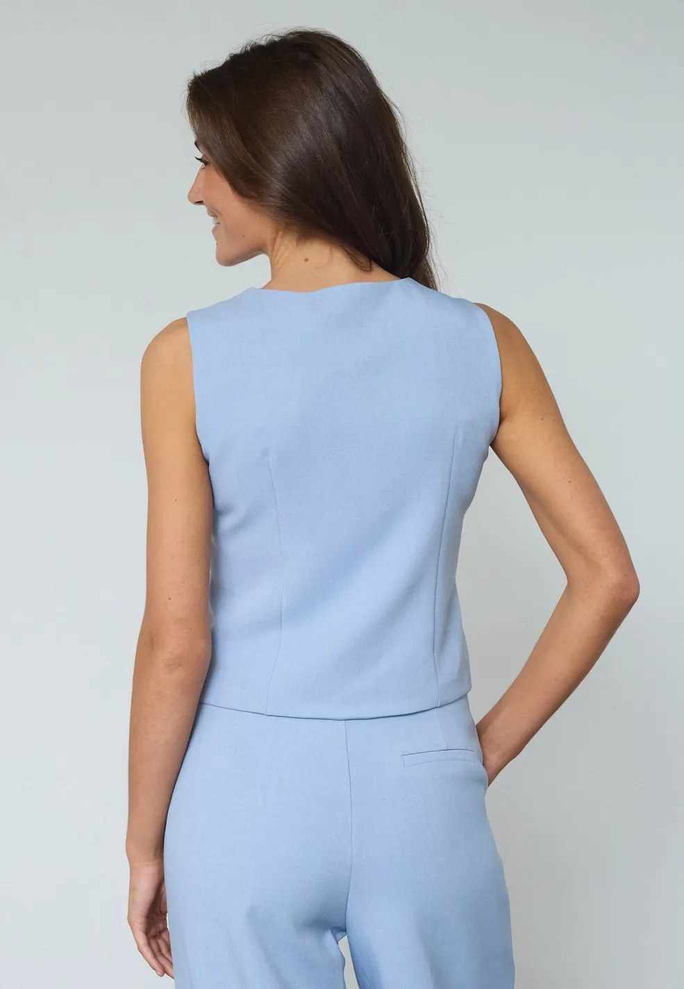 En lyseblå vest fra Sisters Point med asymmetrisk knaplukning og V-hals. Vesten har seks knapper ned langs fronten og to dekorative lommer.