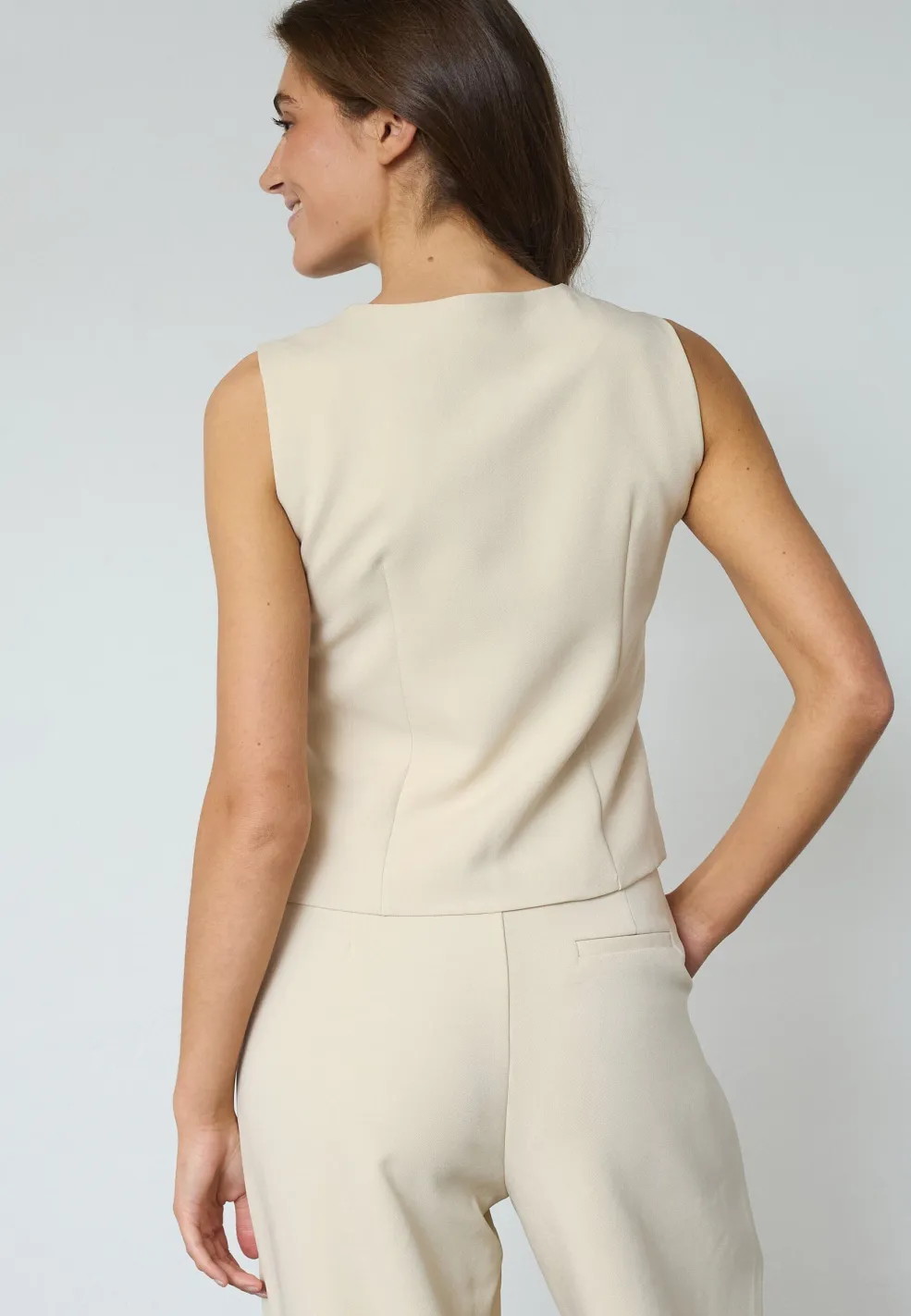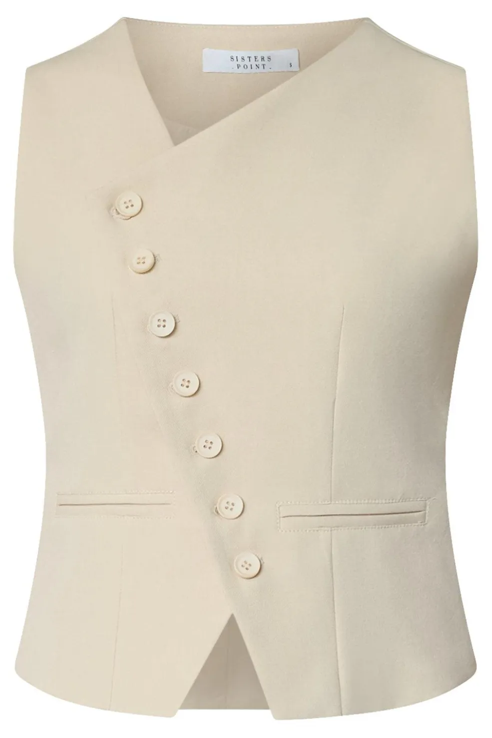 Ærmeløs vest fra Sisters Point i en lys beige nuance. Vesten har en V-hals og dekorative knapper langs fronten.