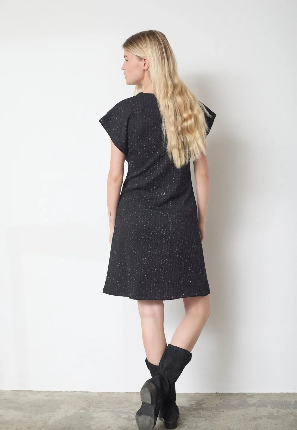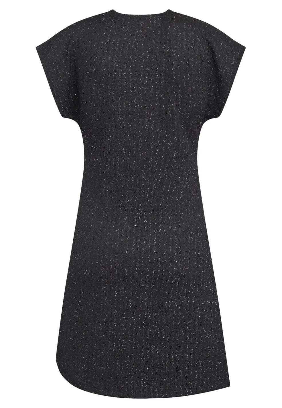 Sort kjole fra Sisters Point med sølvglimmerdetaljer. Kjolen har en dyb V-udskæring og korte ærmer. Dekorative knapper pryder fronten.