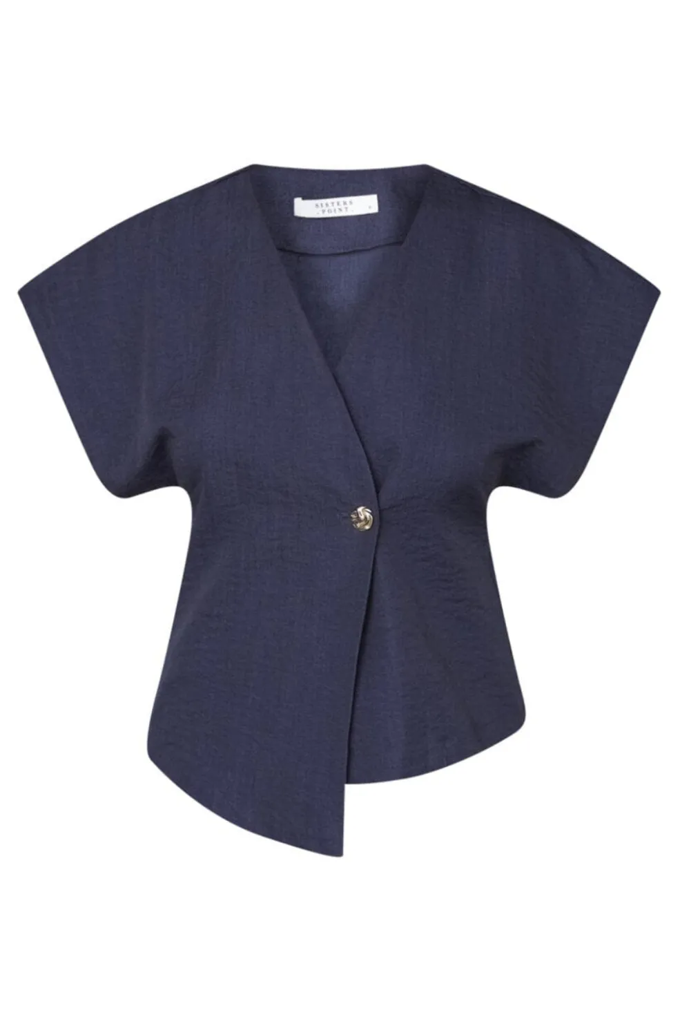 En mørkeblå vest fra Sisters Point med korte, brede ærmer og en enkelt knaplukning foran. Vesten har en V-udskæring og en almindelig pasform.