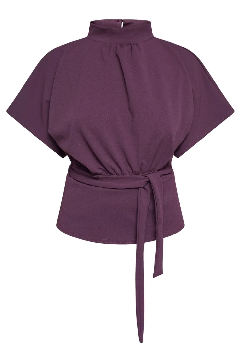 Top fra Sisters Point i dyb bordeaux. Lavet af en polyesterblanding med høj hals og korte ærmer. Toppen har en løs pasform og medfølgende bindebånd i taljen.