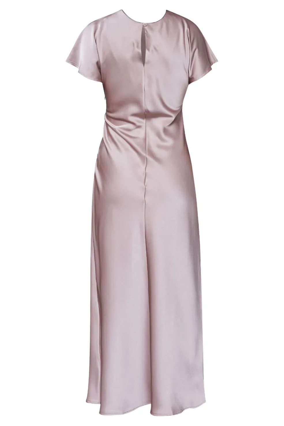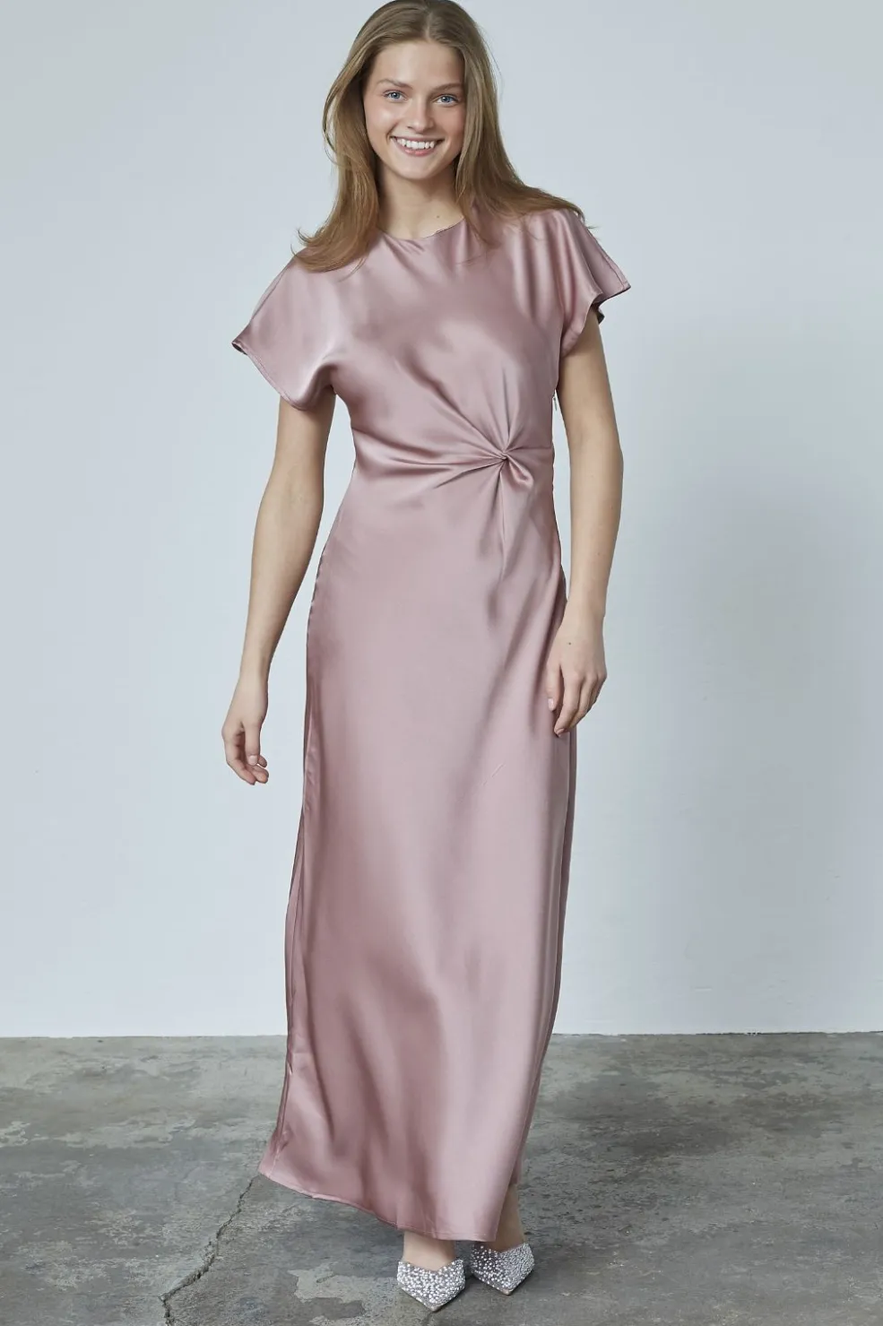 Lang kjole fra Sisters Point i lyserosa. Kjolen har korte ærmer, rund halsudskæring og en twist-detalje ved taljen. Knapperne bagpå gør den nem at tage af og på.