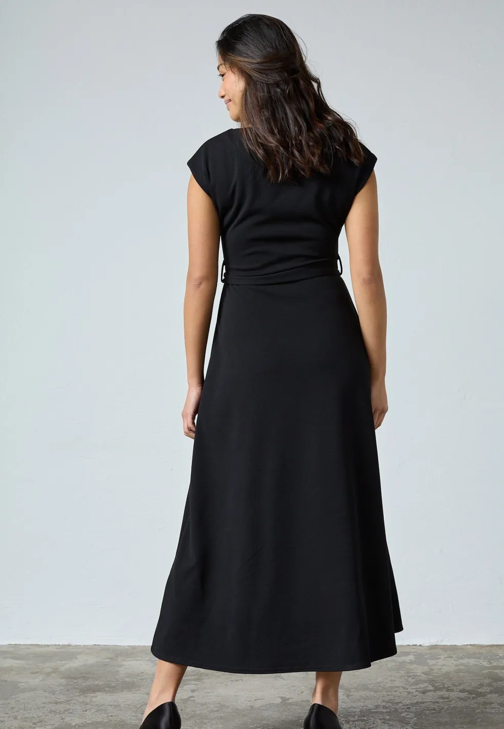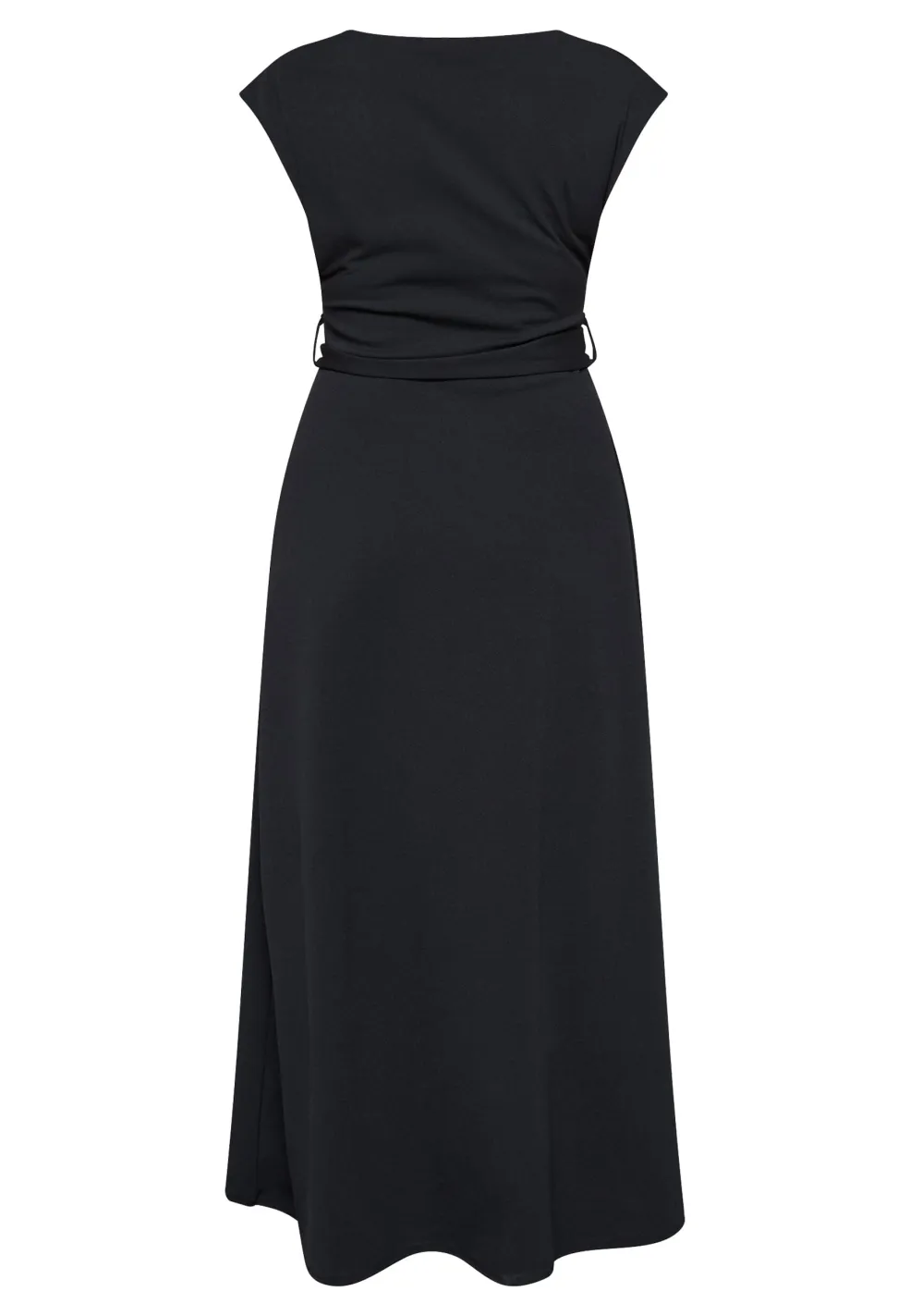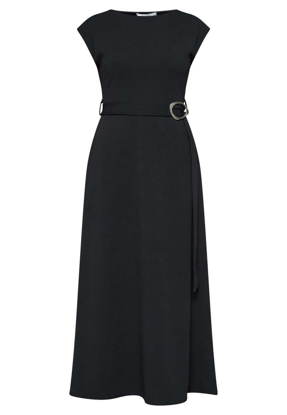 Sort kjole fra Sisters Point i glat polyester med fast taljebælte og stort, rundt spænde foran.