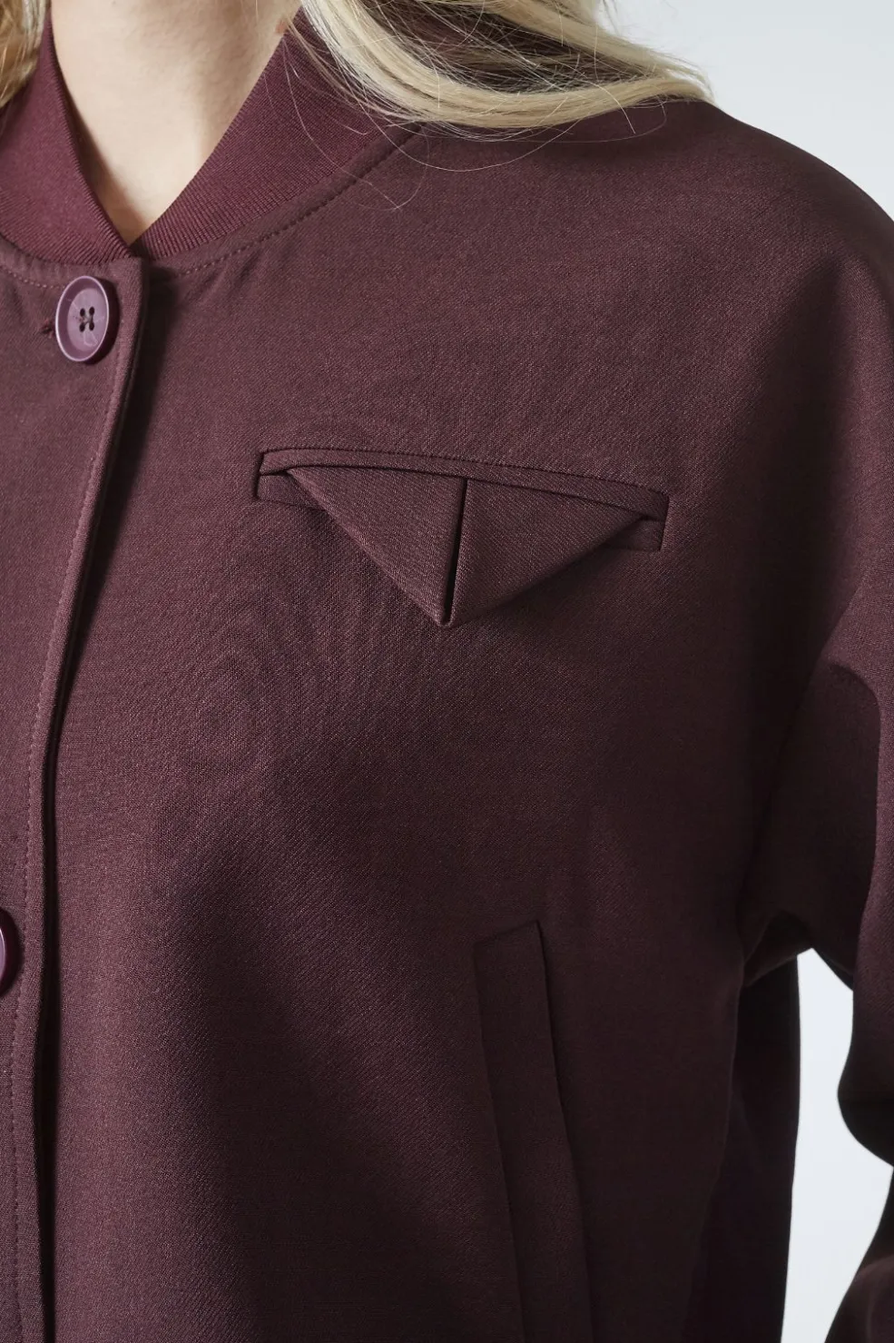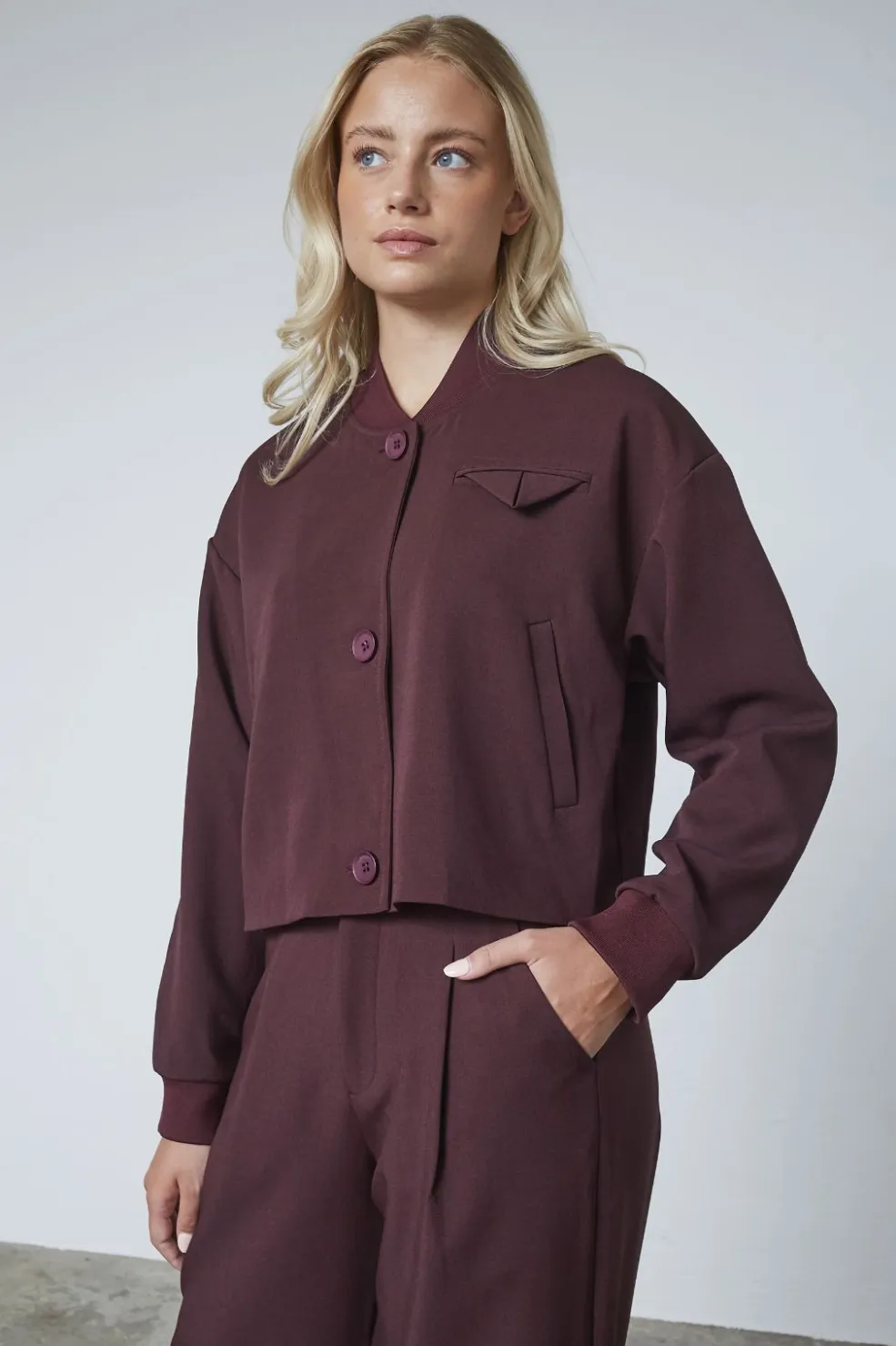 Kort jakke fra Sisters Point i mørk bordeauxfarve. Jakken har lange ærmer og en løs pasform, der giver bevægelsesfrihed til hverdagsbrug.