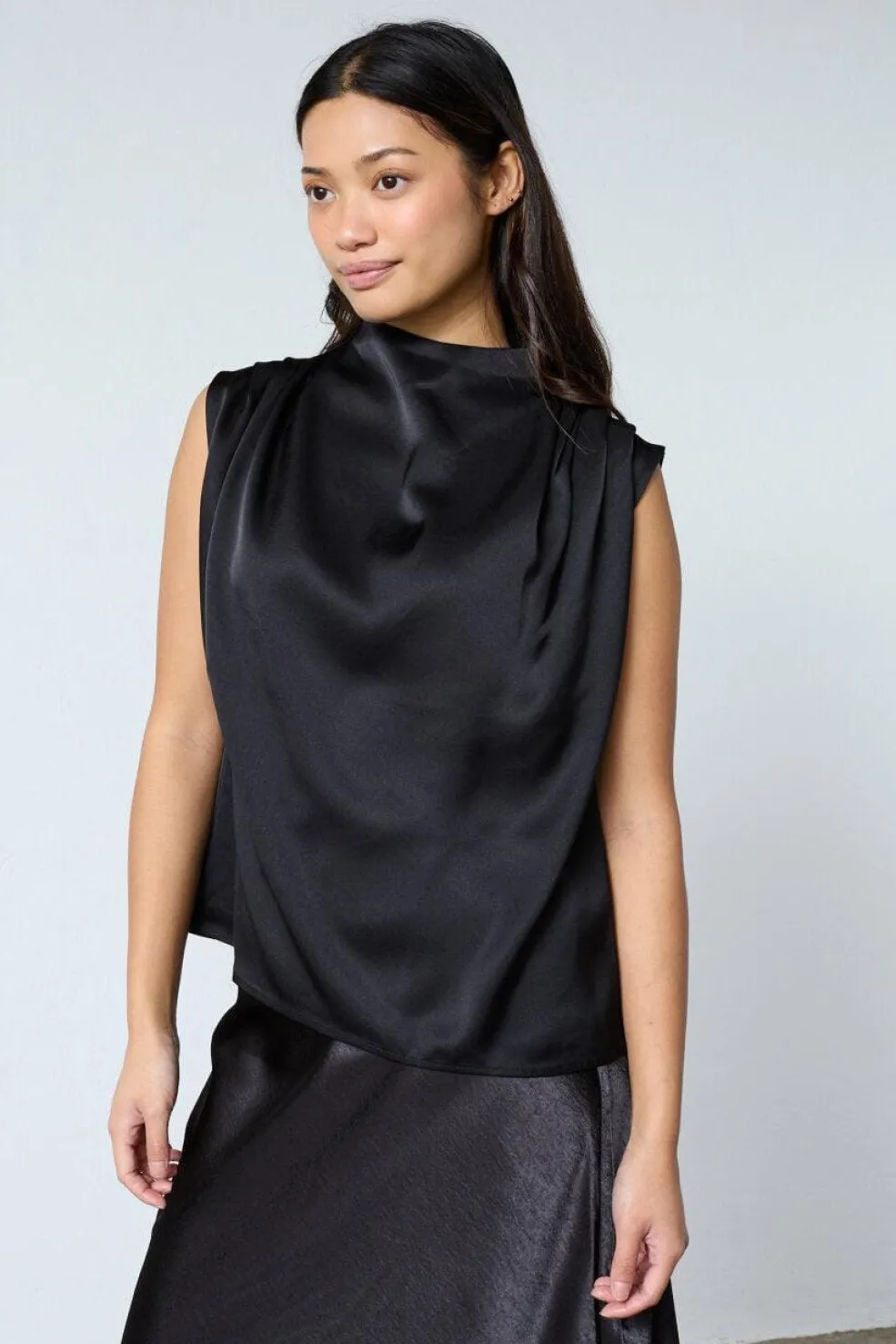 Sort ærmeløs bluse fra Sisters Point med et skinnende satinlook. Materialet er 100% polyester med en glat overflade.