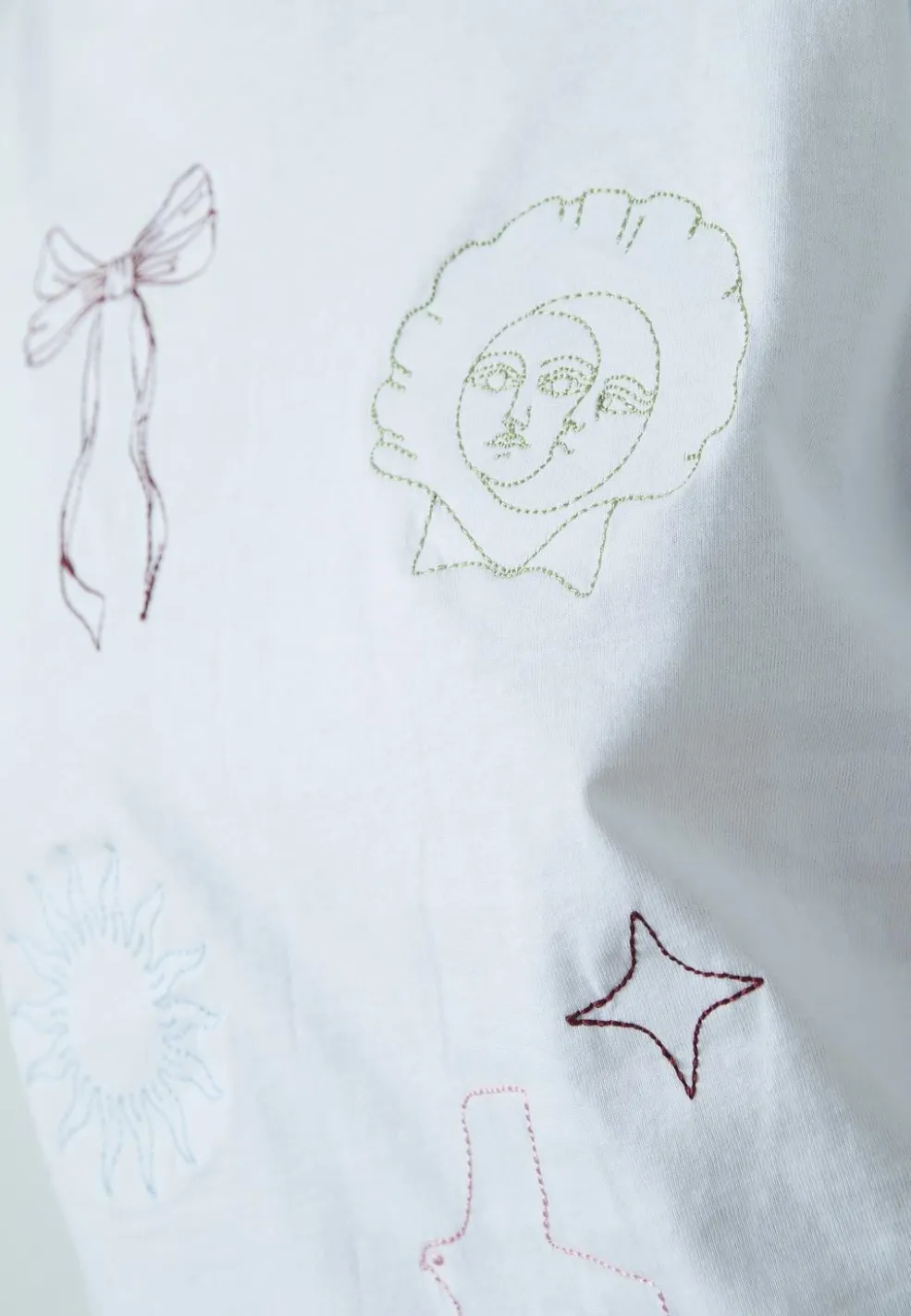 Hvid t-shirt fra Sisters Point med broderede motiver i flere farver. T-shirten har en løs pasform med korte ærmer og rund hals.
