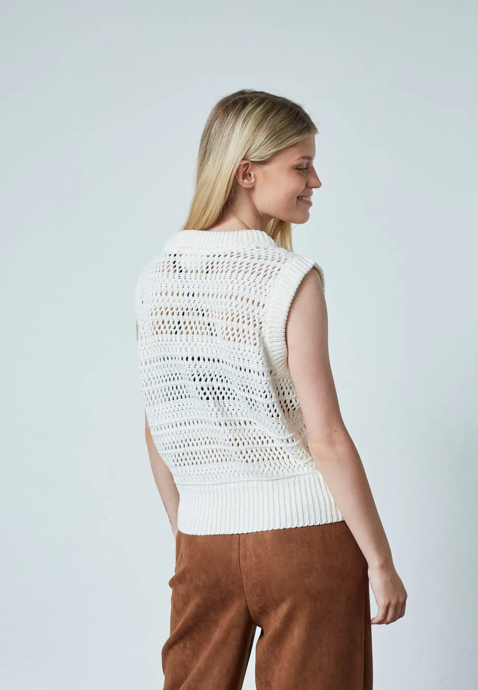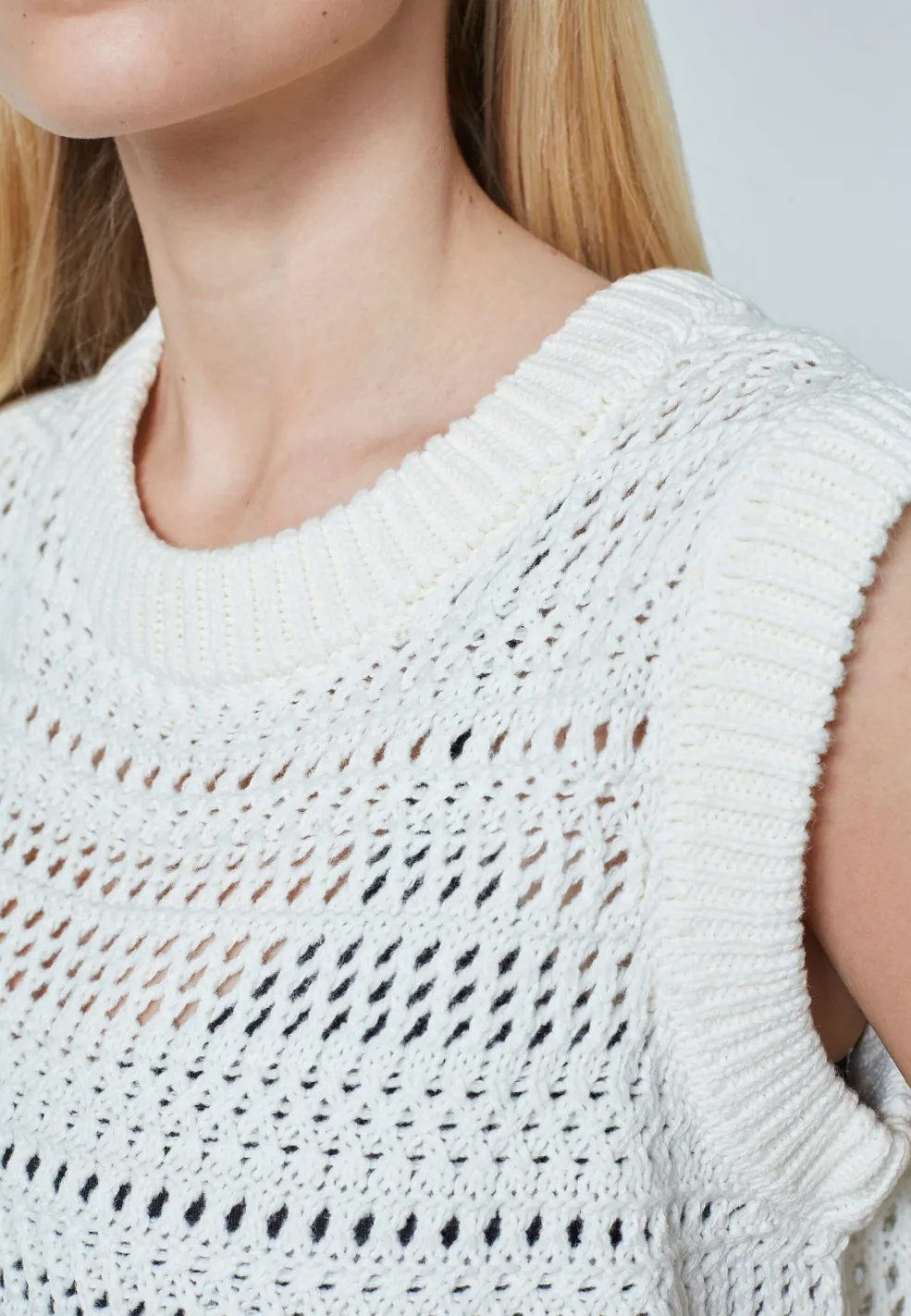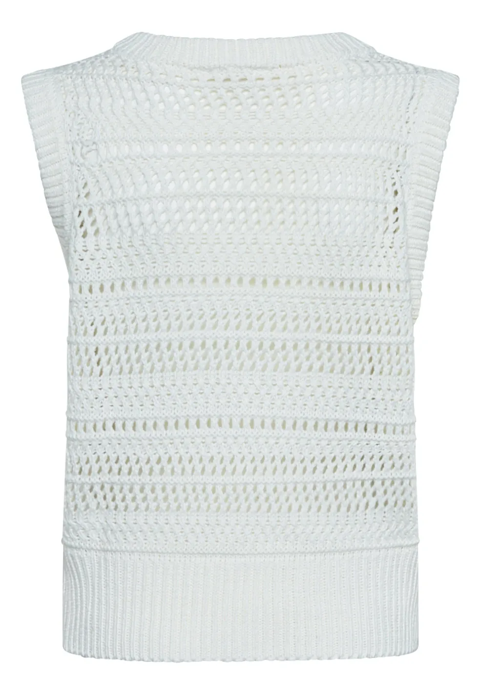 Cremefarvet strikvest fra Sisters Point med et åbent hulmønsterdesign gennem hele toppen. Vesten har en rund halsudskæring og ribbet kant ved halsudskæringen og forneden.