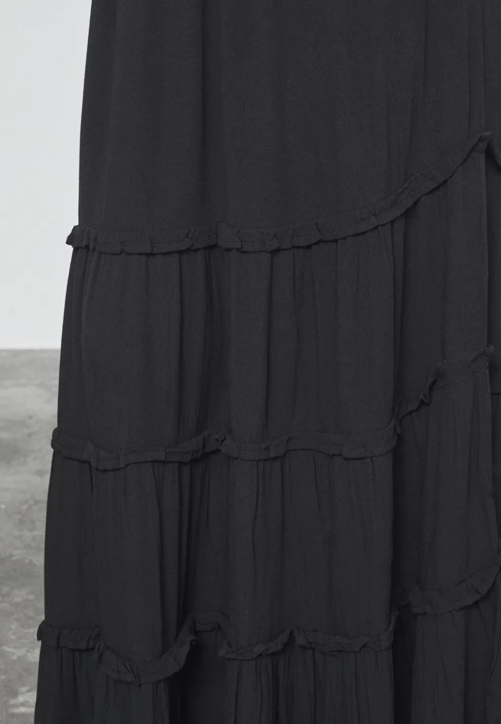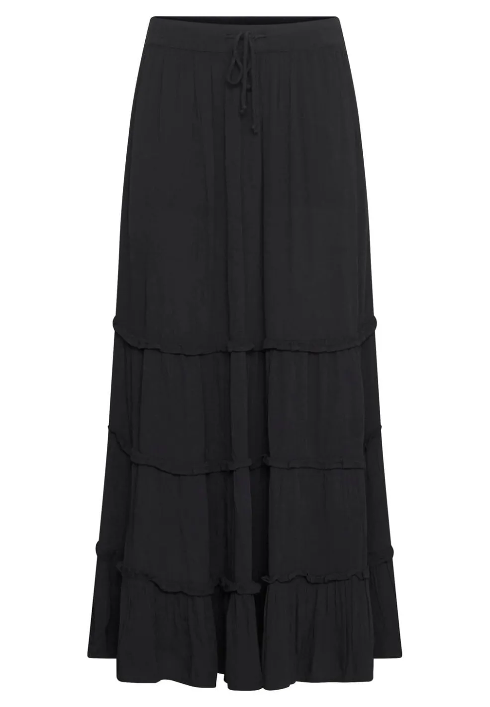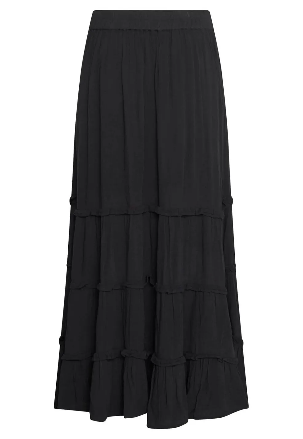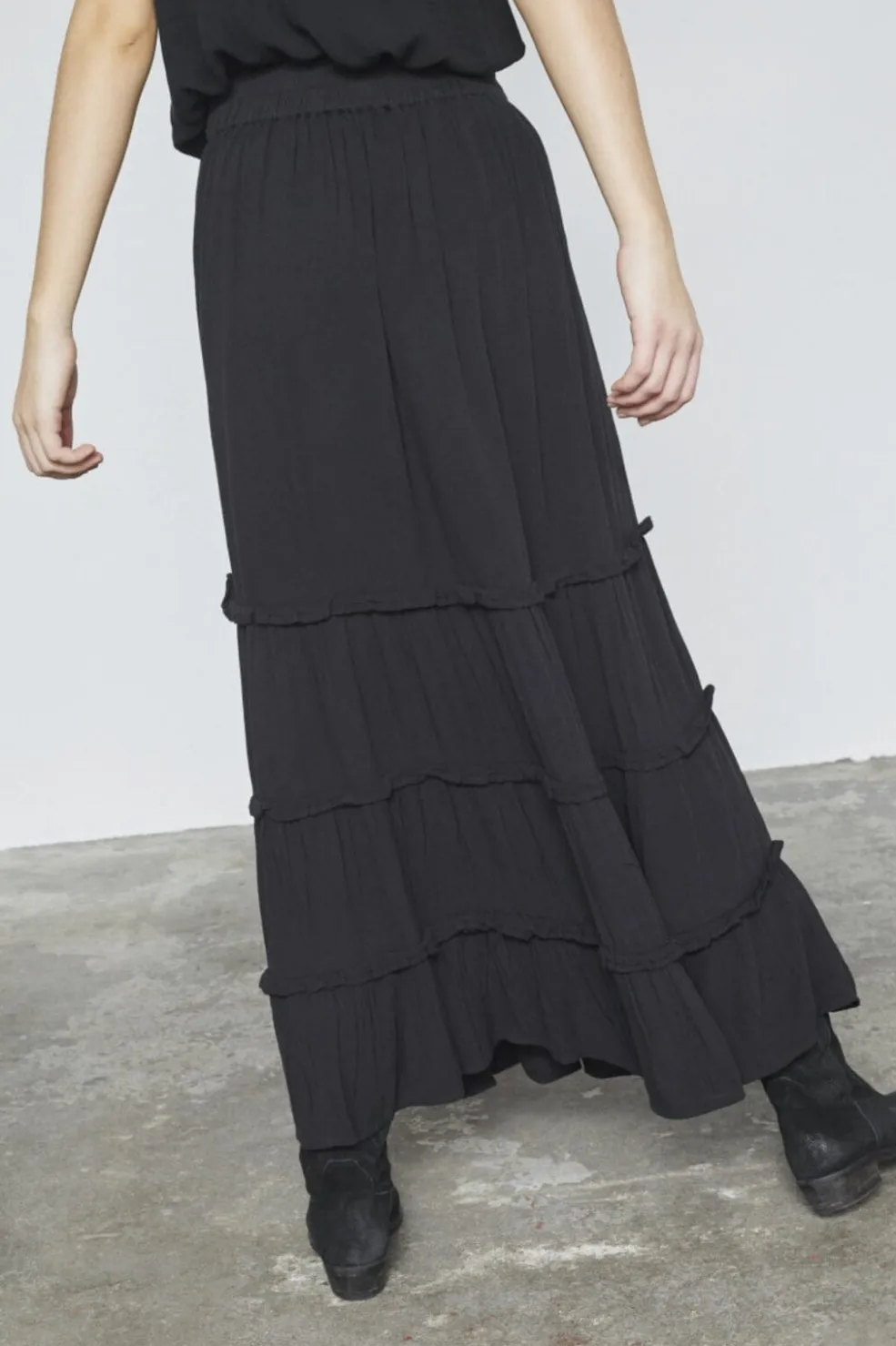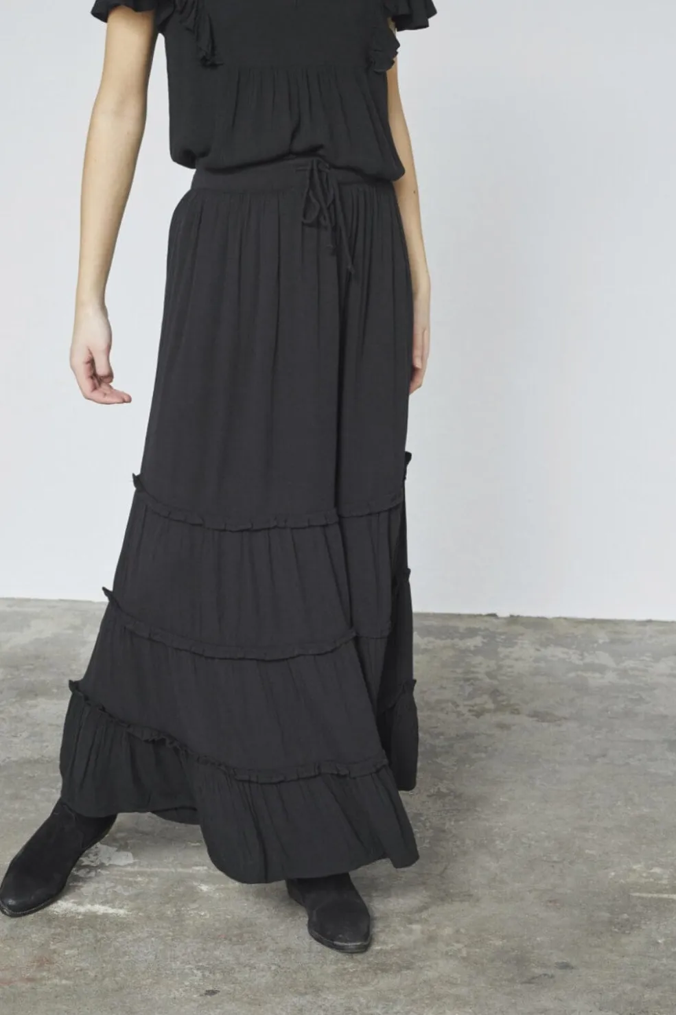 Sort nederdel fra Sisters Point med flere lag og rynkedetaljer. Den lange nederdel har elastik i taljen med bindebånd og bølgede kanter på hvert lag.