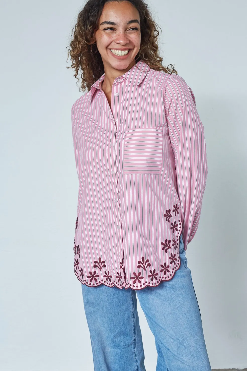 Stribet skjorte fra Sisters Point i pink med hvide striber og bordeaux detaljer. Skjorten har en løs pasform og er lavet af 75 % polyester og 25 % bomuld.