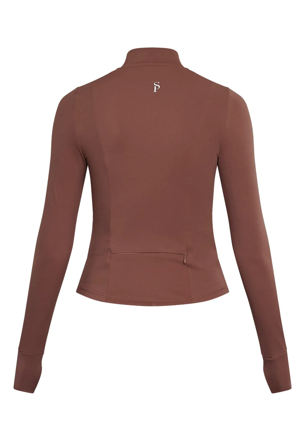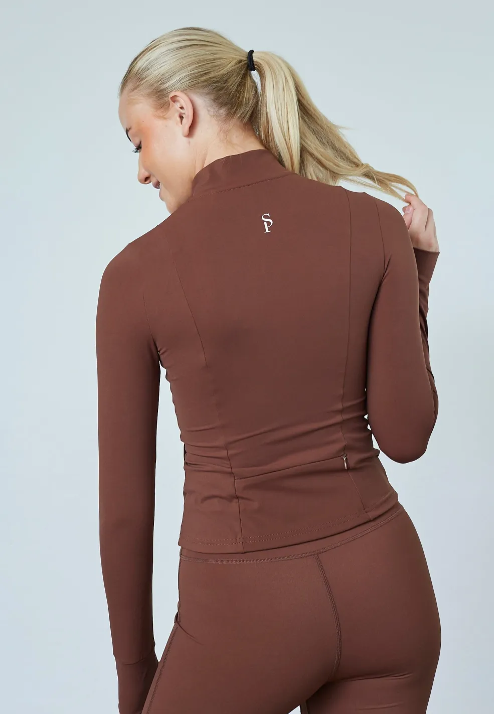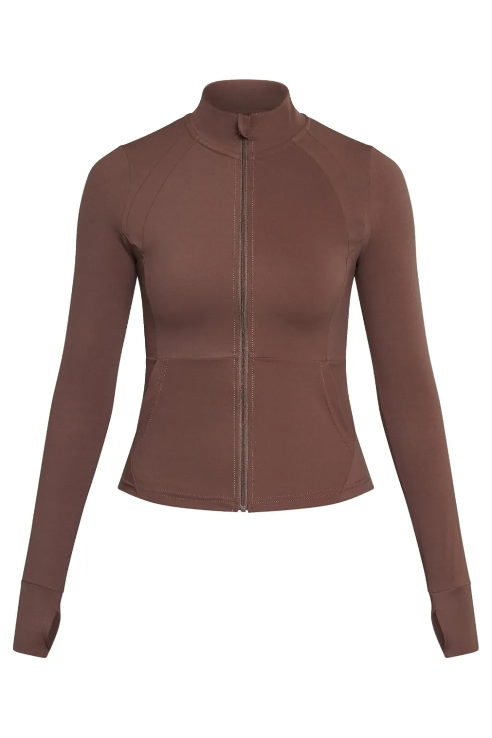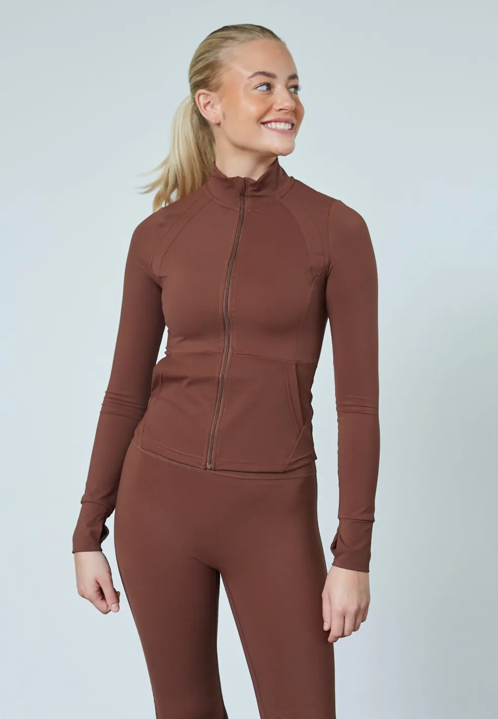 Brun træningsjakke fra Sisters Point, lavet af strækbart materiale. Jakken har en høj krave, lange ærmer og en lynlås foran.