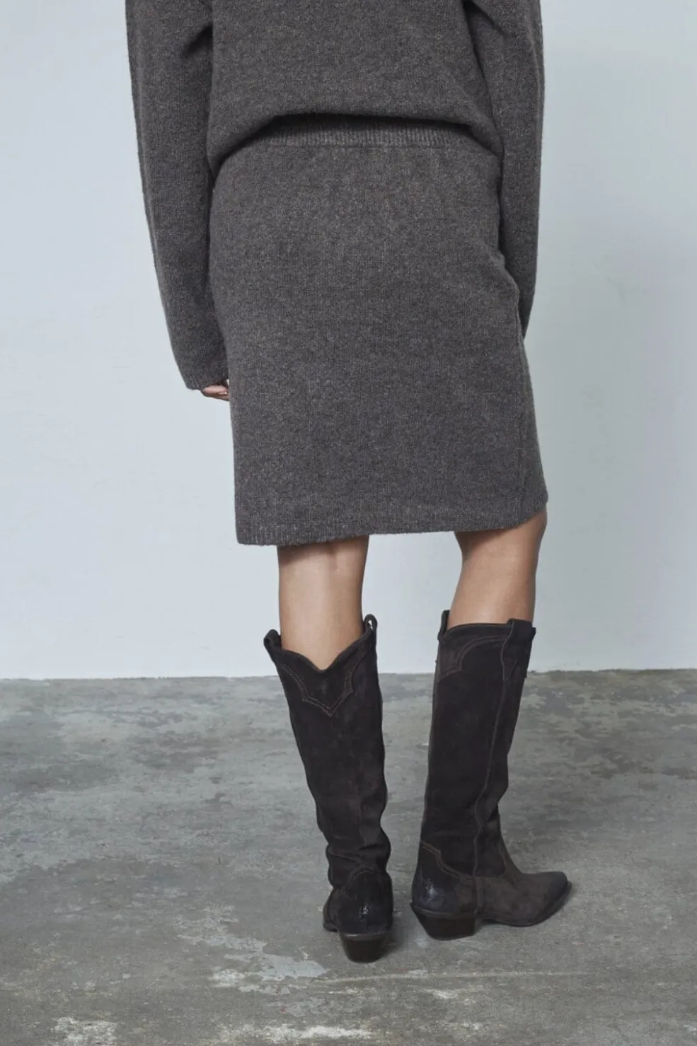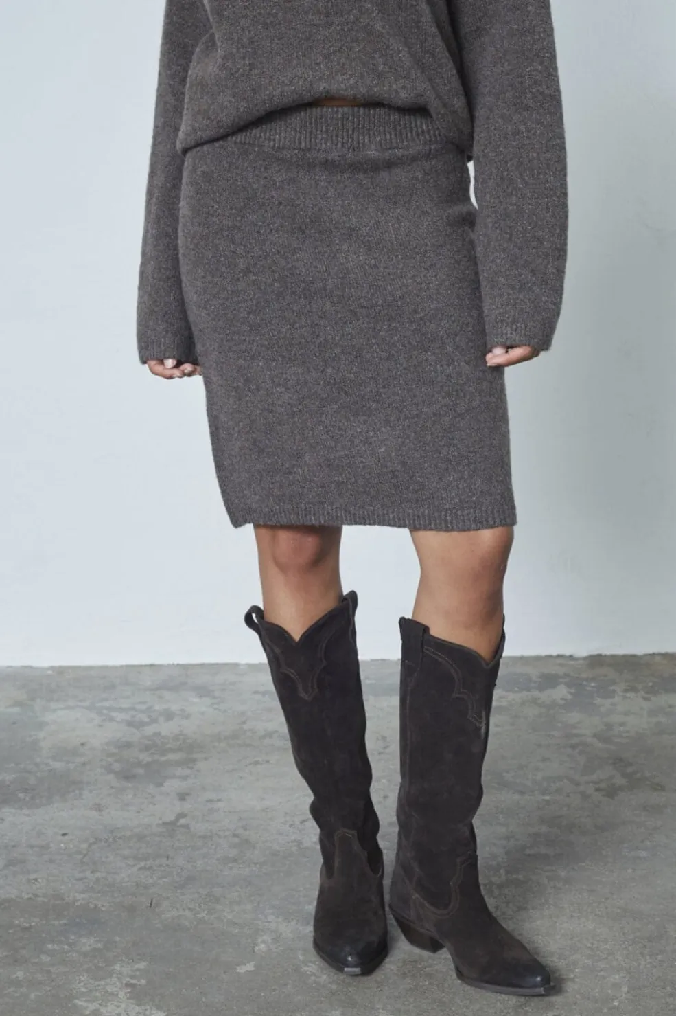 Strikket nederdel fra Sisters Point i brun med marl-mønster. Den strikkede tekstur giver nederdelen et rustikt udtryk.