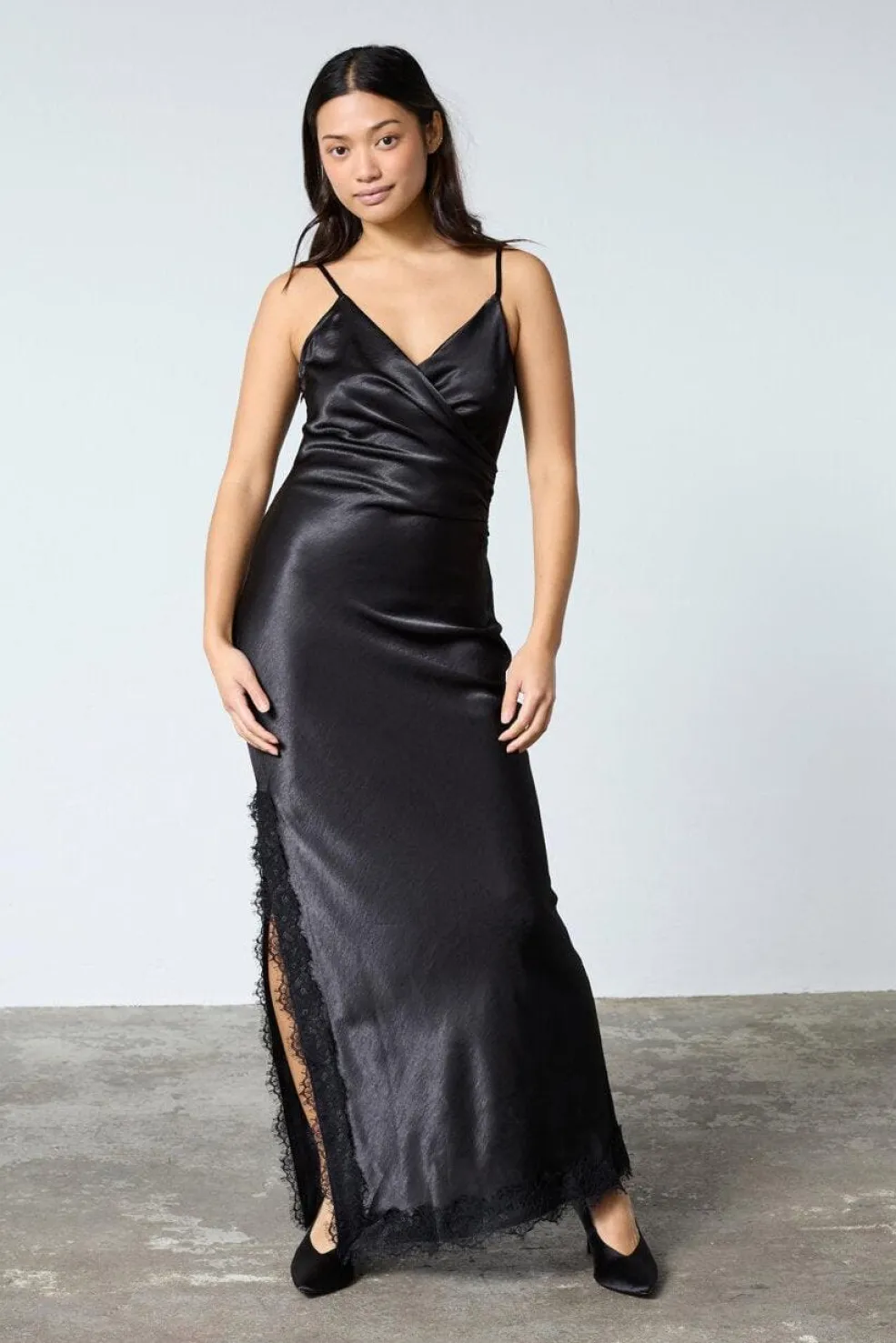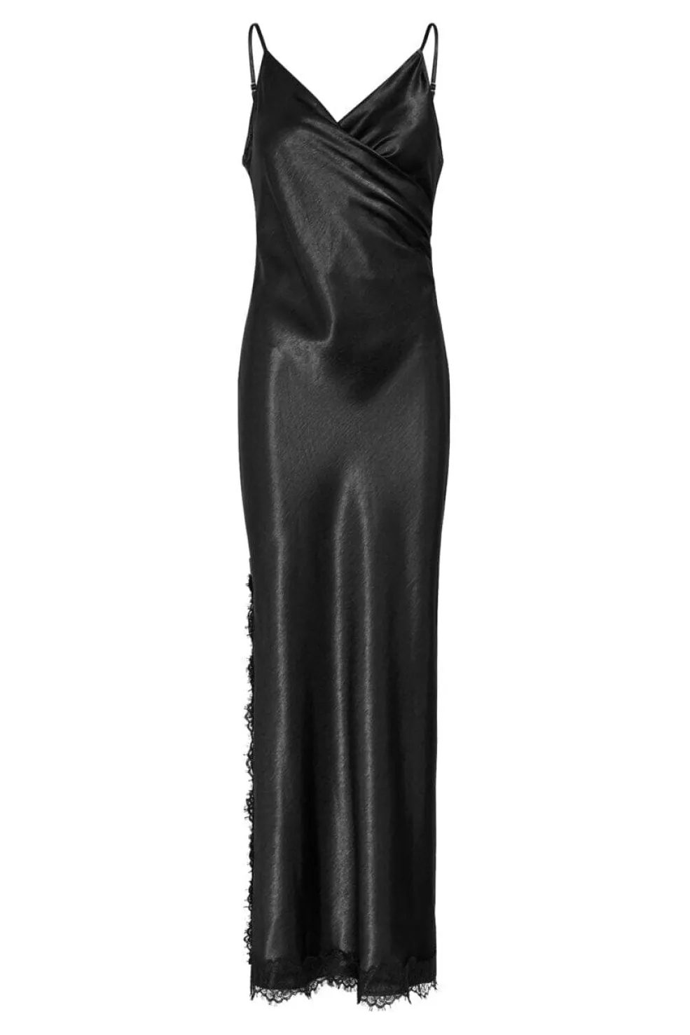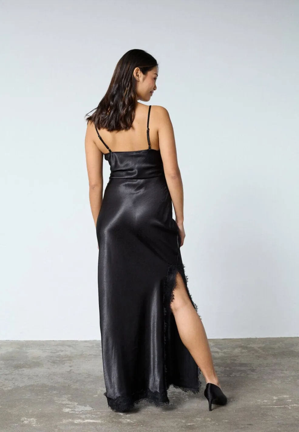 Sort kjole fra Sisters Point til festlige og formelle lejligheder. Kjolen har et satinlook med blonder og en smal pasform.