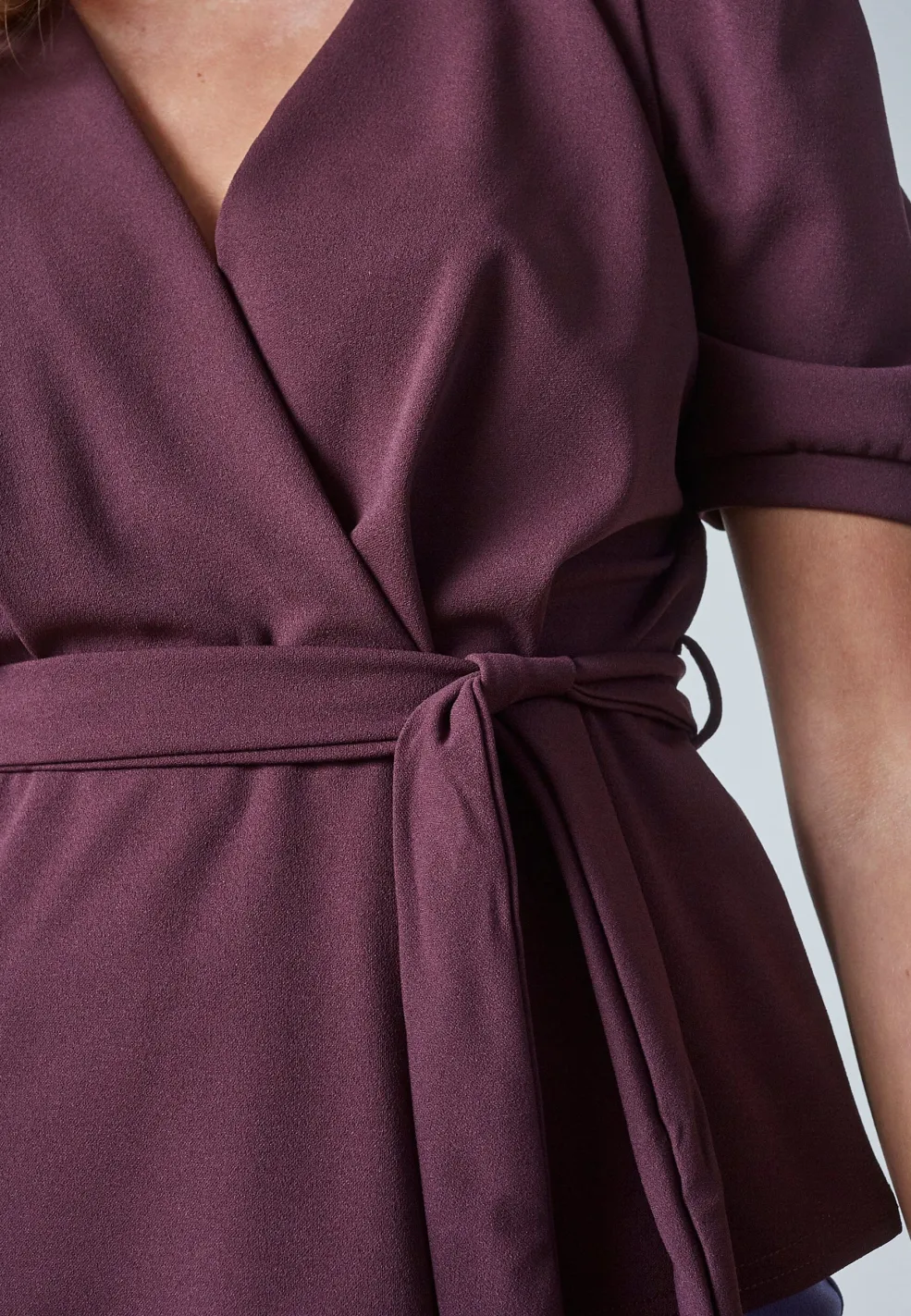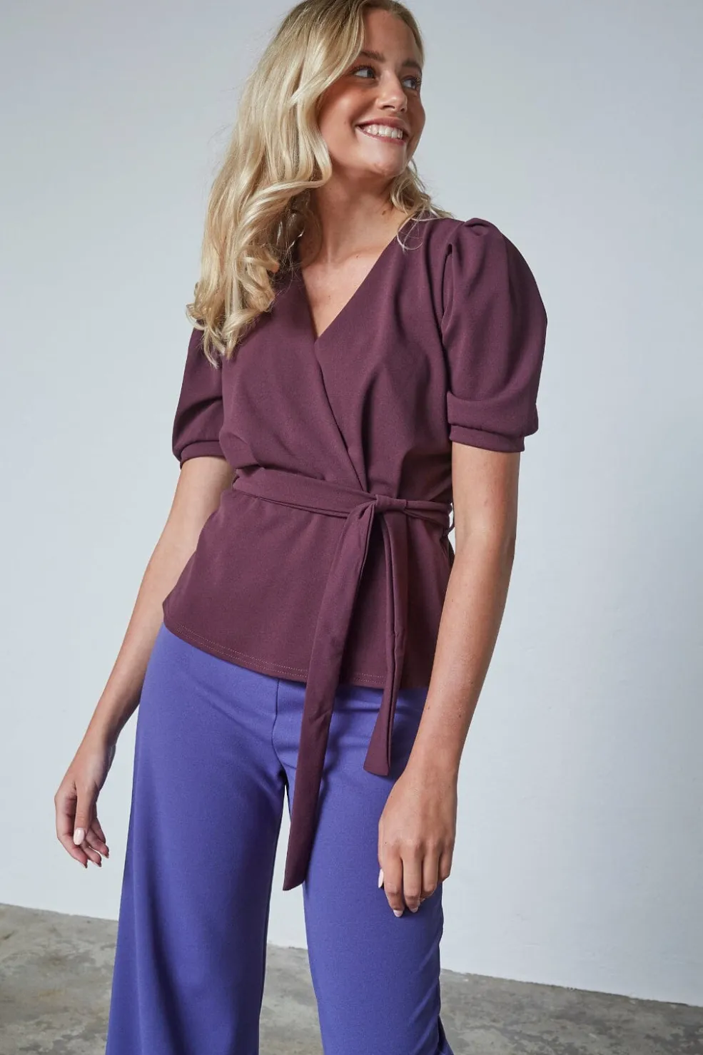 Top fra Sisters Point i dyb bordeaux. Toppen har en V-hals, korte pufærmer og et bindebånd i taljen.