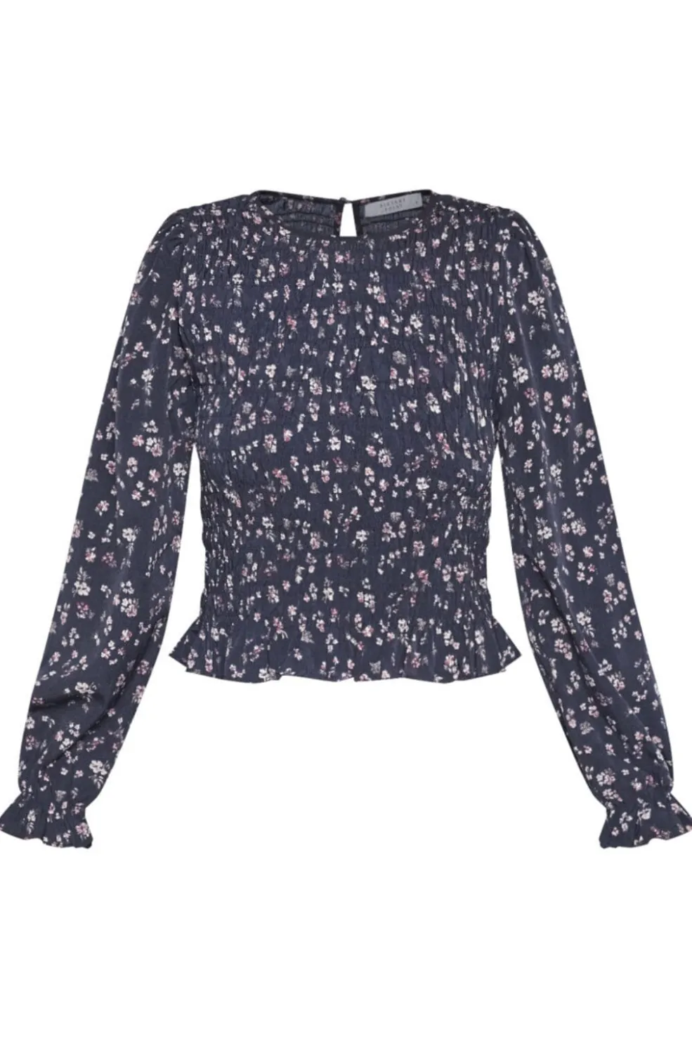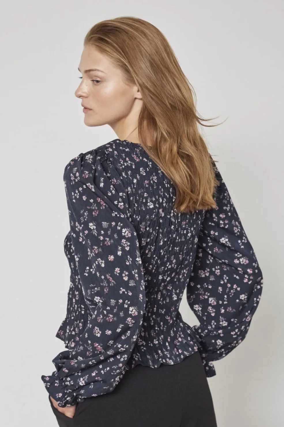 Bluse fra Sisters Point i mørkeblå med småblomstret print i lyse og mørke nuancer. Blusen har smocksyninger foran og bagpå.