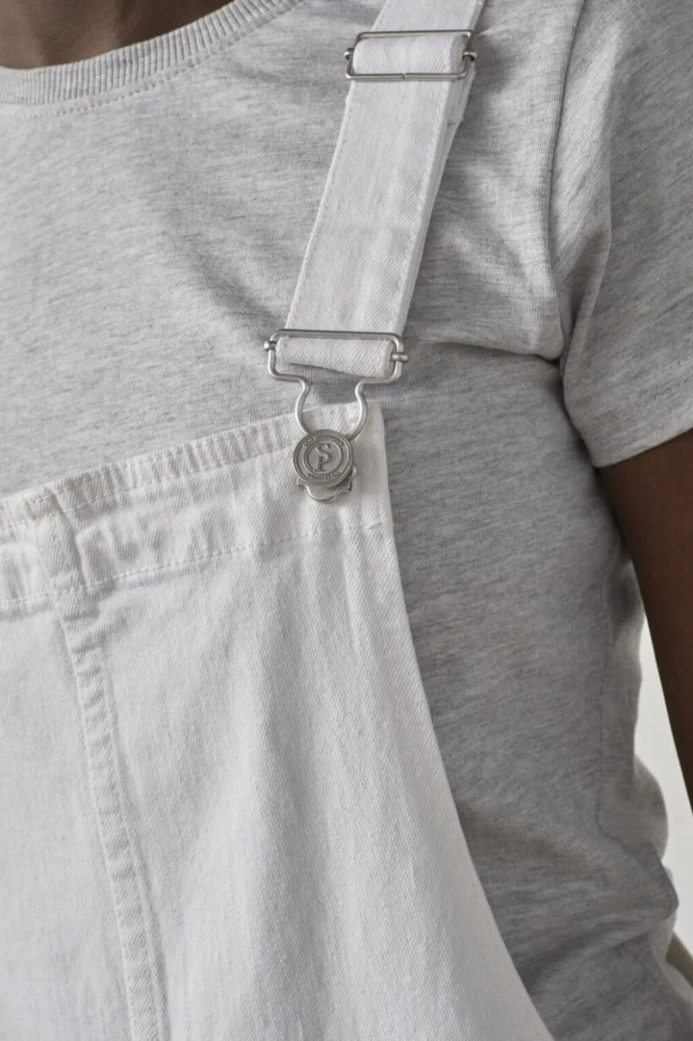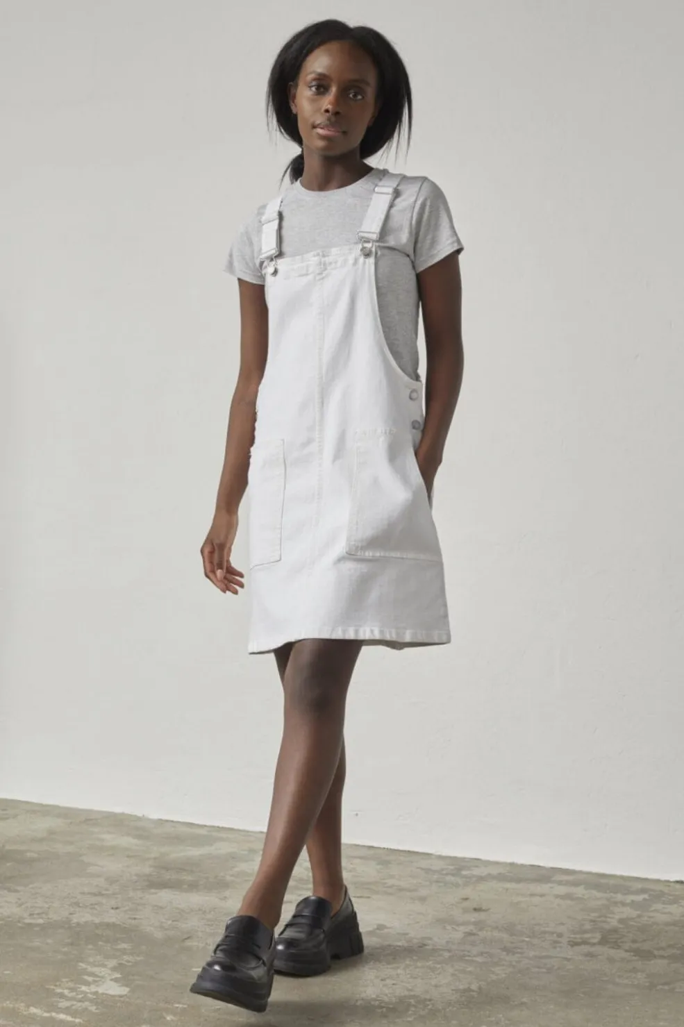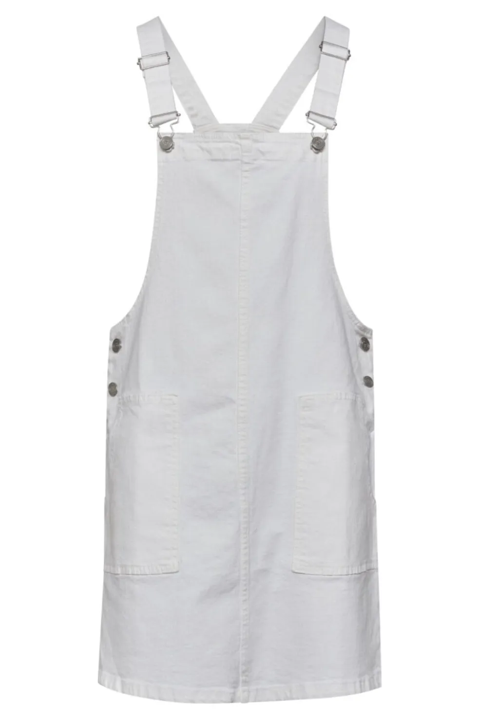 Hvid overallkjole fra Sisters Point i denim. Kjolen har frynser i bunden og store lommer foran. De justerbare stropper med metalspænder giver mulighed for at tilpasse pasformen.