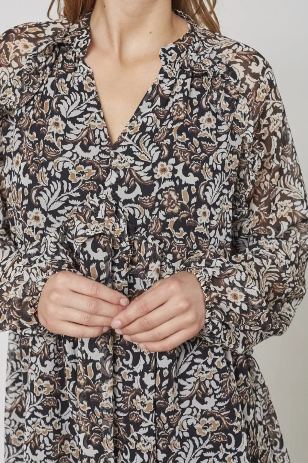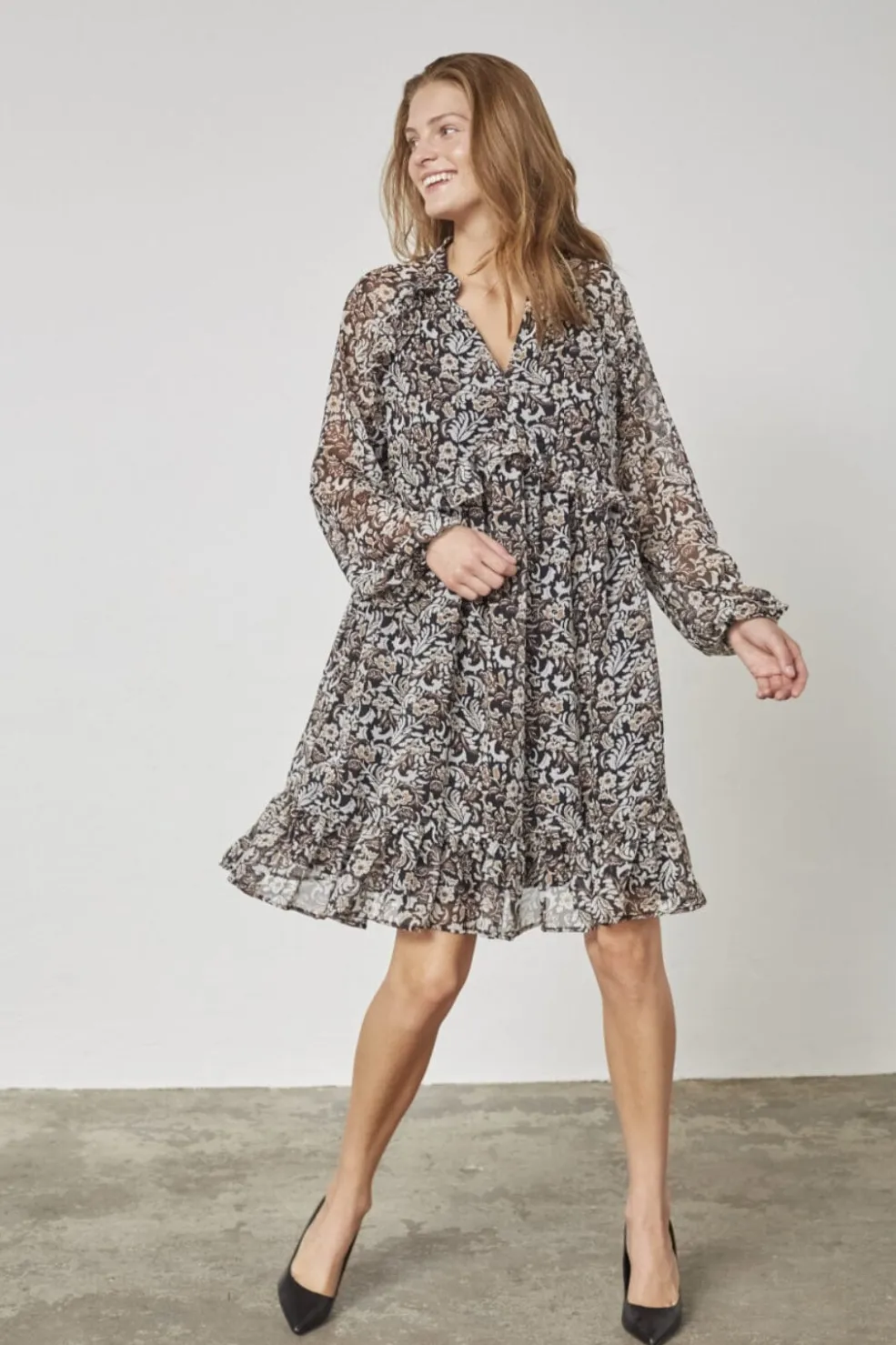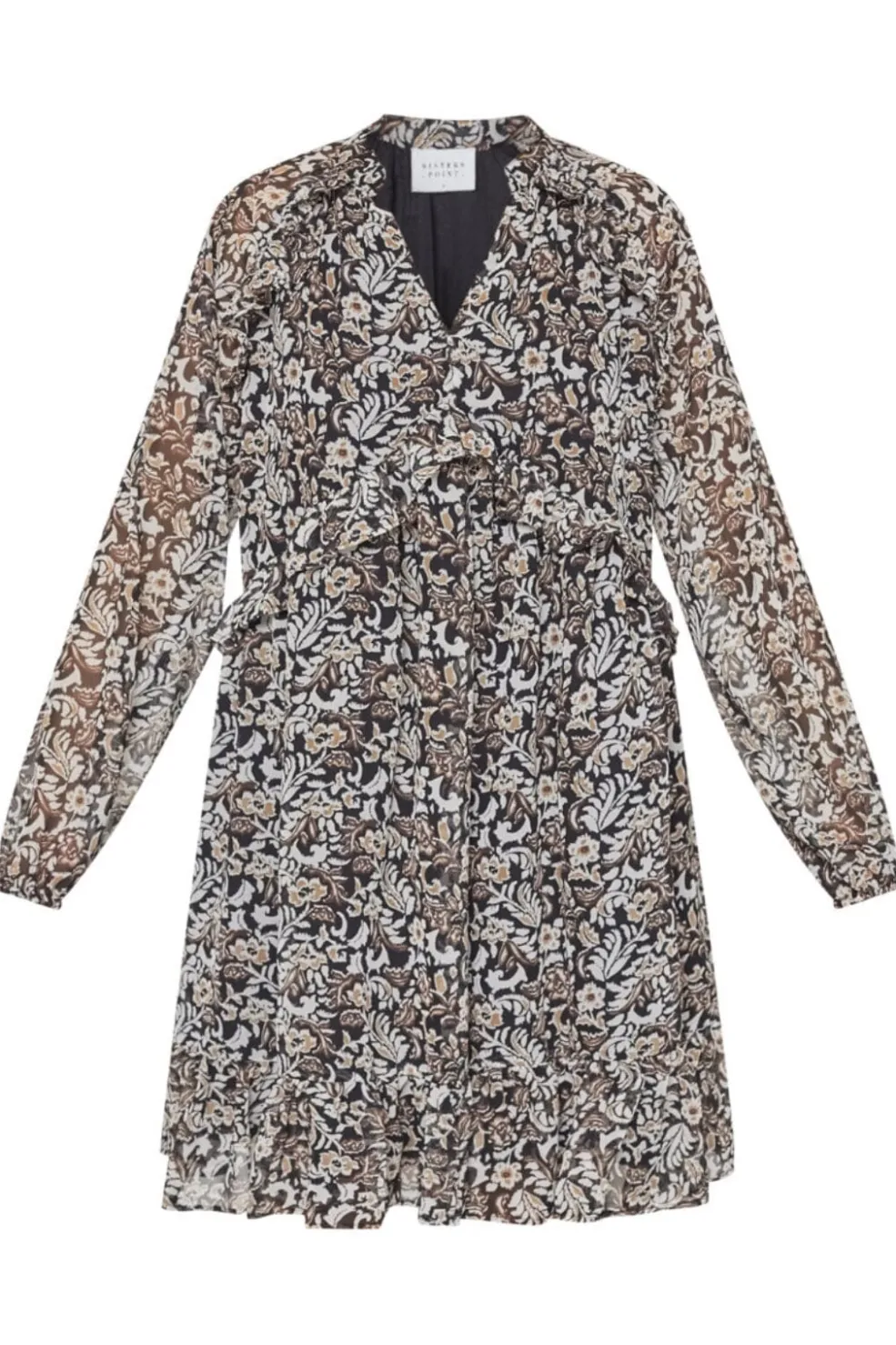 Sort kjole fra Sisters Point med paisleymønster. Kjolen har V-udskæring, lange transparente ærmer og flæsedetaljer ved halsen og forneden.
