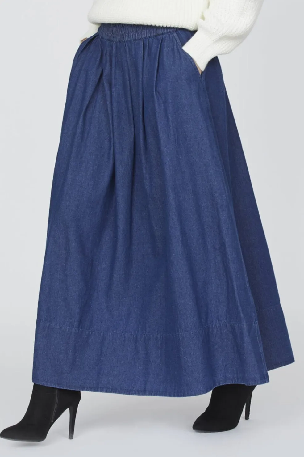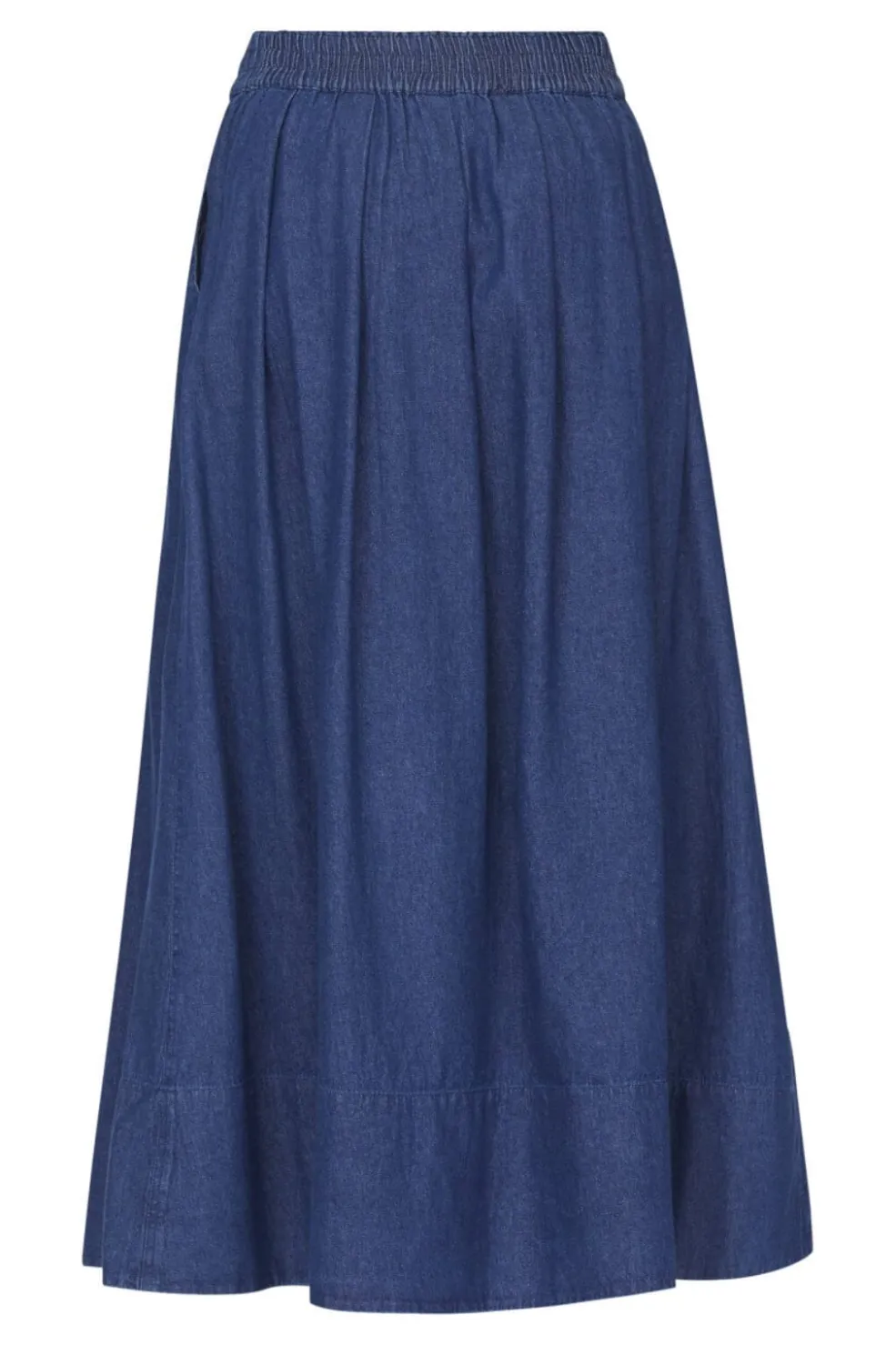 Lang denimnederdel fra Sisters Point i mørk denim. Nederdelen har en løs pasform med elastik i taljen og praktiske lommer i siden.
