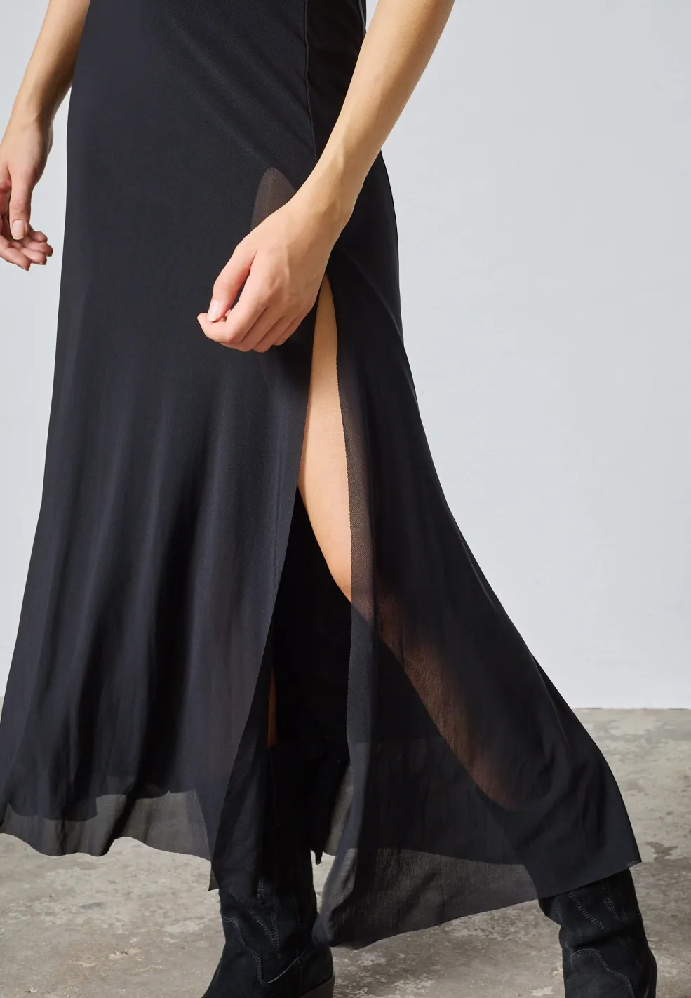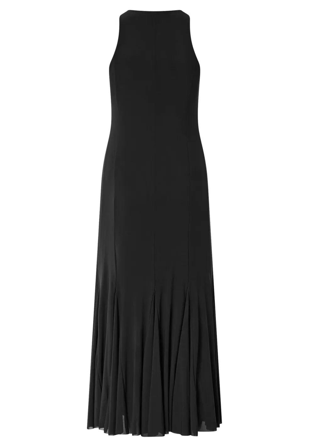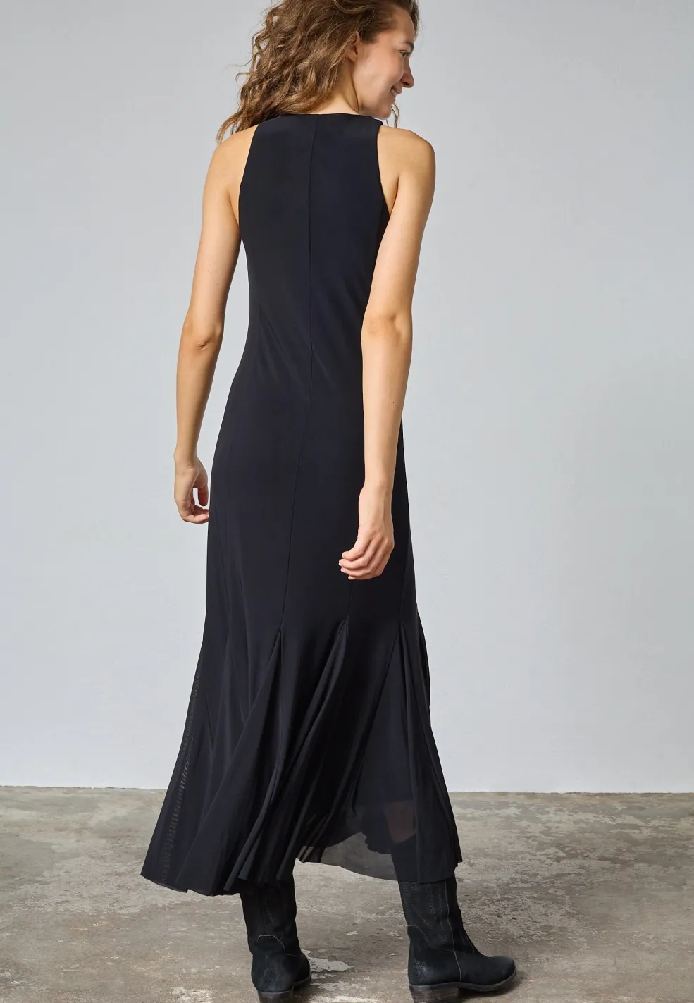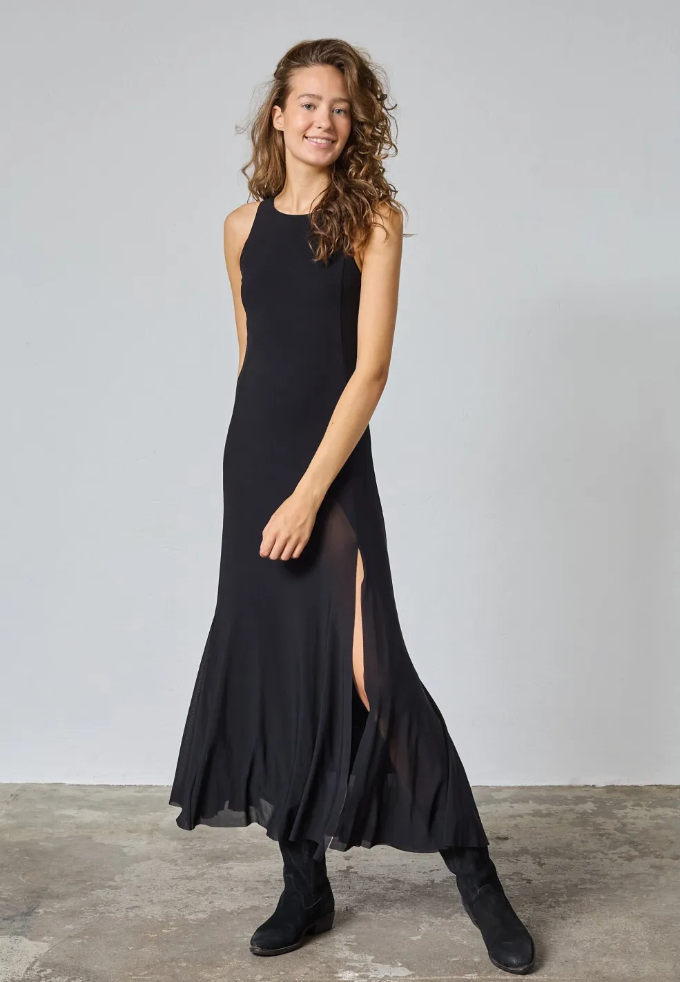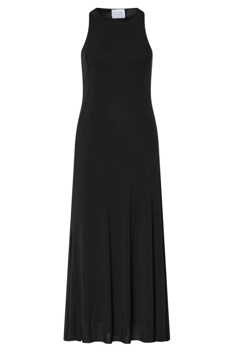 Sort, ærmeløs kjole fra Sisters Point. Den går til anklerne og har en høj halsudskæring med et løst snit forneden.