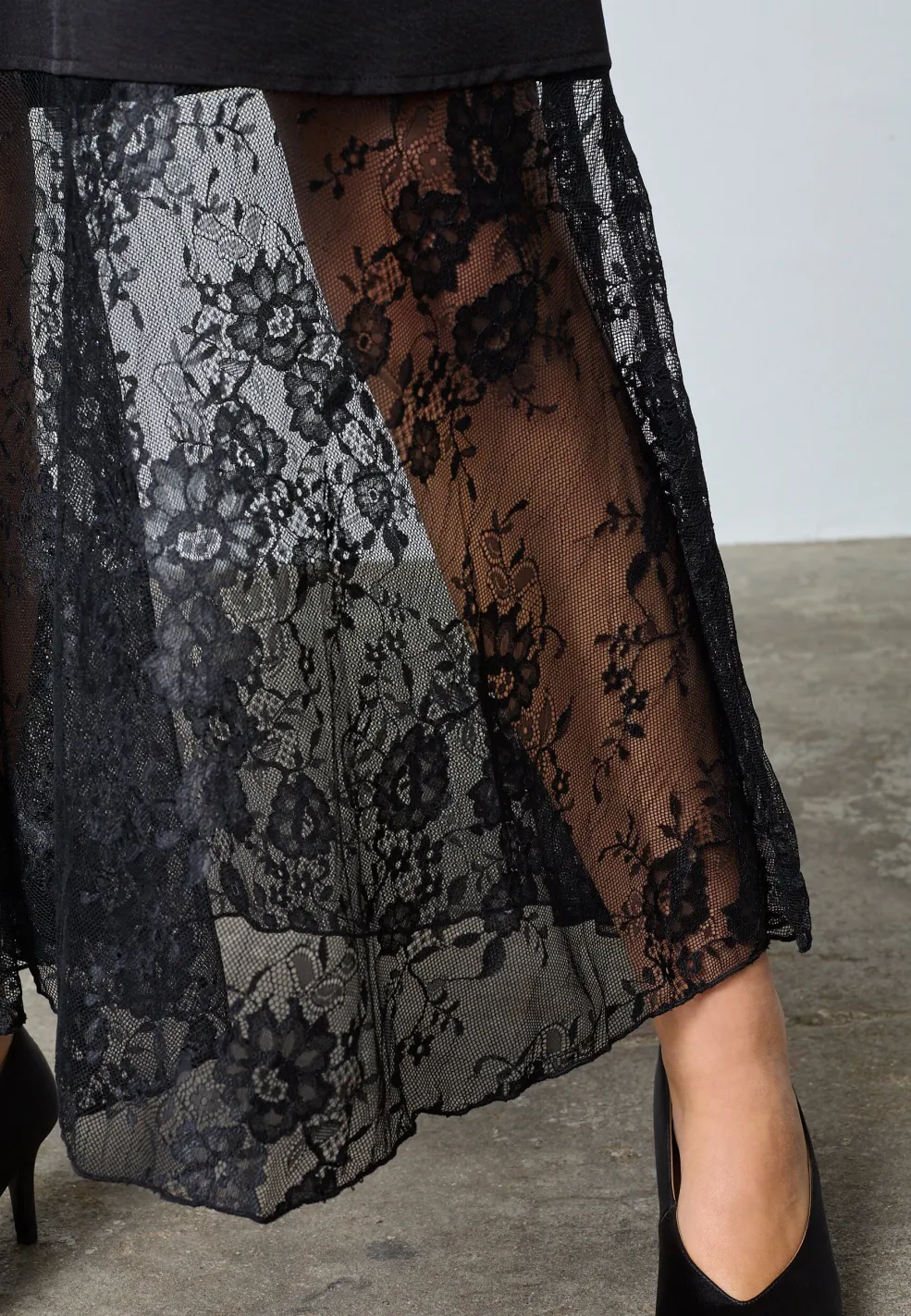 Sort ankellang kjole fra Sisters Point med høj halsudskæring. Den ærmeløse kjole har blonder i den nederste del og en løs pasform, der gør den velegnet til festlige anledninger.