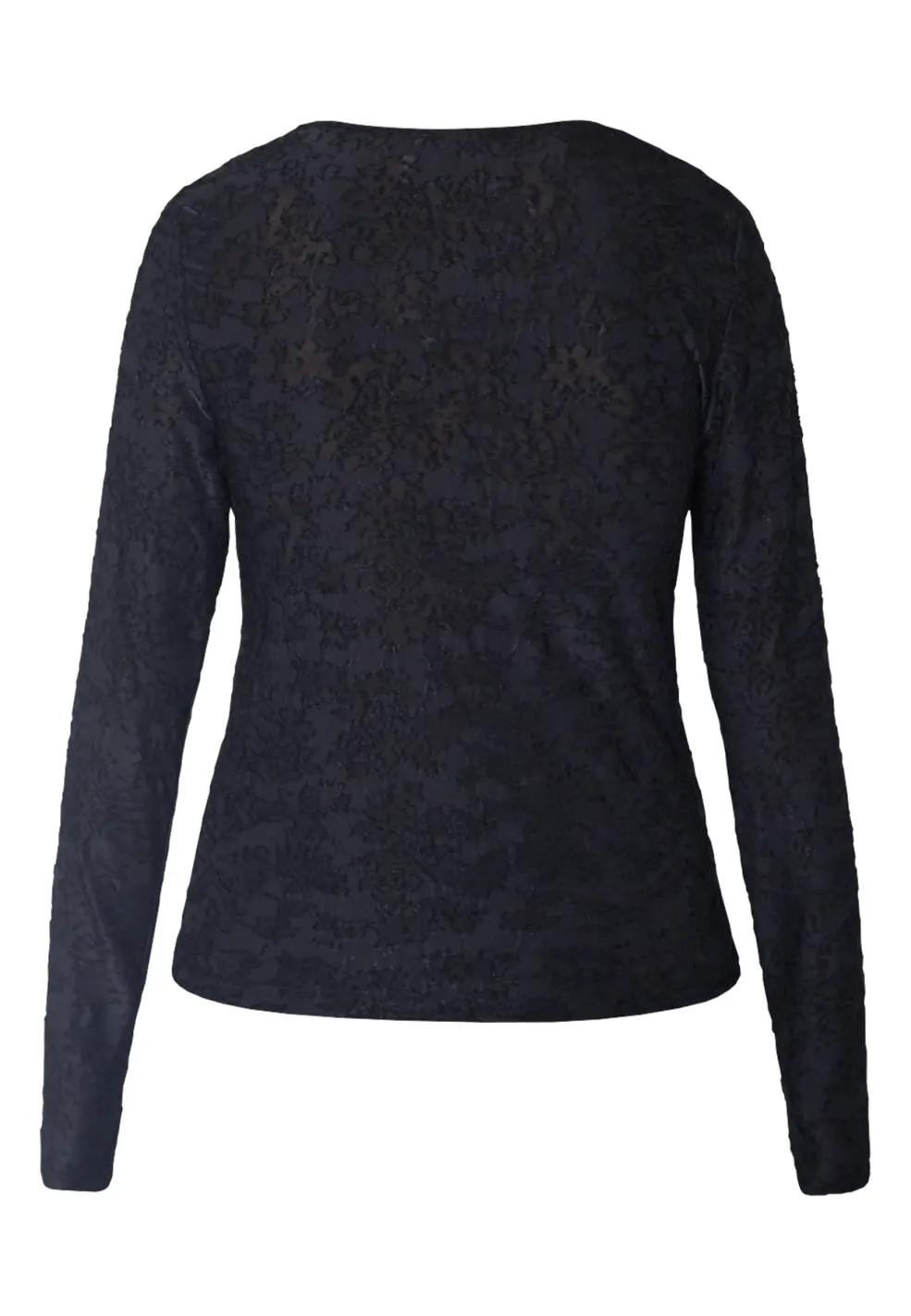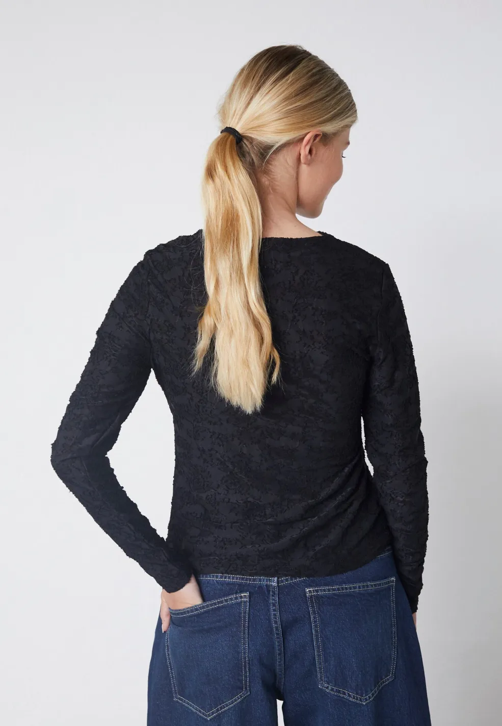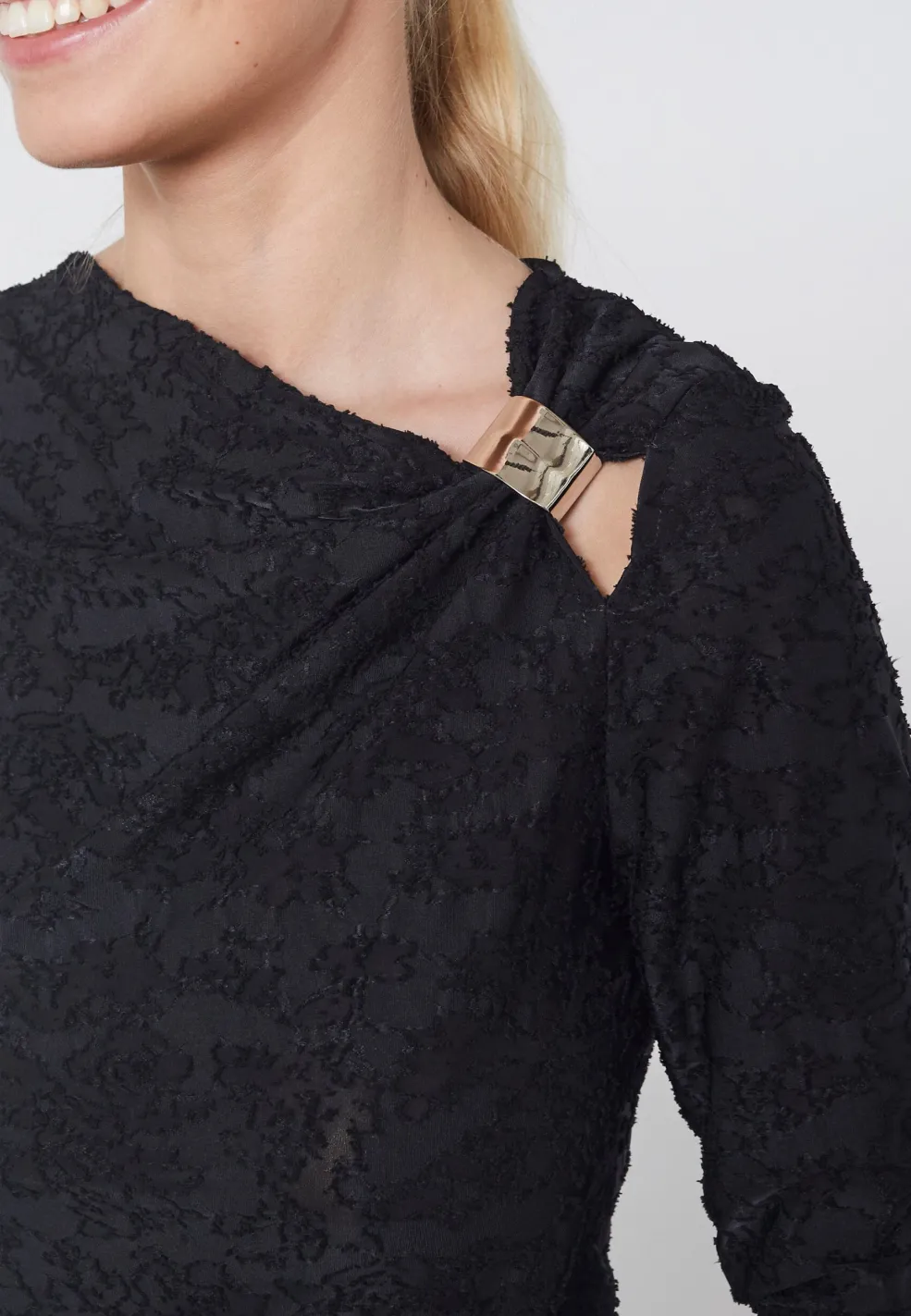 Sort langærmet top fra Sisters Point med et diskret mønster. Toppen har drapering og et dekorativt metalspænde ved halsen.