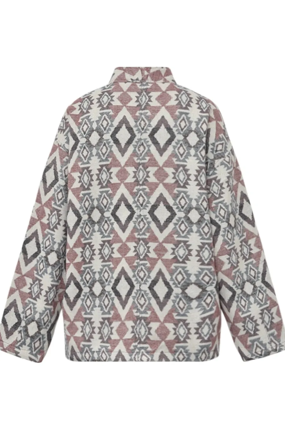 Jakke fra Gossia med geometrisk mønster i burgunder, grå og cremehvide nuancer. Den kravefrie jakke har lange ærmer og en lomme på forsiden.