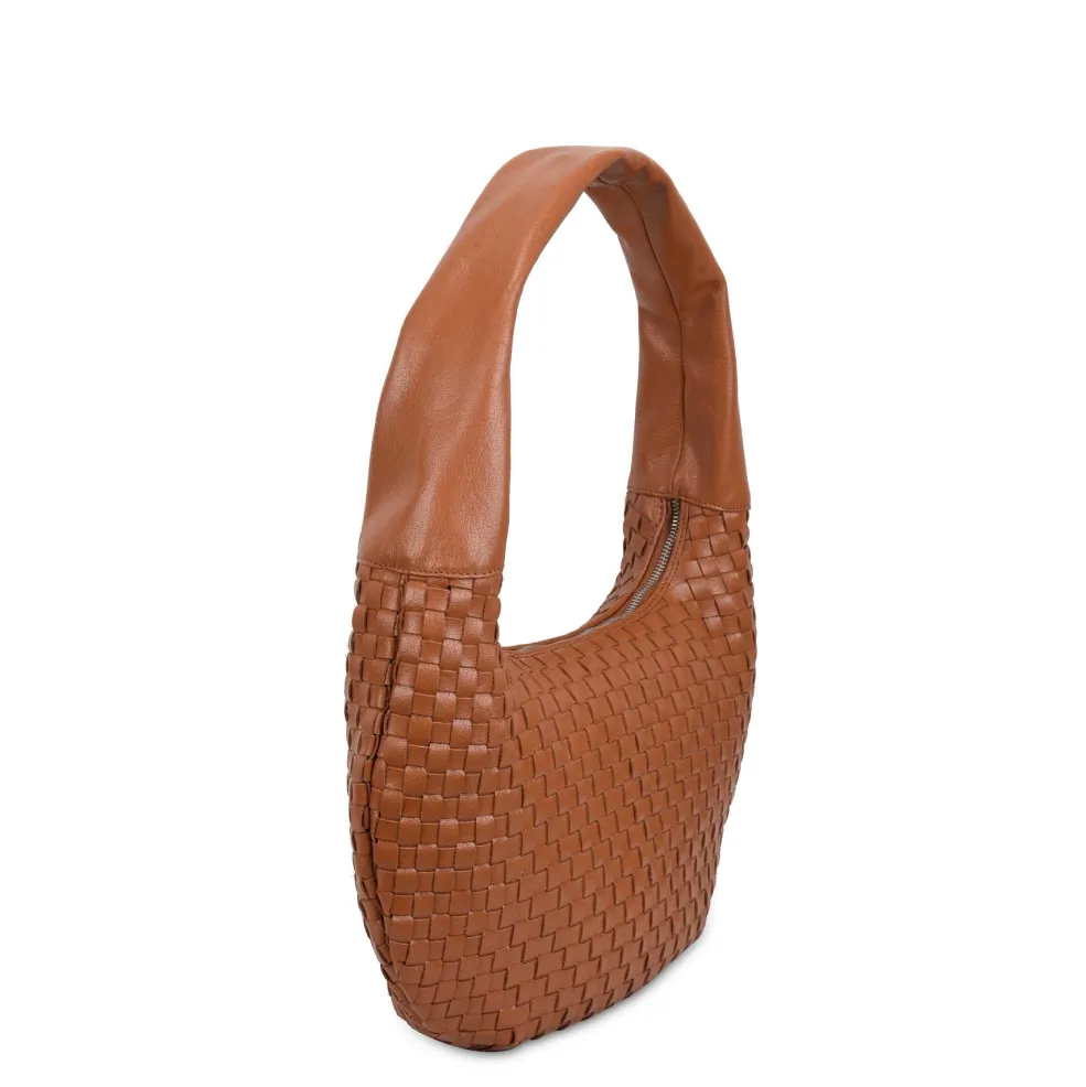 Håndtaske fra Núnoo i cognacfarvet læder med et flettet design. Tasken har en buet form og et karakteristisk mønster, der går igen over hele taskens overflade.