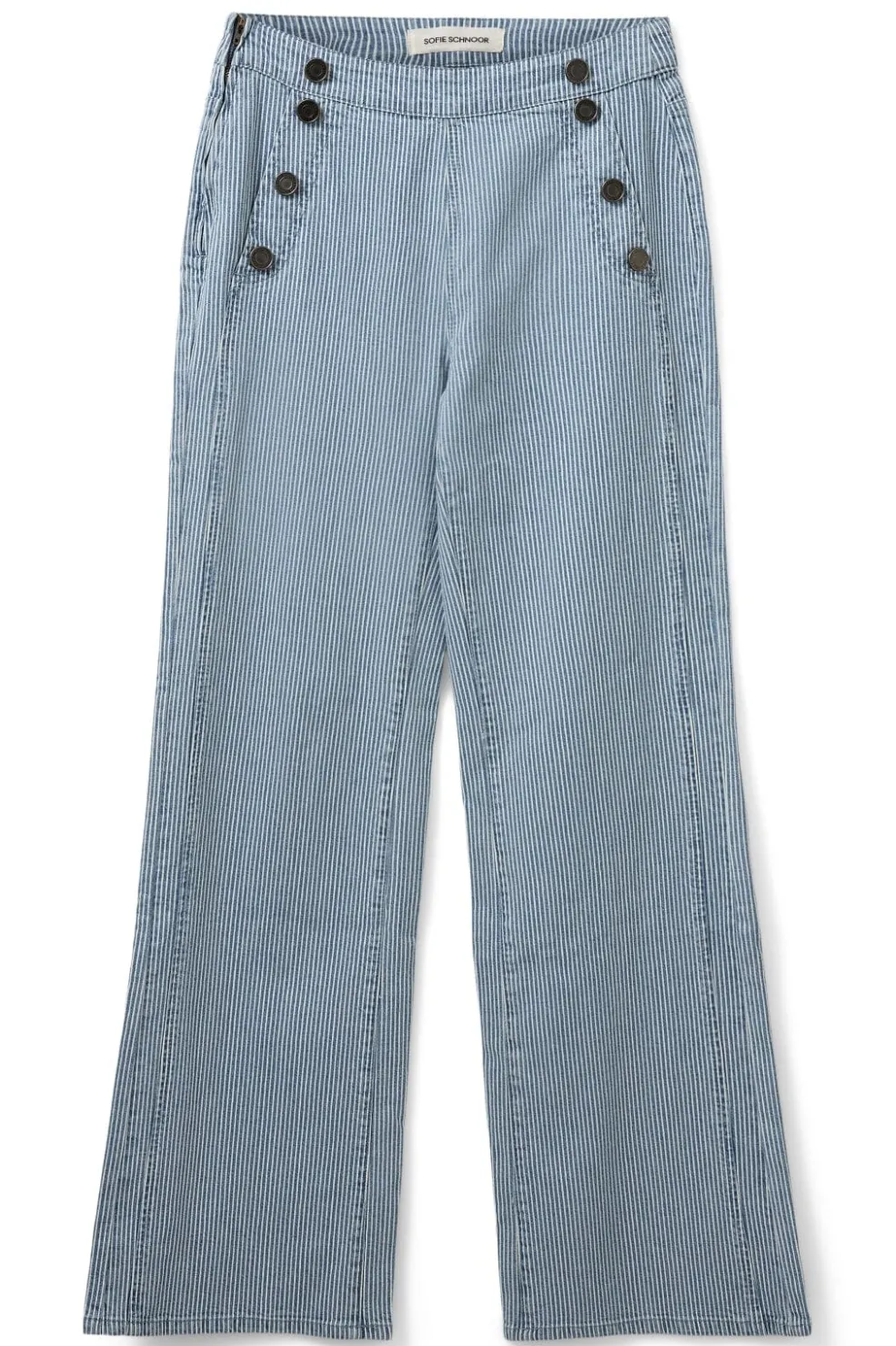 Blåstribede bukser fra Sofie Schnoor med bred benform. De vertikale striber i blå og hvid skaber et klassisk udtryk, mens knapperne foran og det broderede kirsebærdesign på baglommen giver bukserne karakter.