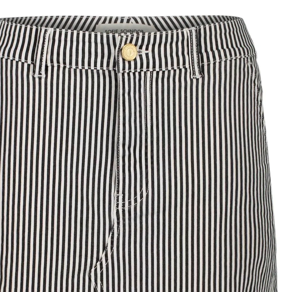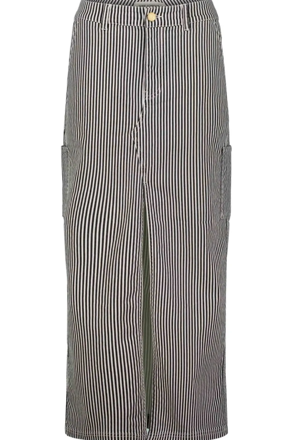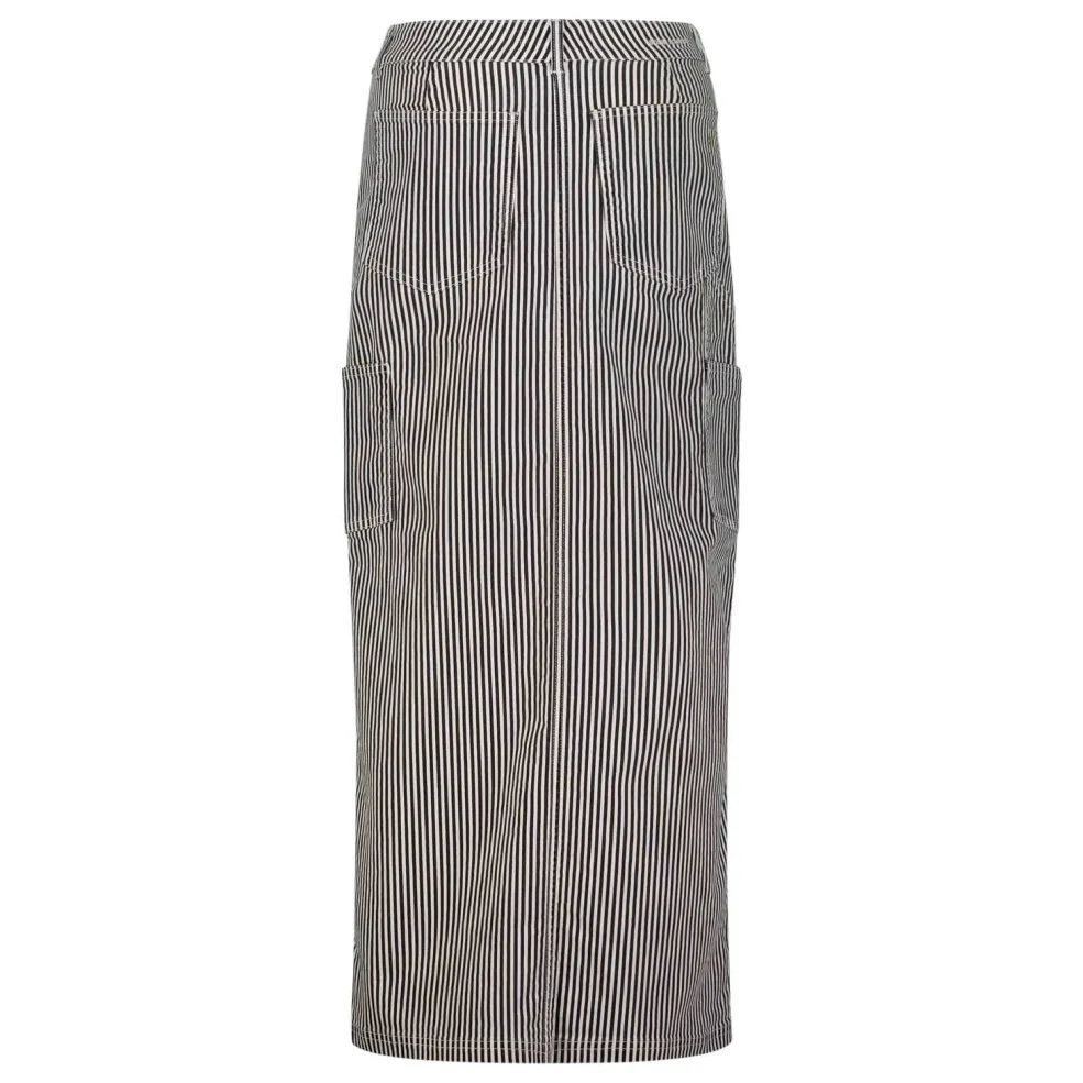 Sort og hvidstribet nederdel fra Sofie Schnoor med vertikale striber. Nederdelen har sidelommer, dekorative syninger samt en frontslids.
